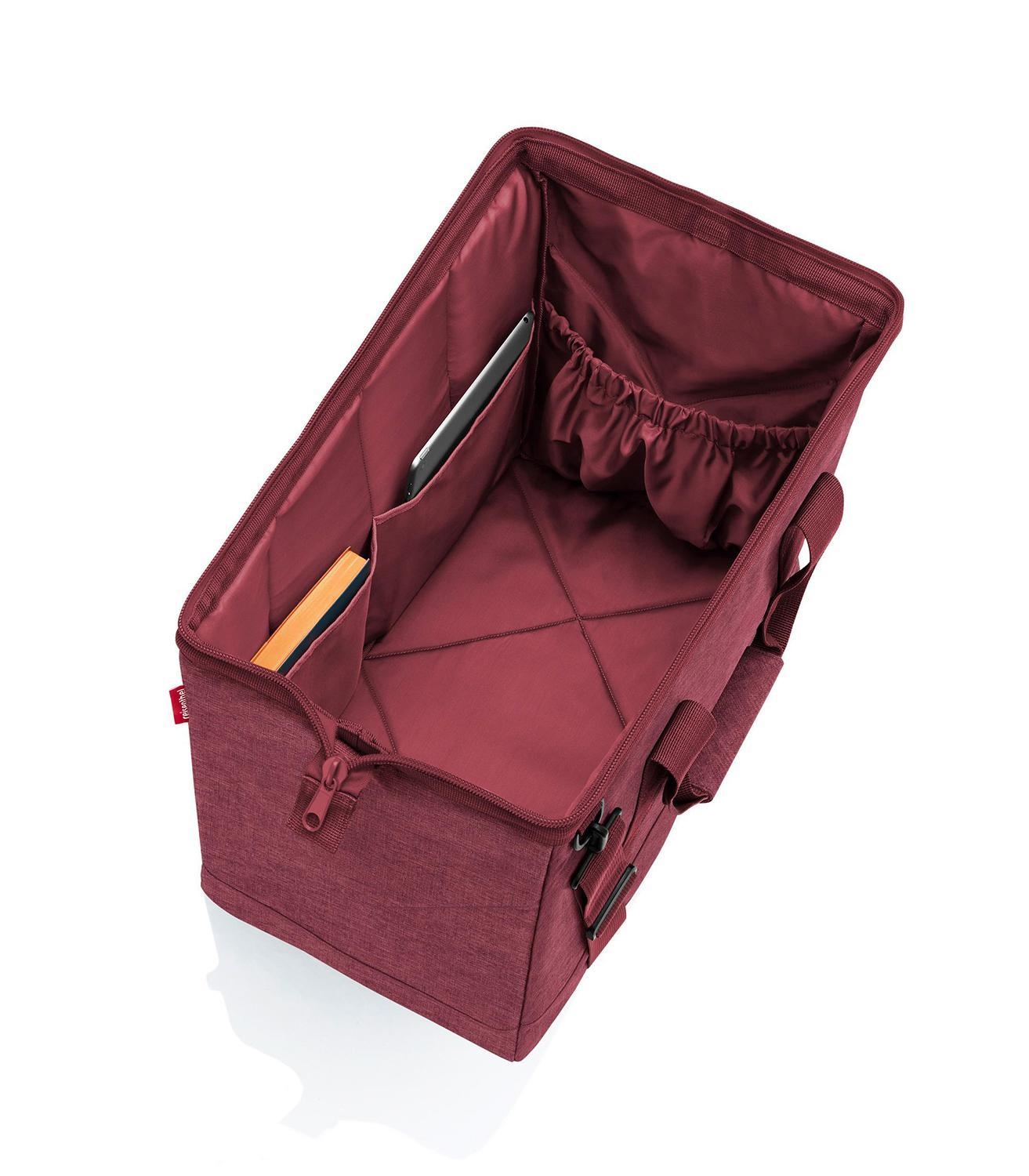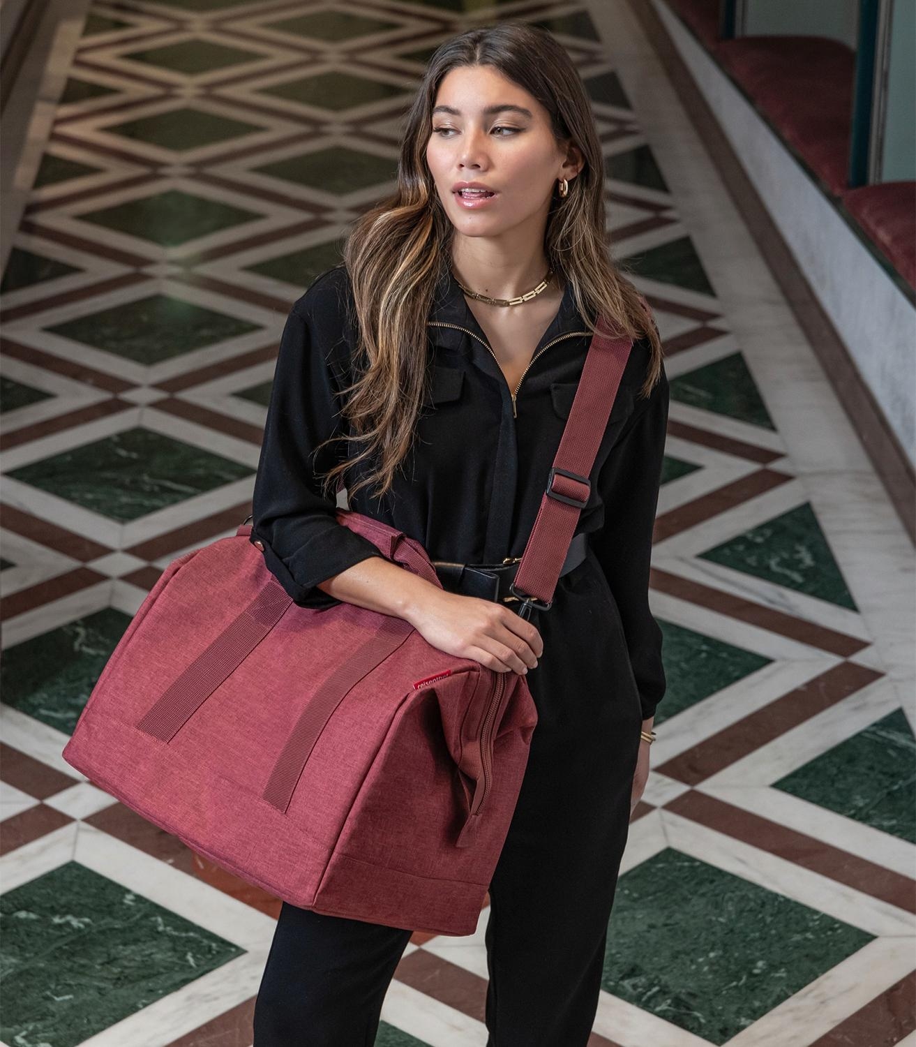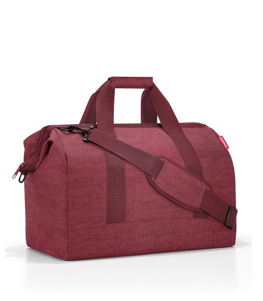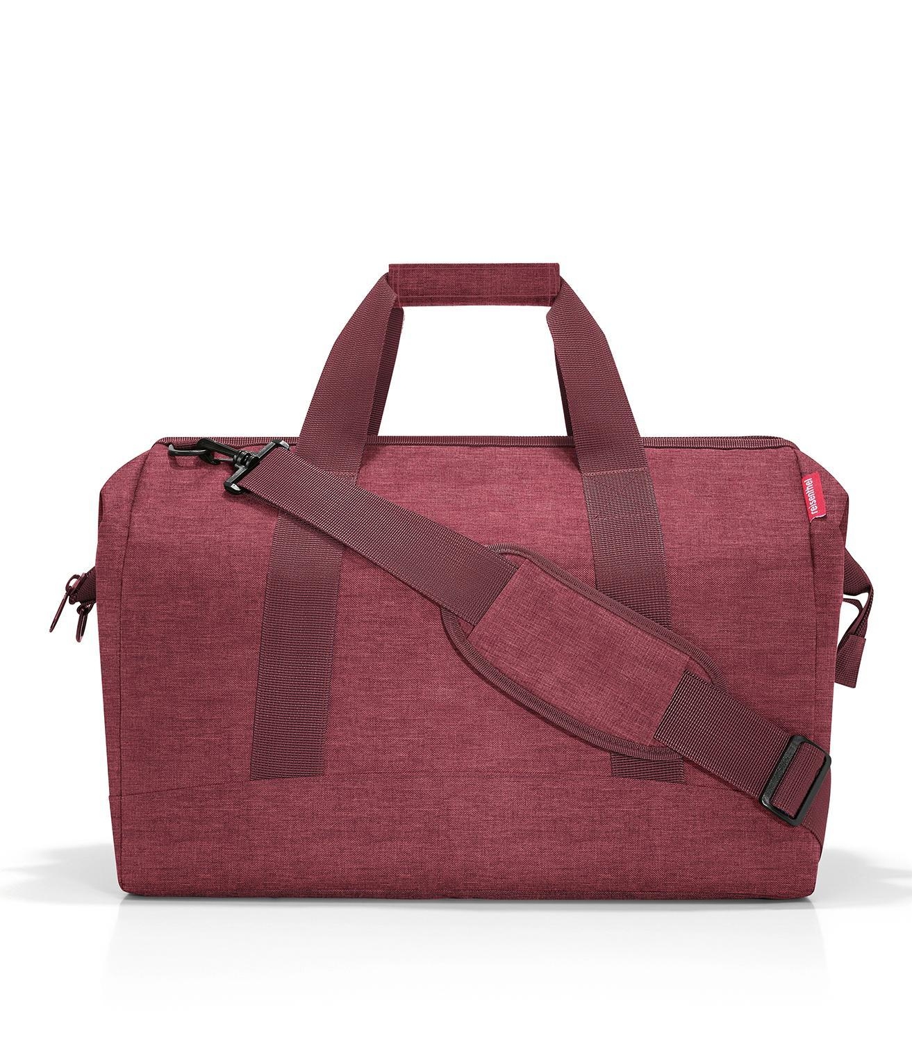 Die Reisetasche ALLROUNDER L TWIST MAROON von Reisenthel in Rot ist aus Polyestergewebe gefertigt und bietet ein Volumen von 30 Litern. Sie hat einen abnehmbaren Schultergurt und 2 vernähte Tragegriffe, sowie gepolsterte Seitenwände und Boden. Im Inneren gibt es 6 Steckfächer und die Öffnung ist mit einem eingearbeiteten Metallbügel versehen. Das hochwertige Polyestergewebe ist wasserabweisend. Die Tasche hat eine komfortabel gepolsterte Schulterauflage und 2 Tragehenkel mit Griffpolster.