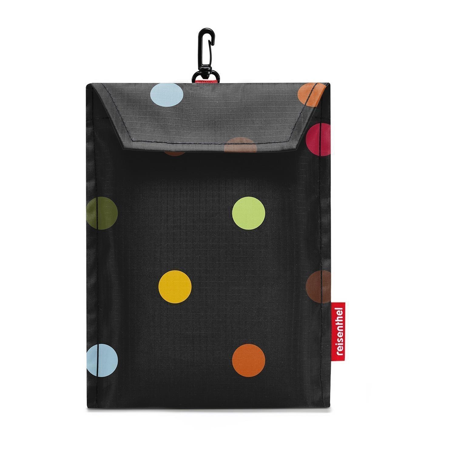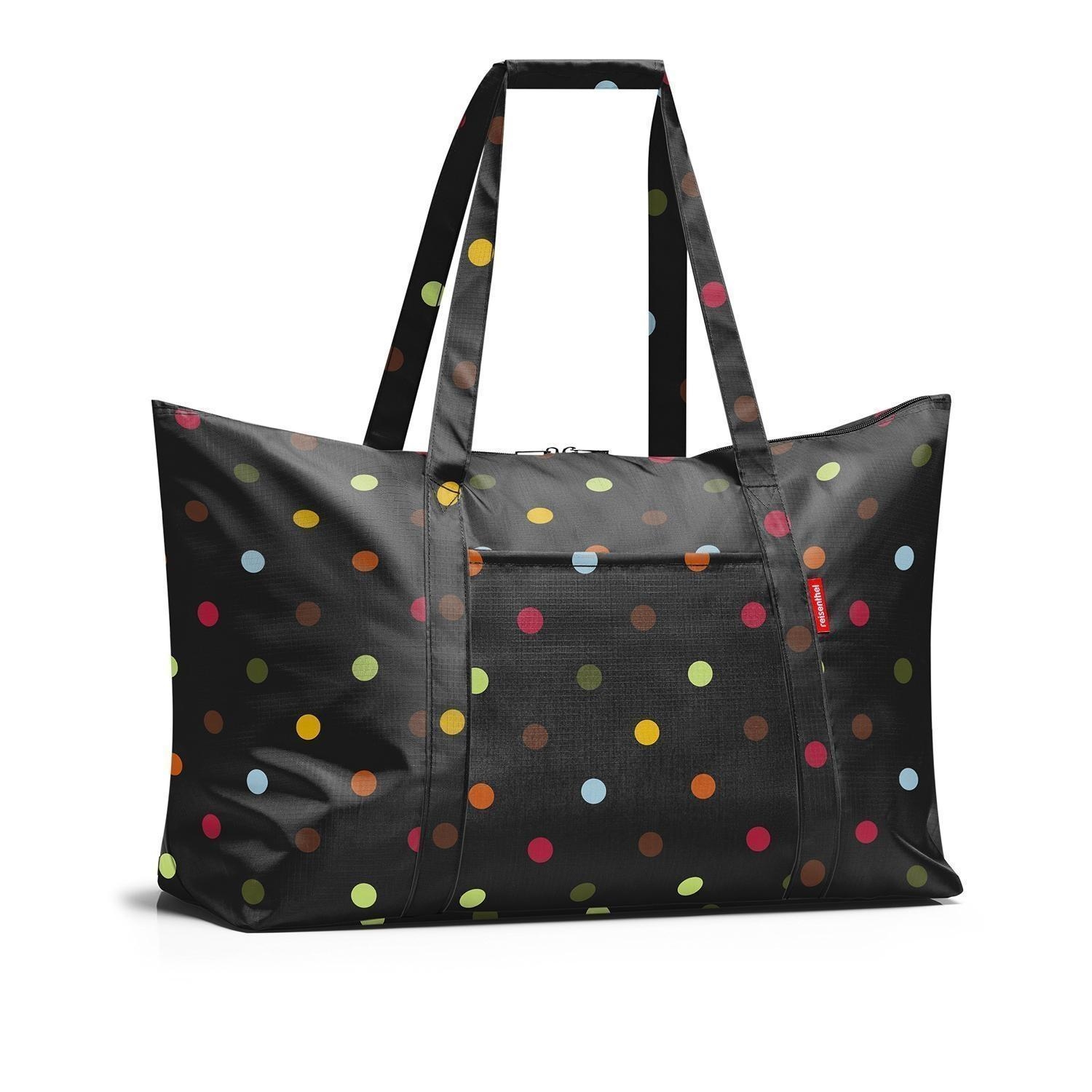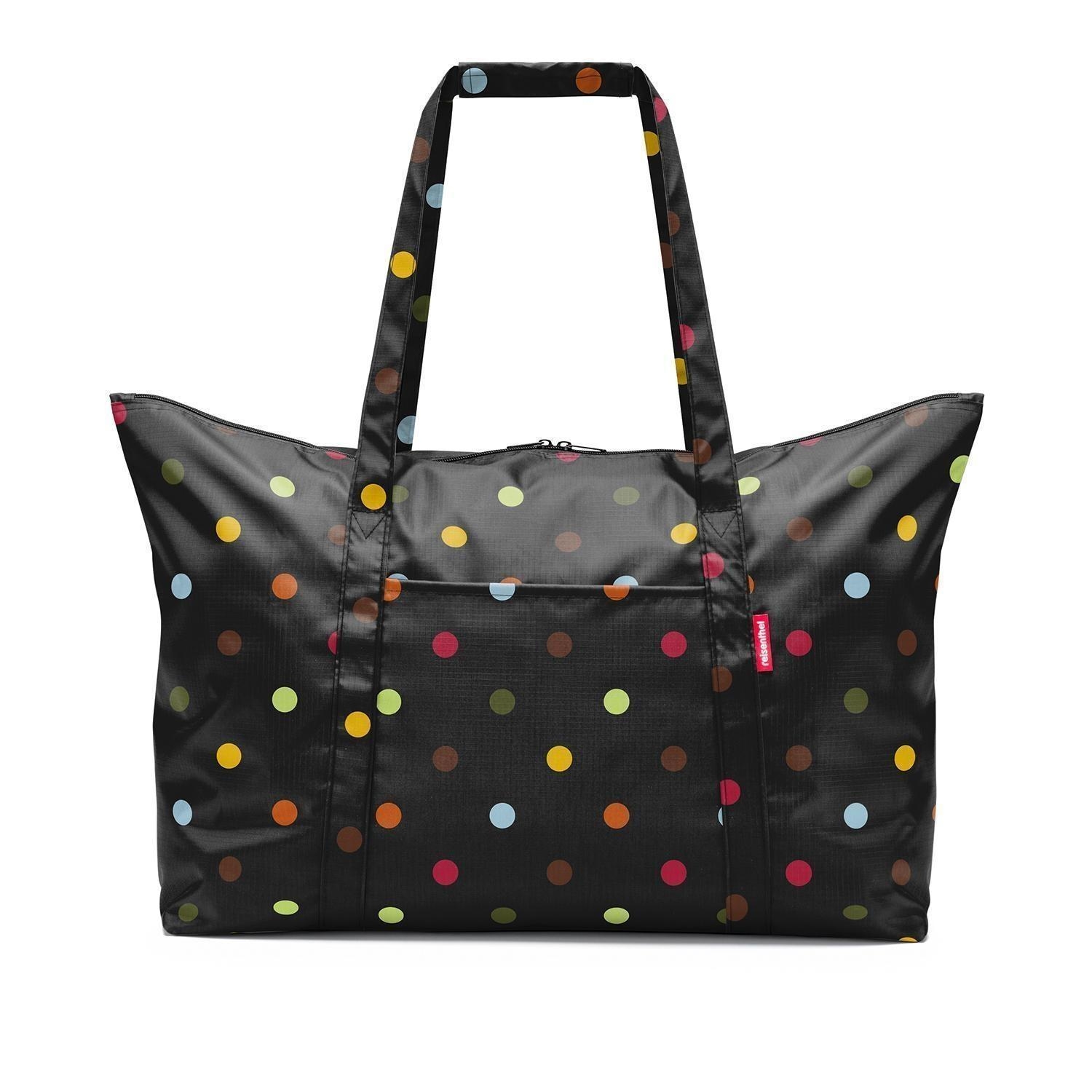 Die Reisetasche MINI MAXI TRAVELBAG DOTS der Marke Reisenthel ist aus wasserabweisendem, recyceltem Polyestergewebe gefertigt und in der Farbe Schwarz ausgeführt und mit mehrfarbigen Punkten gemustert. Sie verfügt über ein Fassungsvermögen von 30 Litern. Zwei vernähte Tragegriffe mit Klettgriff ermöglichen den Transport. An der Außenseite befindet sich ein Steckfach. Die Tasche ist mit einer Extratasche ausgestattet, die ein platzsparendes Verstauen ermöglicht. Diese verfügt über einen Karabinerverschluss. Die Maße der Reisetasche betragen 65 Zentimeter in der Breite, 41 Zentimeter in der Höhe und 26 Zentimeter in der Tiefe.