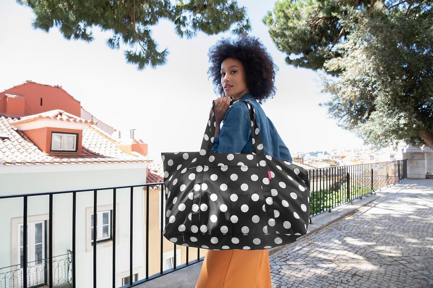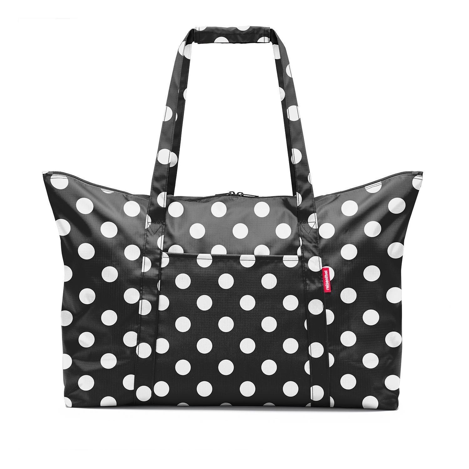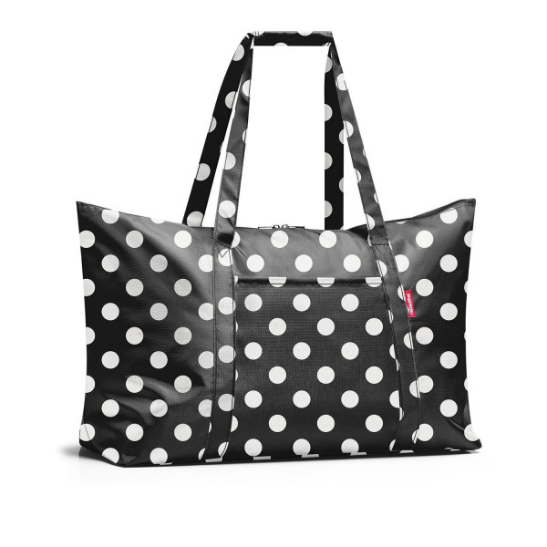 Die Reisetasche MINI MAXI TRAVELBAG DOTS WHITE der Marke Reisenthel ist aus wasserabweisendem, recyceltem Polyestergewebe gefertigt und in der Farbe Schwarz ausgeführt und mit weißen Punkten gemustert. Sie verfügt über ein Fassungsvermögen von 30 Litern. Zwei vernähte Tragegriffe mit Klettgriff ermöglichen den Transport. An der Außenseite befindet sich ein Steckfach. Die Tasche ist mit einer Extratasche ausgestattet, die ein platzsparendes Verstauen ermöglicht. Diese verfügt über einen Karabinerverschluss. Die Maße der Reisetasche betragen 65 Zentimeter in der Breite, 41 Zentimeter in der Höhe und 26 Zentimeter in der Tiefe.