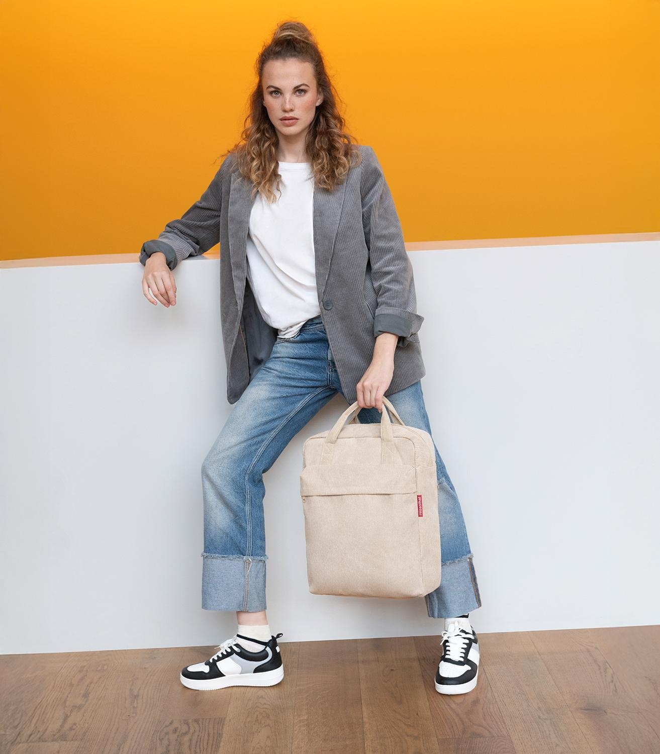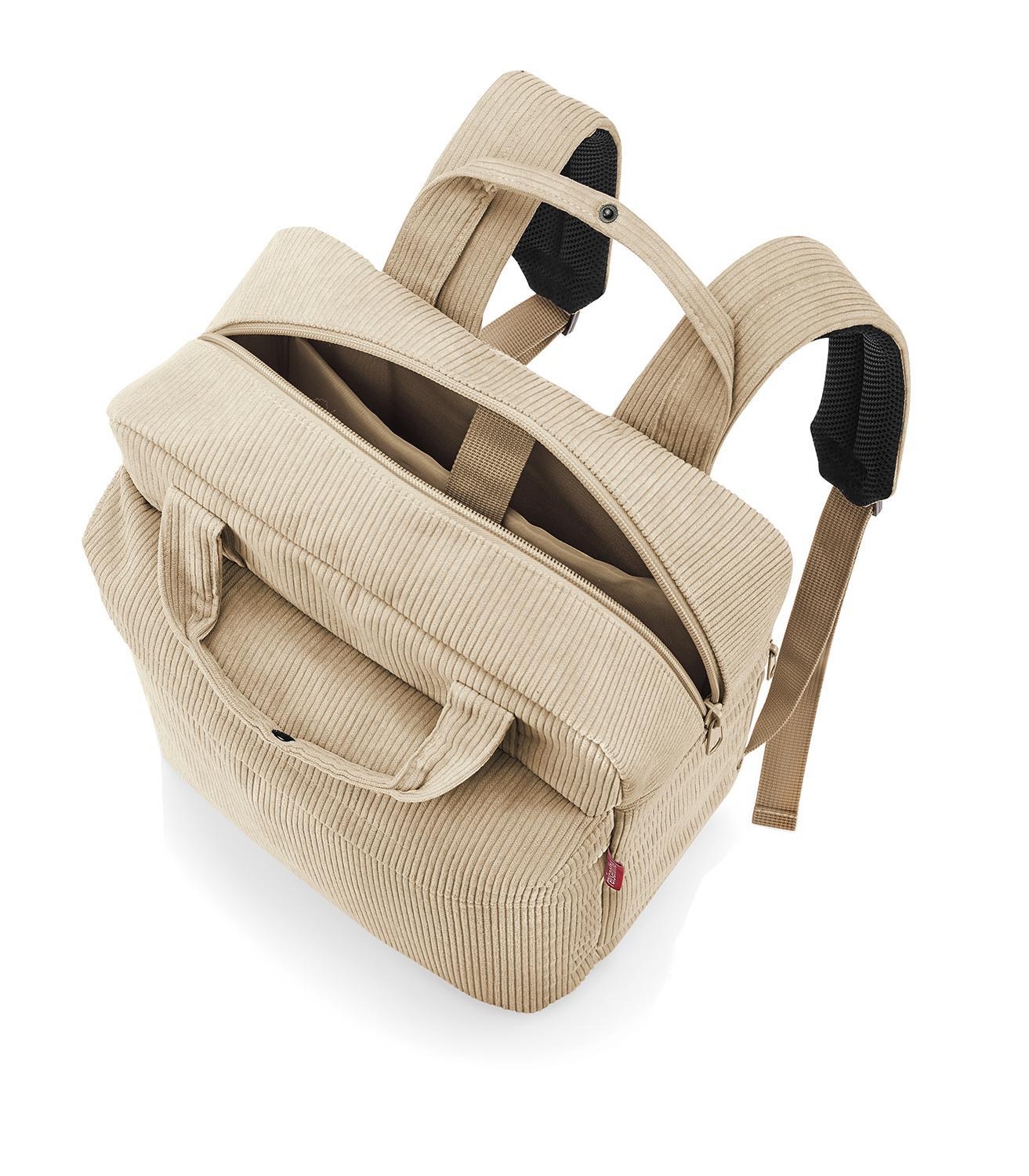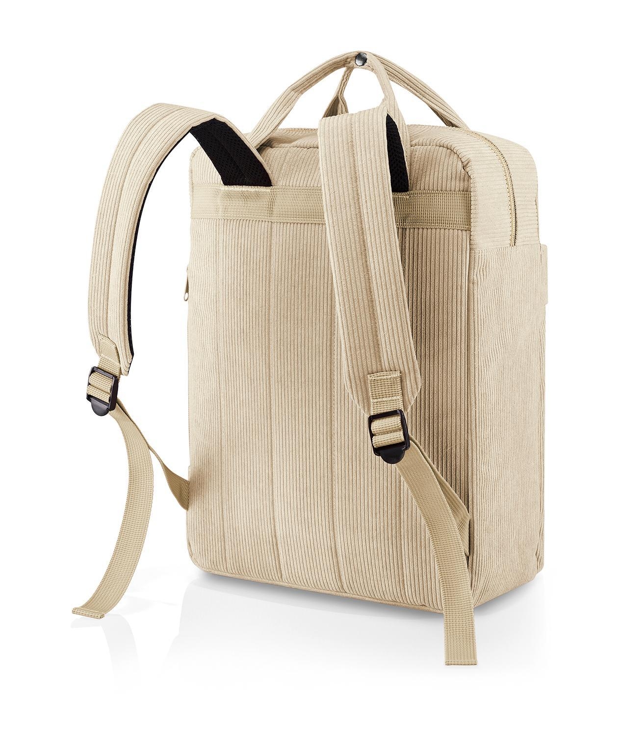 Der Reisenthel ALLDAY BACKPACK M CORD Rucksack mit Cordoptik in Sandfarben bietet 15 Liter Fassungsvermögen und hat Maße von 29 x 48 x 28 cm. Er entspricht den Handgepäckmaßen im Flugzeug, hat ein geräumiges Hauptfach mit 2-Wege-Reißverschluss und ein Laptopfach (15,6 Zoll). Innen gibt es ein Reißverschlussfach für Wertsachen und außen 2 weitere Reißverschlussfächer. Der Rucksack hat 2 Tragegriffe und verstellbare, gepolsterte Schultergurte für Komfort. Das Obermaterial besteht aus Polyester und 50% recyceltem PET-Flaschenmaterial und ist wasserabweisend.
