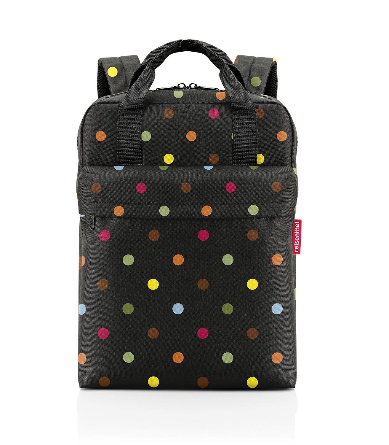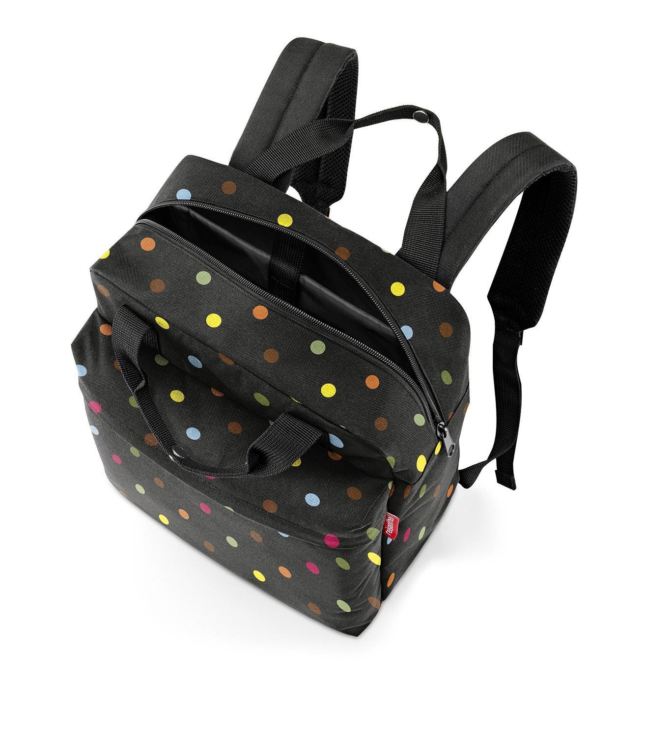 Der Reisenthel ALLDAY BACKPACK M DOTS Rucksack in Schwarz mit mehrfarbigen Punkten bietet 15 Liter Fassungsvermögen und hat Maße von 29 x 48 x 28 cm. Er entspricht den Handgepäckmaßen im Flugzeug, hat ein geräumiges Hauptfach mit 2-Wege-Reißverschluss und ein Laptopfach (15,6 Zoll). Innen gibt es ein Reißverschlussfach für Wertsachen und außen 2 weitere Reißverschlussfächer. Der Rucksack hat 2 Tragegriffe und verstellbare, gepolsterte Schultergurte für Komfort. Das Obermaterial besteht aus Polyester und 50% recyceltem PET-Flaschenmaterial und ist wasserabweisend.