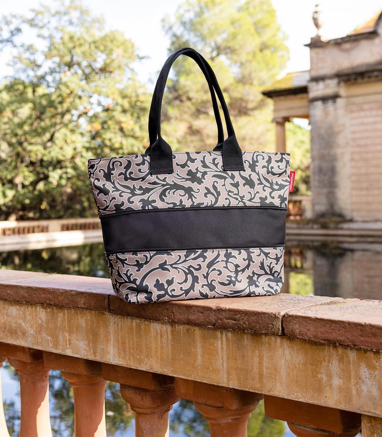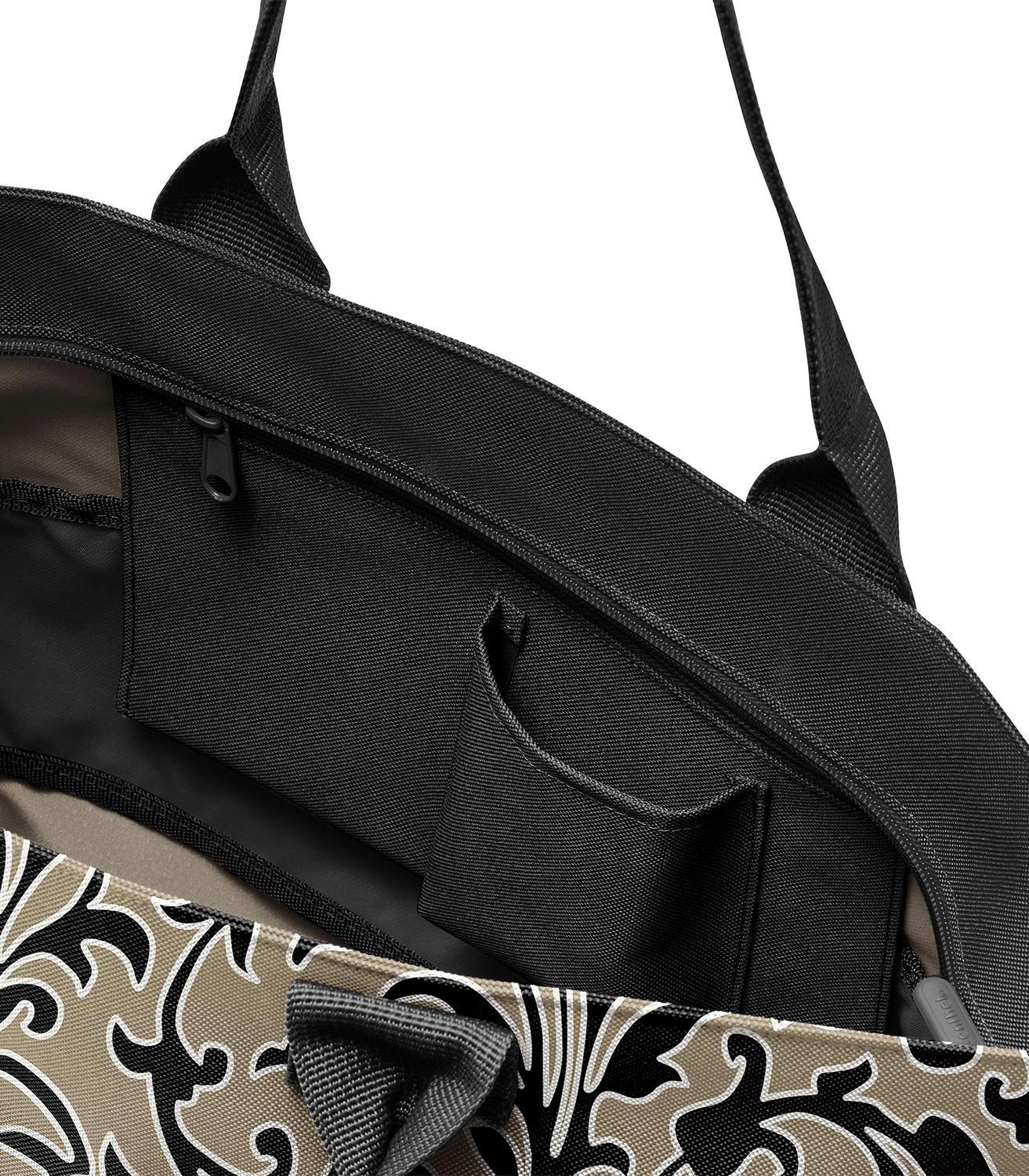Die wasserabweisende Tragetasche SHOPPER e1 BAROQUE MARBLE von Reisenthel bietet flexibles Volumen dank seitlichem Reißverschluss, von 12 bis 18 Litern. Hergestellt aus Polyestergewebe in Braun und Schwarz, hat sie ein inneres Fach mit Reißverschluss, ein Steckfach und zwei vernähte Tragegriffe. Geschlossen beträgt die Größe 50x26x16 cm mit 12 Litern Fassungsvermögen, offen 50x35x16 cm mit 18 Litern Fassungsvermögen. Ideal für vielseitige Anwendungen.