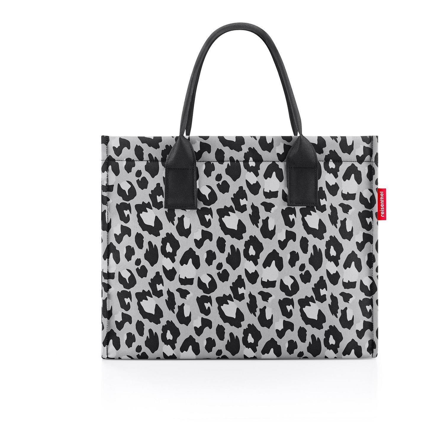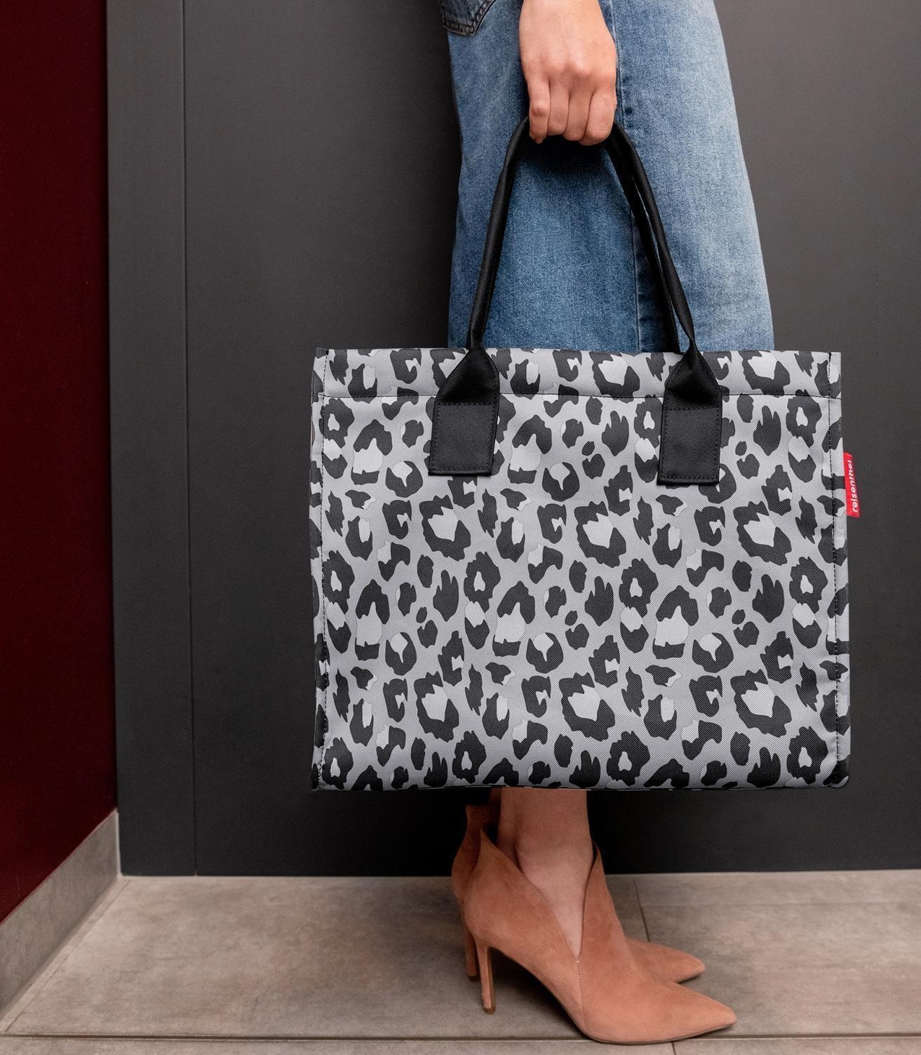Die Tragetasche DAILY SHOPPER LEO NERO von Reisenthel besteht aus recyceltem Polyester in Grau, Schwarz und Weiß. Sie verfügt über ein Hauptfach mit Metalldruckknopf, ein Innenfach mit Reißverschluss und ein Steckfach. Zwei vernähte, leicht gepolsterte Tragegriffe sorgen für Komfort. Der verstärkte Boden mit Kunststoffplatte bietet Stabilität. Die wasserabweisende Tasche hat ein Fassungsvermögen von 24 Litern und misst 42 cm in der Breite, 35 cm in der Höhe und 17 cm in der Tiefe.