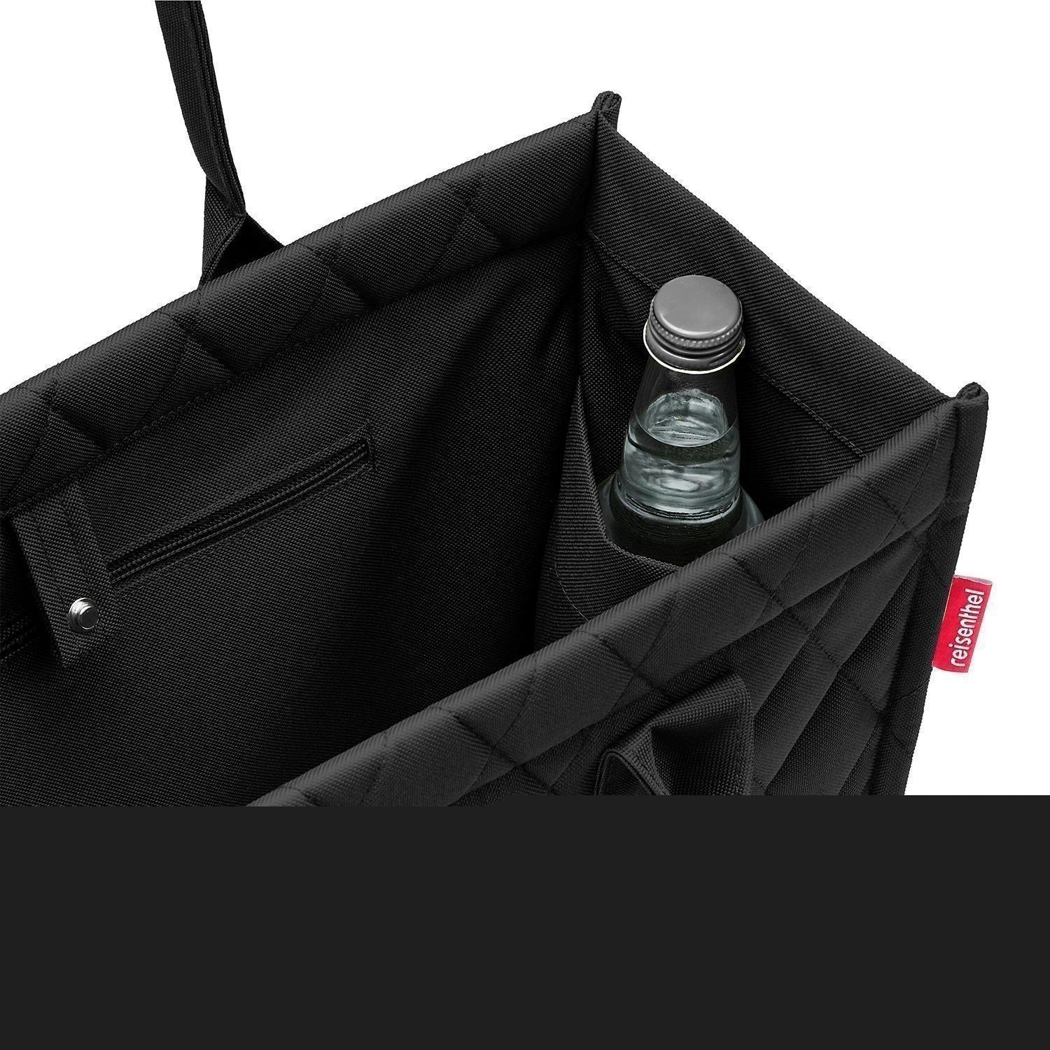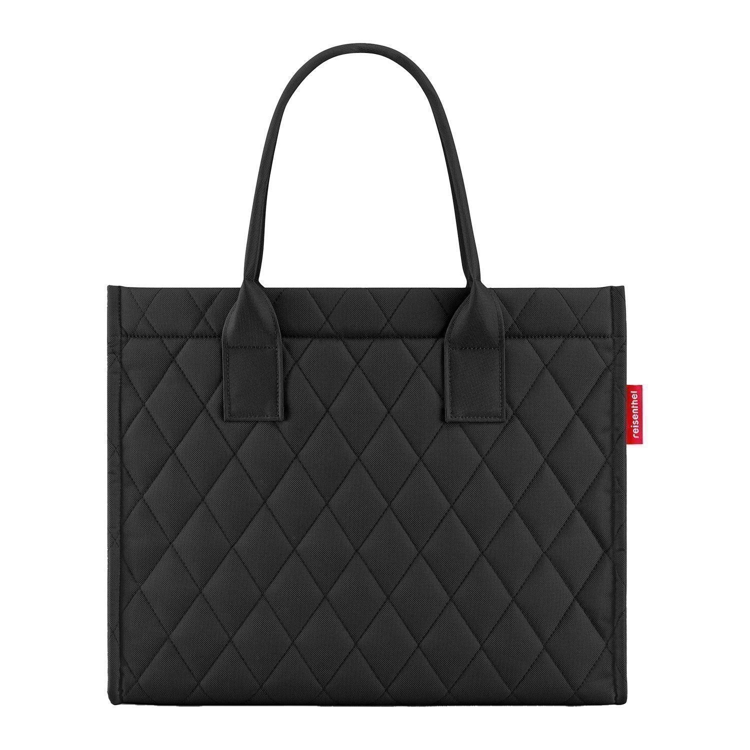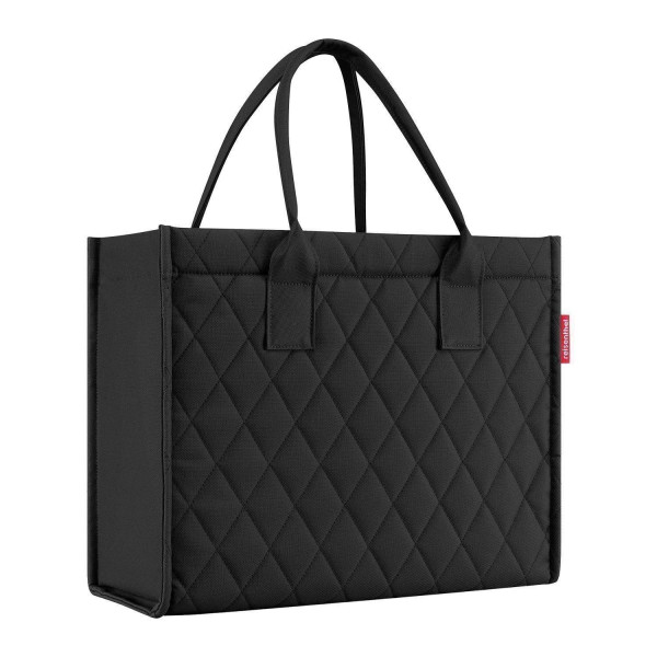 Die Tragetasche DAILY SHOPPER RHOMBUS BLACK von Reisenthel besteht aus recyceltem Polyester in Schwarz. Sie verfügt über ein Hauptfach mit Metalldruckknopf, ein Innenfach mit Reißverschluss und ein Steckfach. Zwei vernähte, leicht gepolsterte Tragegriffe sorgen für Komfort. Der verstärkte Boden mit Kunststoffplatte bietet Stabilität. Die wasserabweisende Tasche hat ein Fassungsvermögen von 24 Litern und misst 42 cm in der Breite, 35 cm in der Höhe und 17 cm in der Tiefe.