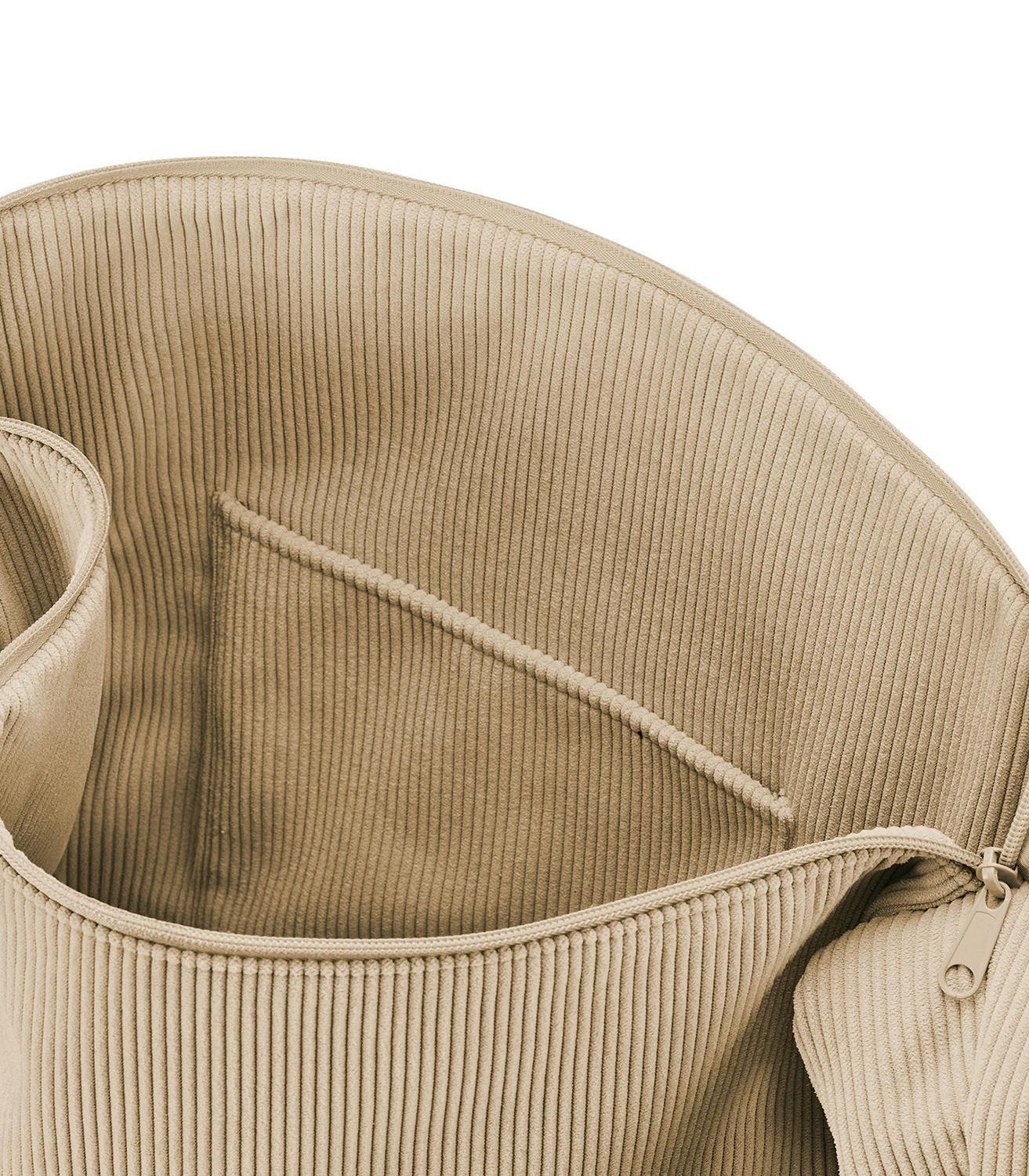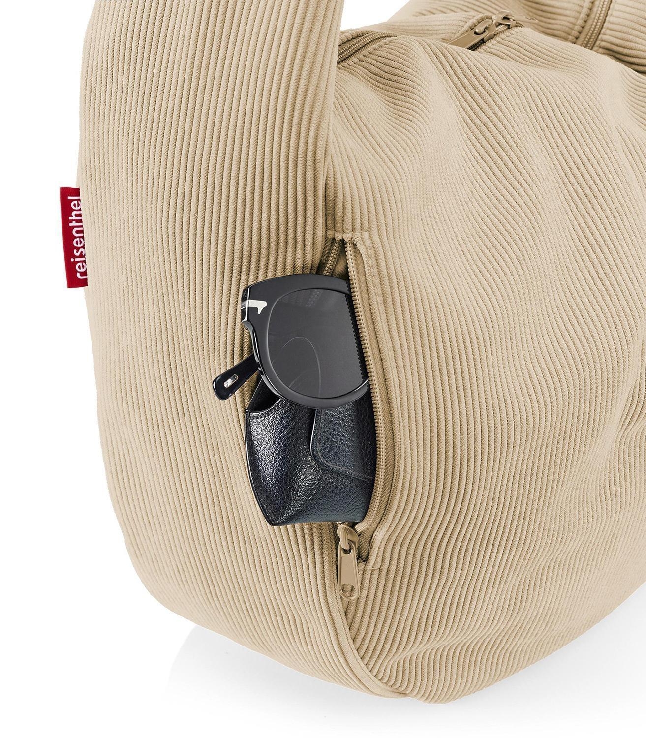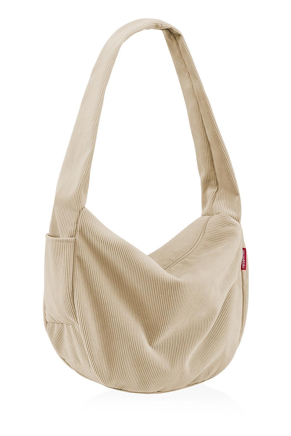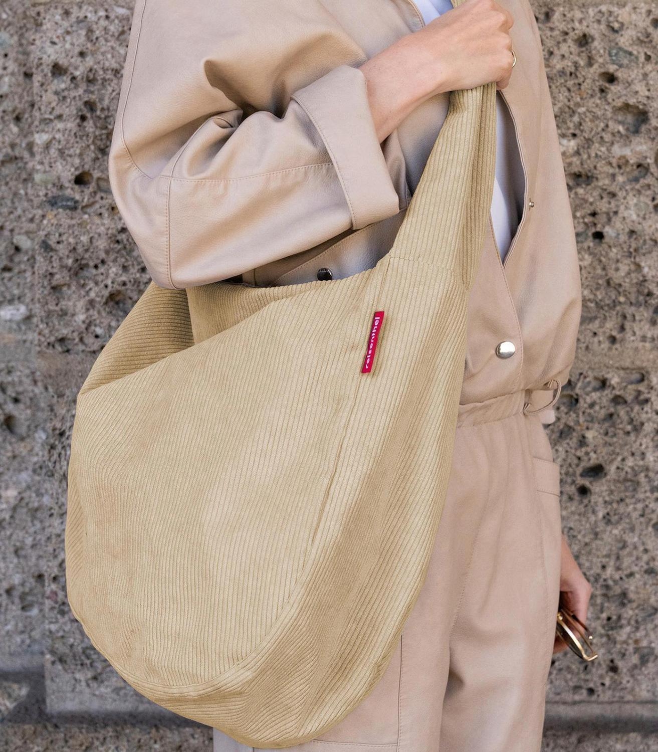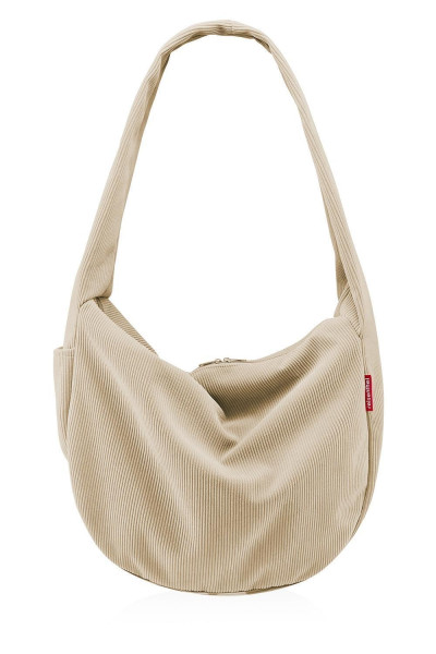 Die Umhängetasche MOONBAG CORD SAND der Marke Reisenthel besteht aus recyceltem Polyester in sandfarbener Cordoptik. Diese Schultertasche besitzt ein Fassungsvermögen von 24 Litern bei einer Breite von 33 cm, einer Höhe von 48 cm und einer Tiefe von 14 cm. Das große Hauptfach mit zusätzlichem Innensteckfach wird über einen 2-Wege-Reißverschluss geöffnet. Außen bietet diese Tasche ein weiteres Reißverschlussfach, ein Steckfach sowie einen breiten Trageriemen.