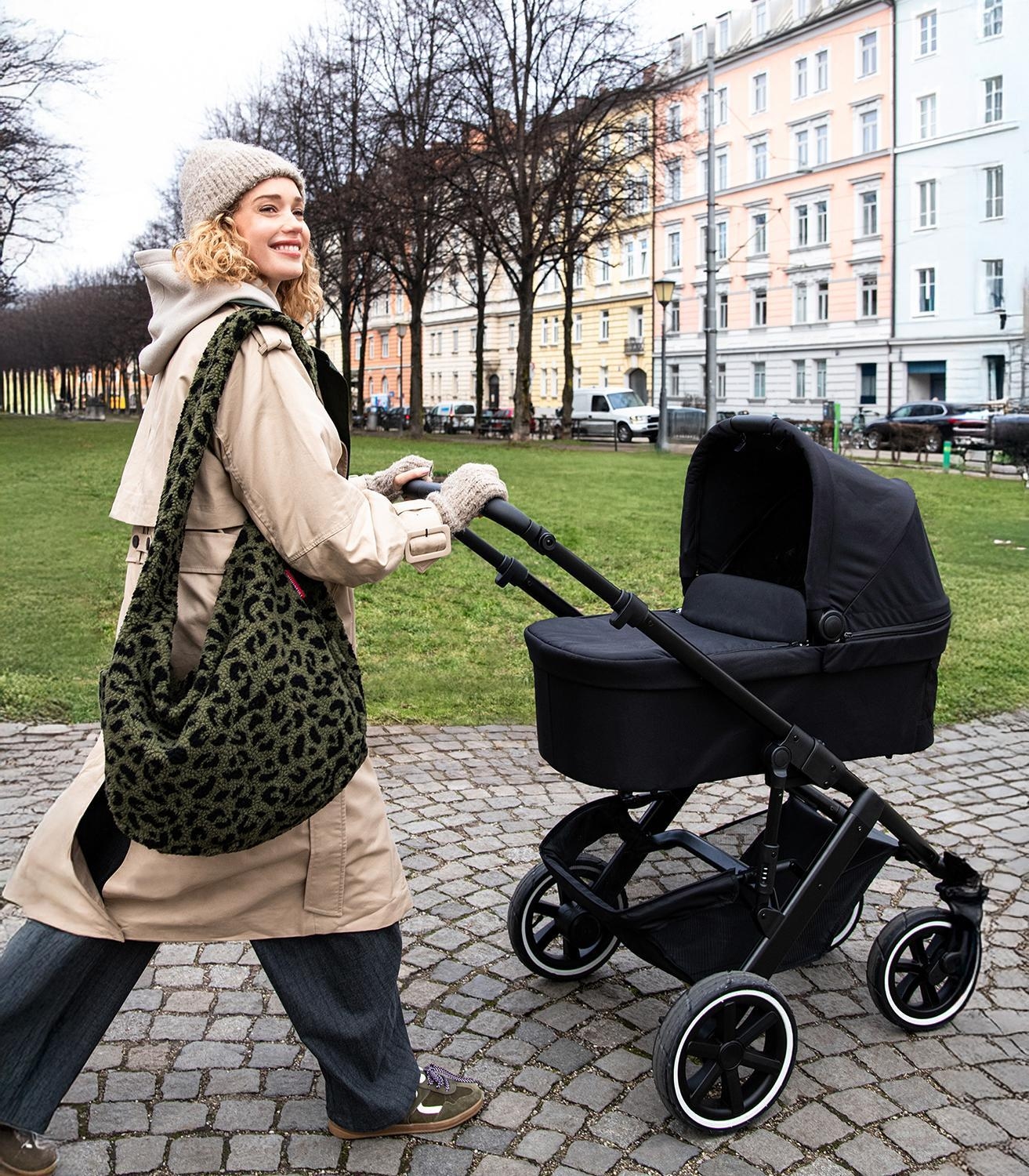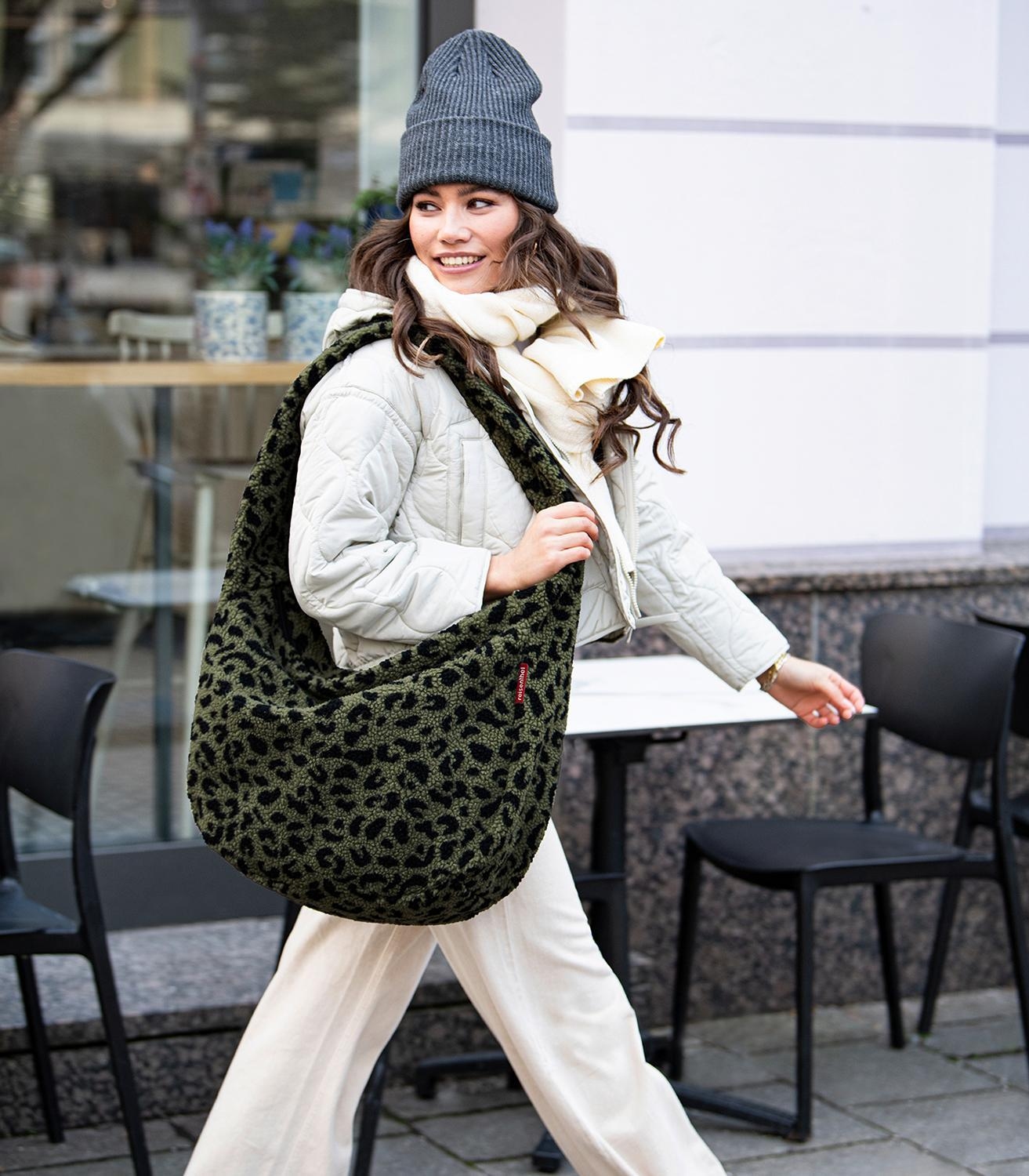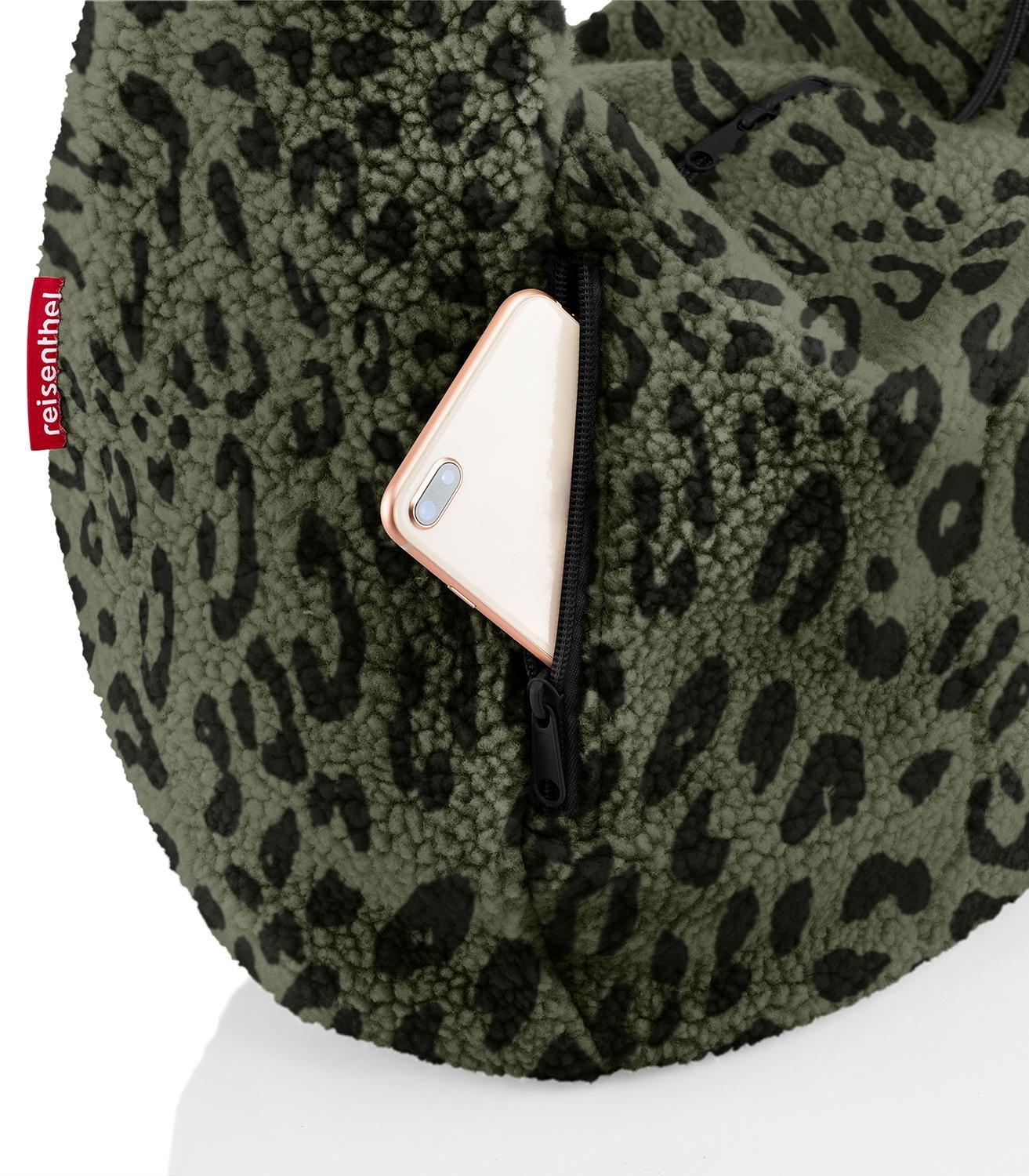 Die Umhängetasche MOONBAG TEDDY LEO OLIVE der Marke Reisenthel besteht aus Polyester in Olivgrün und Schwarz und weist einen Außenbezug aus Teddystoff auf. Diese Schultertasche besitzt ein Fassungsvermögen von 24 Litern bei einer Breite von 33 cm, einer Höhe von 48 cm und einer Tiefe von 14 cm. Das große Hauptfach mit zusätzlichem Innensteckfach wird über einen 2-Wege-Reißverschluss geöffnet. Außen bietet diese Tasche ein weiteres Reißverschlussfach, ein Steckfach sowie einen breiten Trageriemen.