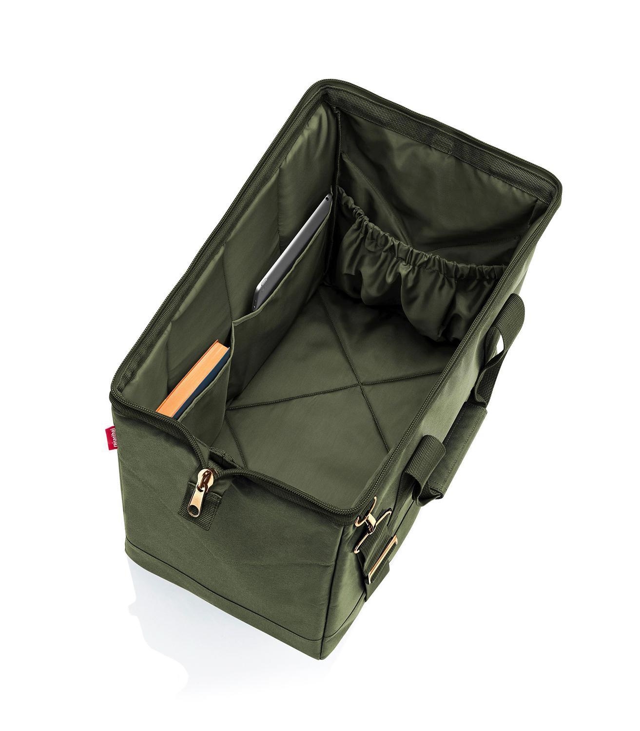 Die Reisetasche ALLROUNDER L FOREST GOLD von Reisenthel ist aus Polyestergewebe in Grün mit Applikationen in Goldgelb gefertigt und bietet ein Volumen von 30 Litern. Sie hat einen abnehmbaren Schultergurt und 2 vernähte Tragegriffe, sowie gepolsterte Seitenwände und Boden. Im Inneren gibt es 6 Steckfächer und die Öffnung ist mit einem eingearbeiteten Metallbügel versehen. Das hochwertige Polyestergewebe ist wasserabweisend. Die Tasche hat eine komfortabel gepolsterte Schulterauflage und 2 Tragehenkel mit Griffpolster.