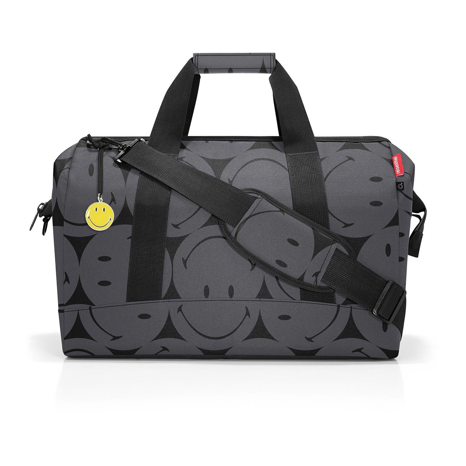 Die Reisetasche ALLROUNDER L SMILEY GREY von Reisenthel ist aus Polyestergewebe in Grau mit Smiley-Motiven gefertigt und bietet ein Volumen von 30 Litern. Sie hat einen abnehmbaren Schultergurt und 2 vernähte Tragegriffe, sowie gepolsterte Seitenwände und Boden. Im Inneren gibt es 6 Steckfächer und die Öffnung ist mit einem eingearbeiteten Metallbügel versehen. Das hochwertige Polyestergewebe ist wasserabweisend. Die Tasche hat eine komfortabel gepolsterte Schulterauflage und 2 Tragehenkel mit Griffpolster. Der gelbe Anhänger mit dem lächelnden Gesicht ist enthalten.