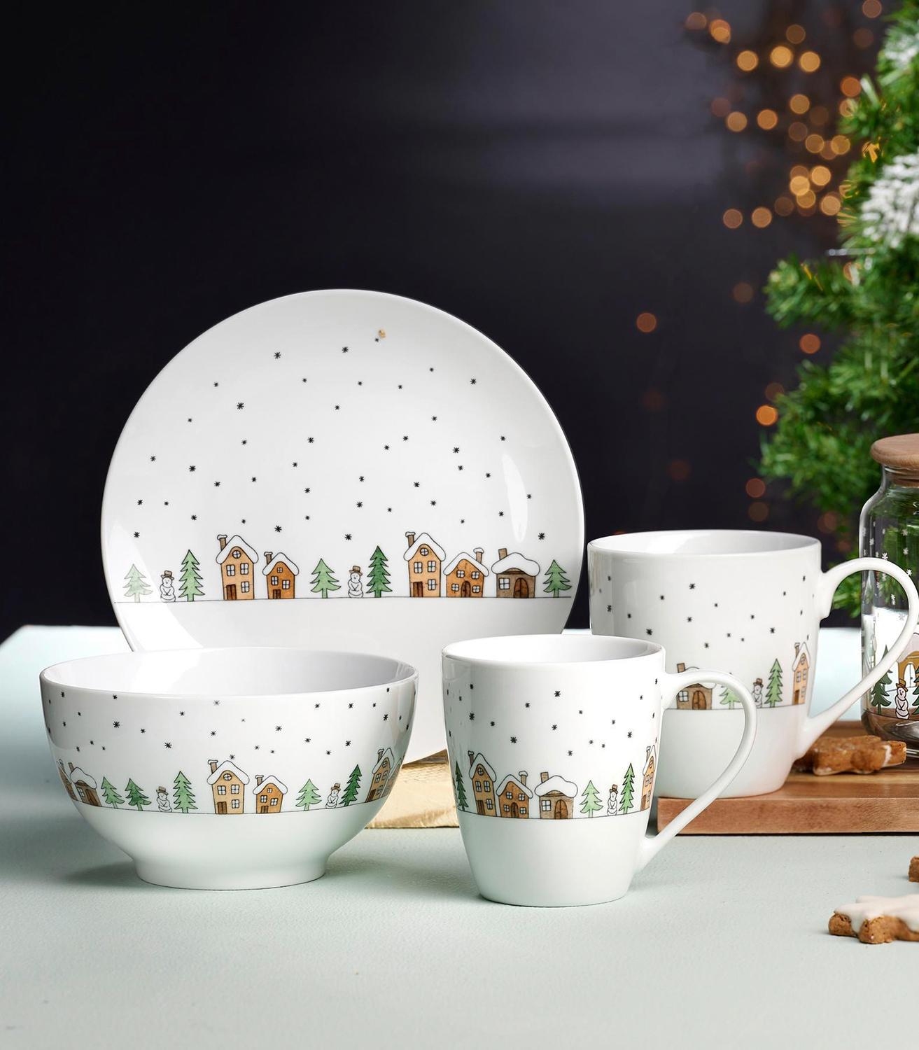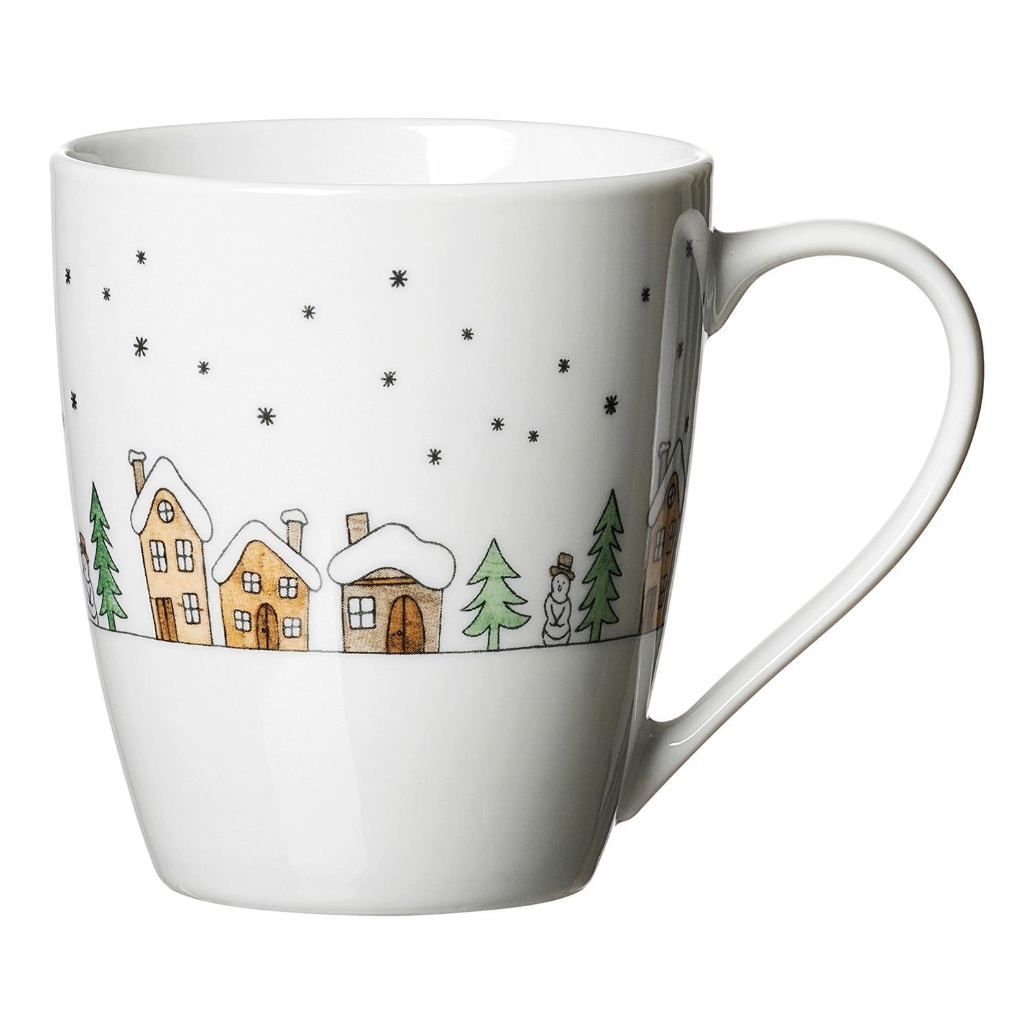 Die Kaffeetasse WINTERDORF von Ritzenhoff & Breker besteht aus weißem Porzellan und ist mit einem mehrfarbigen Winterdorfmotiv verziert. Sie verfügt über ein Fassungsvermögen von 360 ml, eine Breite von 13 cm, eine Höhe von 10 cm und eine Tiefe von 9 cm. Die Tasse ist sowohl mikrowellengeeignet als auch spülmaschinenfest.