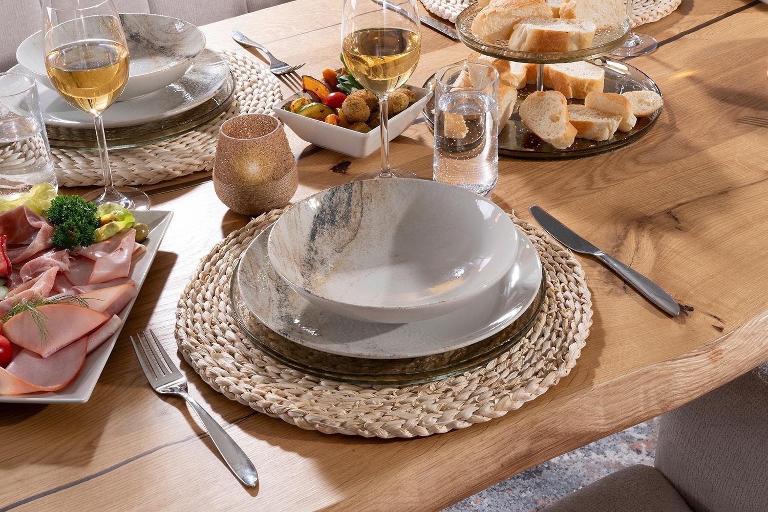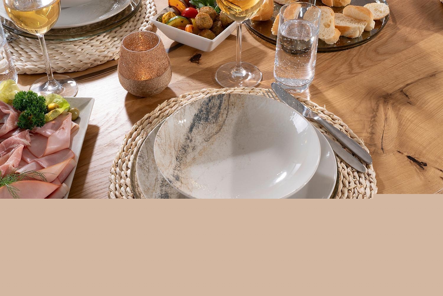 Der Speiseteller AREZZO vereint elegantes Design mit Funktionalität. Mit einem Durchmesser von 26 cm bietet sie genug Platz für Köstlichkeiten. Ihr marmoriertes Aussehen in Weiß und Braun verleiht jedem Tisch eine stilvolle Note. Hergestellt aus spülmaschinengeeignetem Steinzeug, ist sie praktisch und pflegeleicht. Perfekt für jede Gelegenheit.