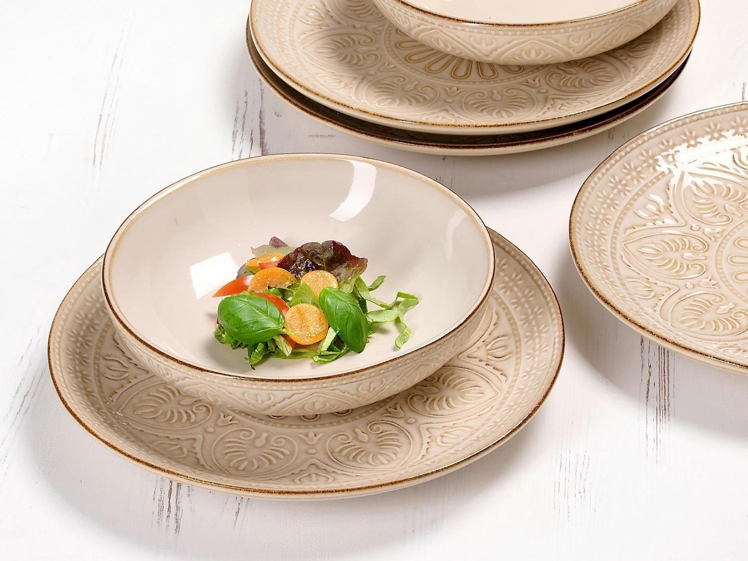 Der Speiseteller OMARA der Marke Ritzenhoff & Breker ist in Beige gehalten und hat einen Durchmesser von 26,5 cm. Er besteht aus Steingut und ist mit einer Relief-Ornamentik versehen. Der Teller ist spülmaschinenfest und für die tägliche Benutzung geeignet.