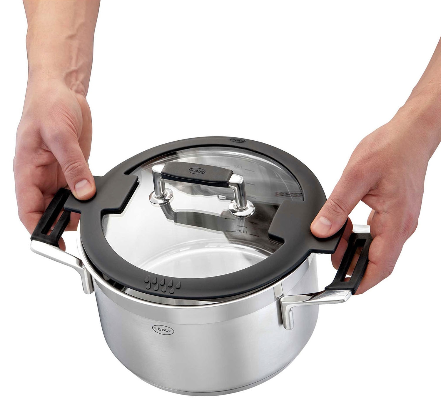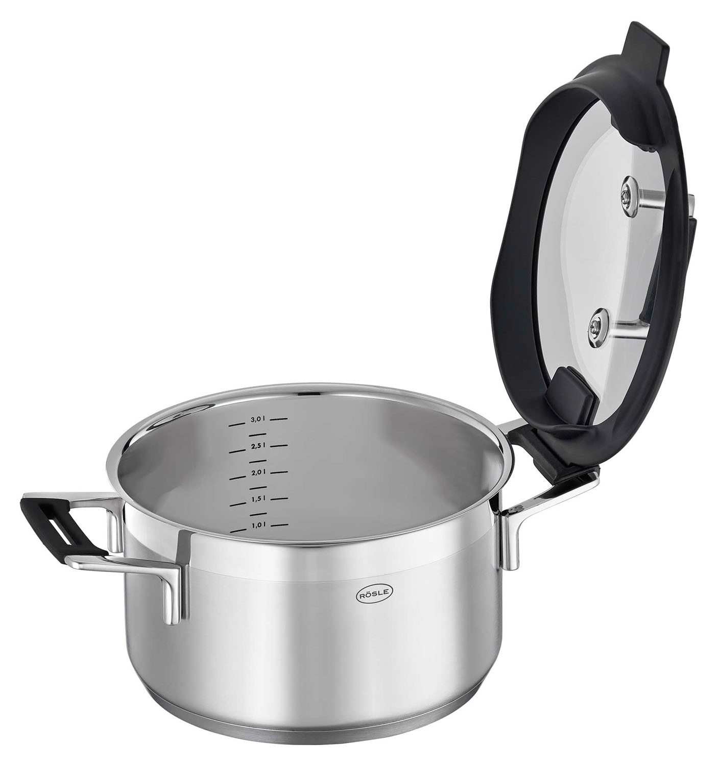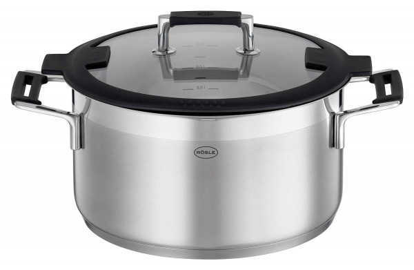 Der Kochtopf von Rösle aus langlebigem Edelstahl ist rostfrei, geschmacksneutral und spülmaschinengeeignet. Der Glasdeckel bietet jederzeit einen Blick ins Innere und lässt sich dank des Edelstahlgriffes leicht öffnen. Zudem verfügt der Deckel über eine Silikonummantelung, die ein verrutschen und klappern während des Kochvorgangs verhindert. Der Deckel kann in den Ritzen der Topfgriffe fixiert werden und die praktische Innenskalierung ermöglicht ein präzises Abmessen von Flüssigkeiten. Der Boden mit gekapseltem Aluminiumkern spart Energie beim Kochen durch optimale Wärmeverteilung und -speicherung und ist für alle Herdarten geeignet.