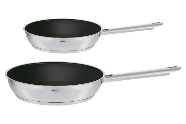 Das Pfannen-Set ELEGANCE von Rösle besteht aus zwei Pfannen aus Edelstahl mit Durchmessern von 28 cm und 20 cm. Beide Pfannen sind mit einer ProCera-Keramik-Antihaftversiegelung ausgestattet, die fettarmes Braten und eine einfache Reinigung ermöglicht. Sie sind für alle Herdarten geeignet, einschließlich Induktion, und bis zu 400 °C hitzebeständig, was sie besonders vielseitig macht. Zudem sind die Pfannen spülmaschinengeeignet, was die Pflege im Alltag erleichtert.