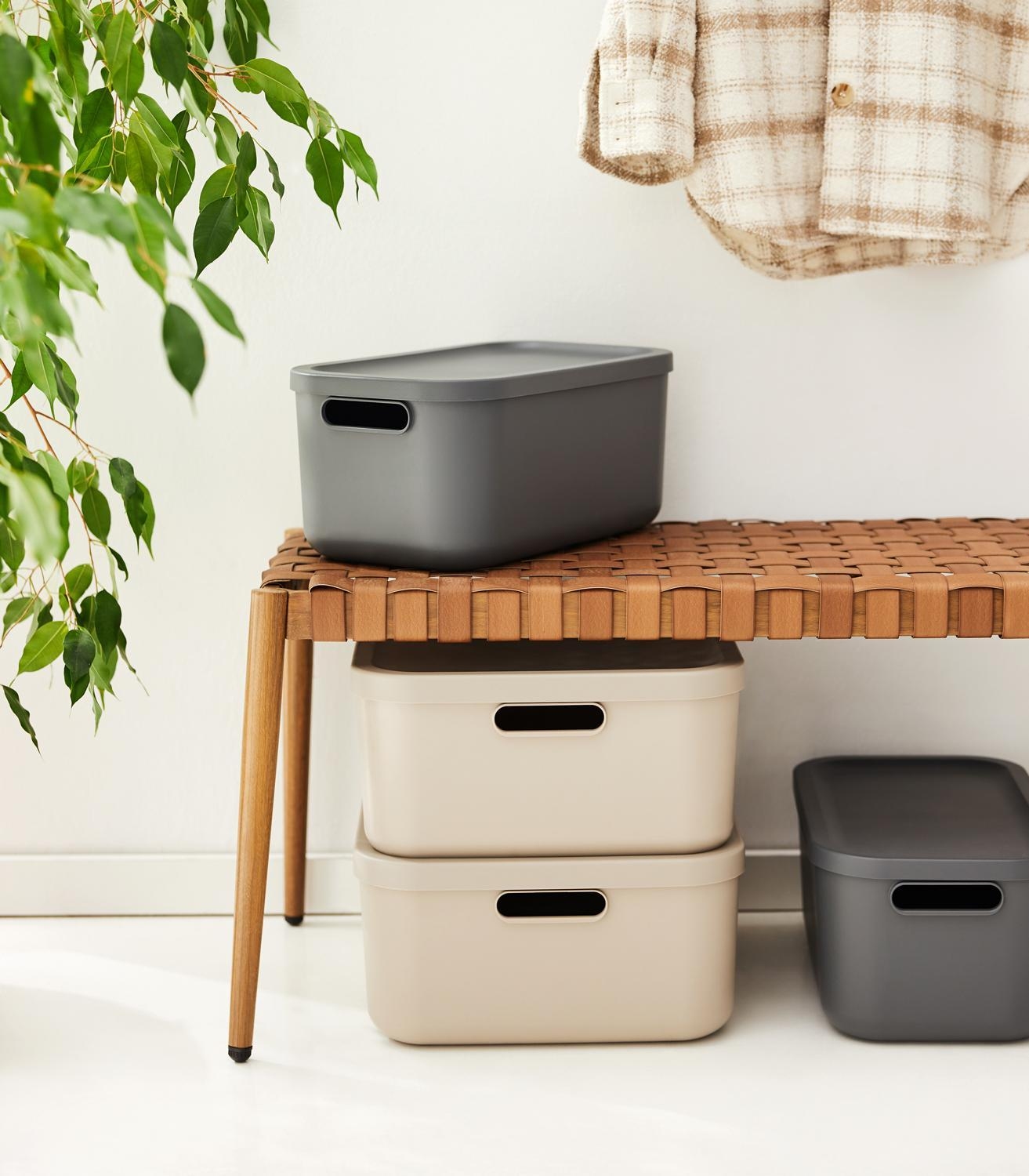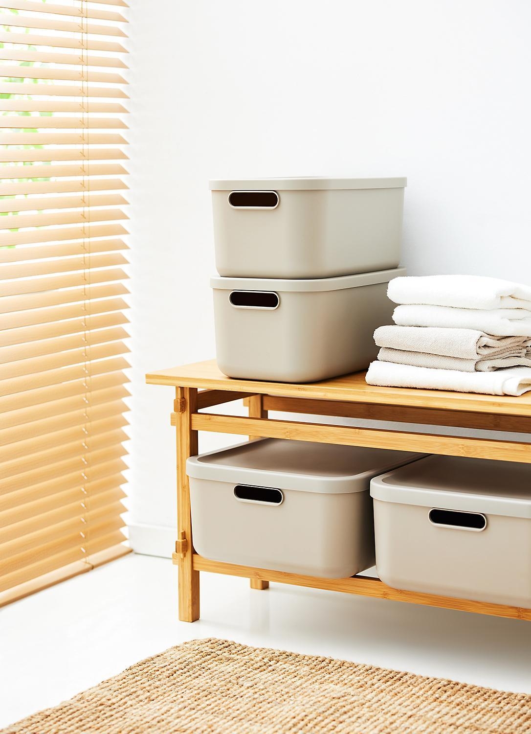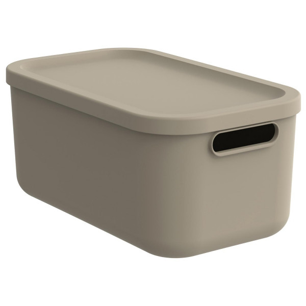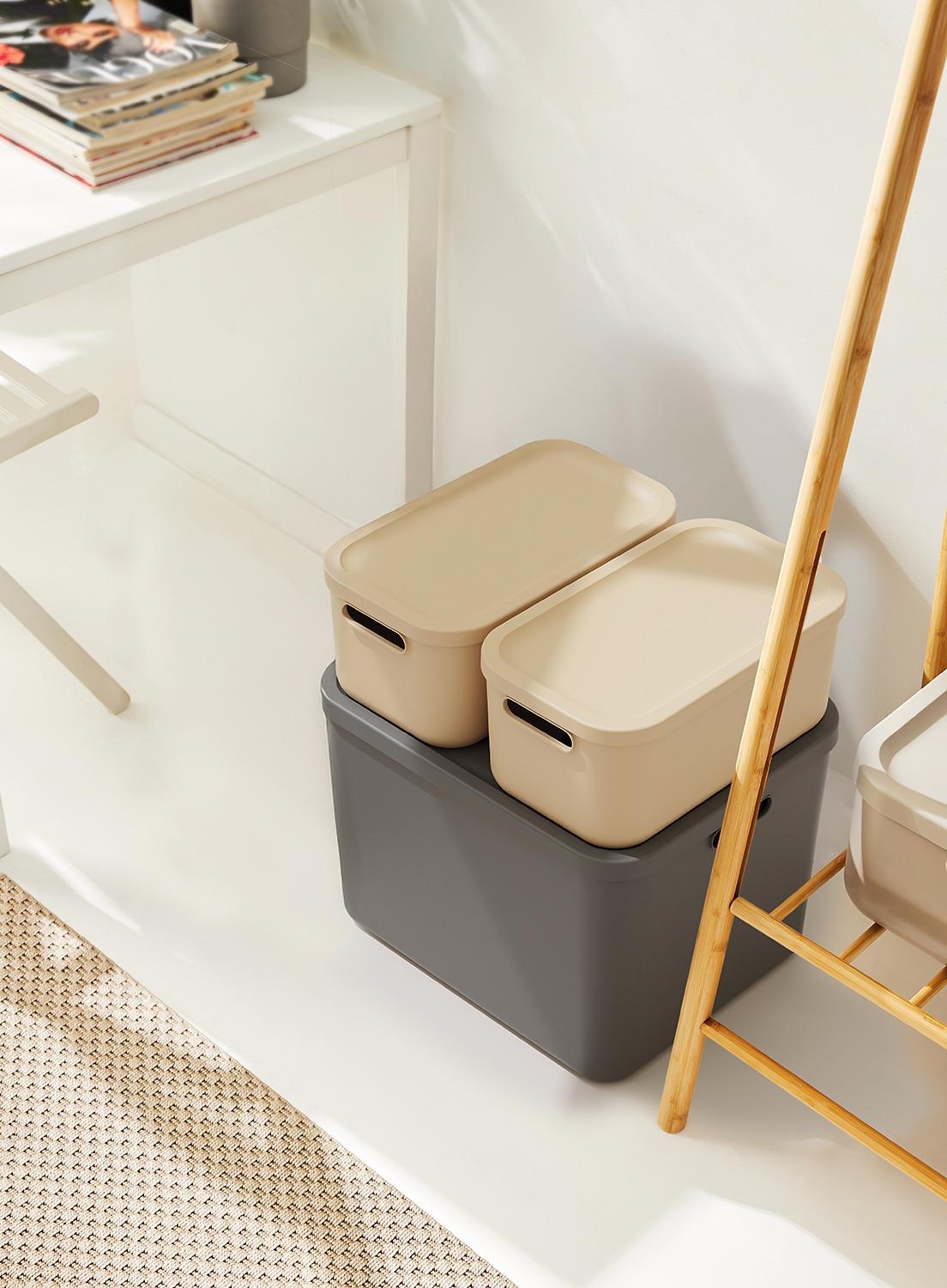 Die stapelbare Aufbewahrungsbox ALBULA von Rotho in Braun überzeugt mit einem Volumen von 12 Litern und praktischen Maßen von 39,5 x 17,5 x 23,5 cm. Sie besteht aus recyceltem Kunststoff, ist stabil und umweltfreundlich zugleich. Dank Deckel und zwei integrierten Tragegriffen eignet sich die Box ideal zum Verstauen und Transportieren verschiedenster Dinge. Ob im Haushalt, Büro oder Keller – diese vielseitige Box schafft Ordnung und lässt sich platzsparend stapeln.