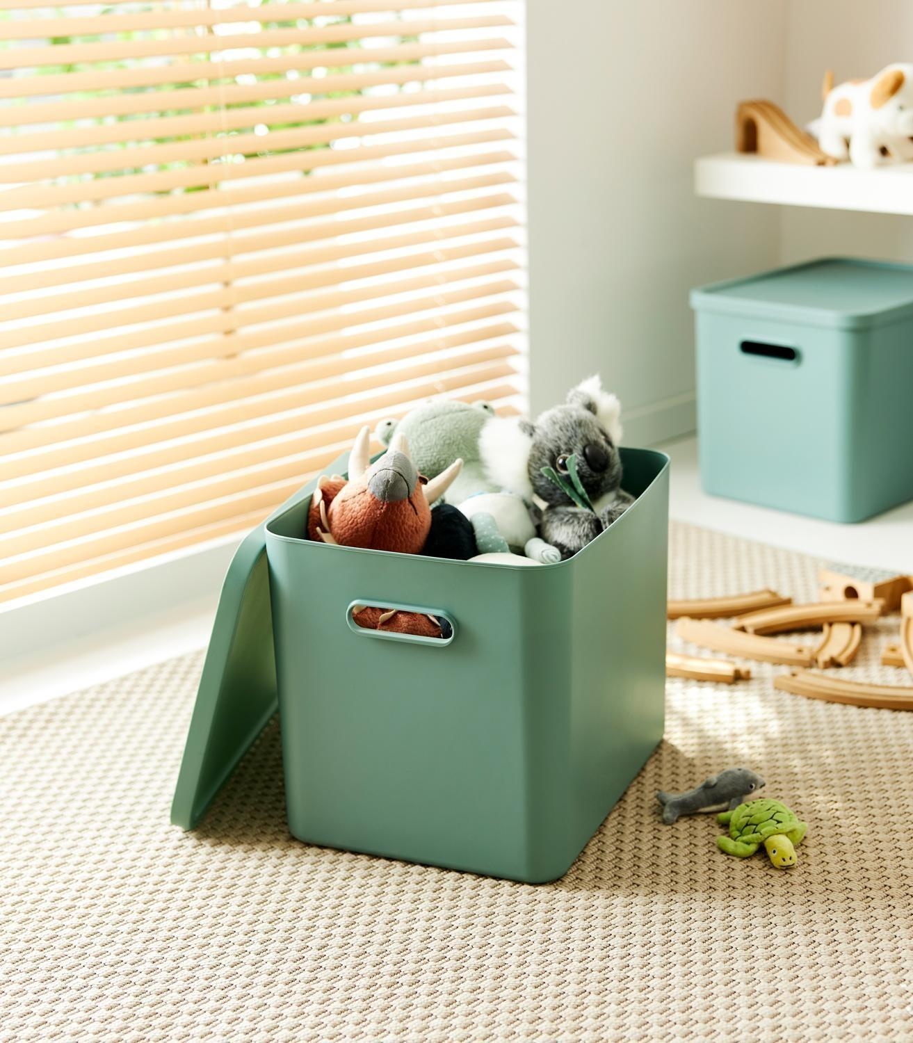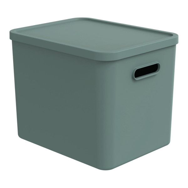 Die stapelbare Aufbewahrungsbox ALBULA von Rotho in Grün überzeugt mit einem Volumen von 27 Litern und praktischen Maßen von 37 x 29,5 x 29 cm. Sie besteht aus recyceltem Kunststoff, ist stabil und umweltfreundlich zugleich. Dank Deckel und zwei integrierten Tragegriffen eignet sich die Box ideal zum Verstauen und Transportieren verschiedenster Dinge. Ob im Haushalt, Büro oder Keller – diese vielseitige Box schafft Ordnung und lässt sich platzsparend stapeln.