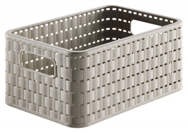 Der Aufbewahrungskorb COUNTRY der Marke Rotho besteht aus stabilem Kunststoff und ist in der Farbe Cappuccino erhältlich. Er ist in Rattan-Optik gestaltet und mit integrierten Tragegriffen ausgestattet. Der Korb ist stapelbar und hat ein Fassungsvermögen von 18 Litern. Die Maße betragen 36,8 cm in der Breite, 19 cm in der Höhe und 27,8 cm in der Tiefe.