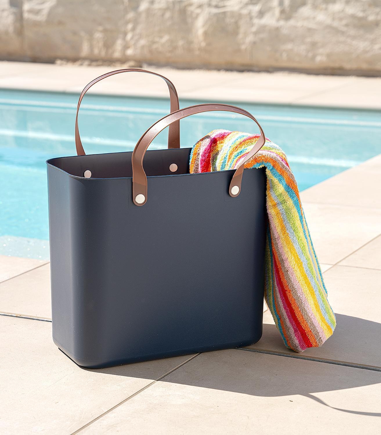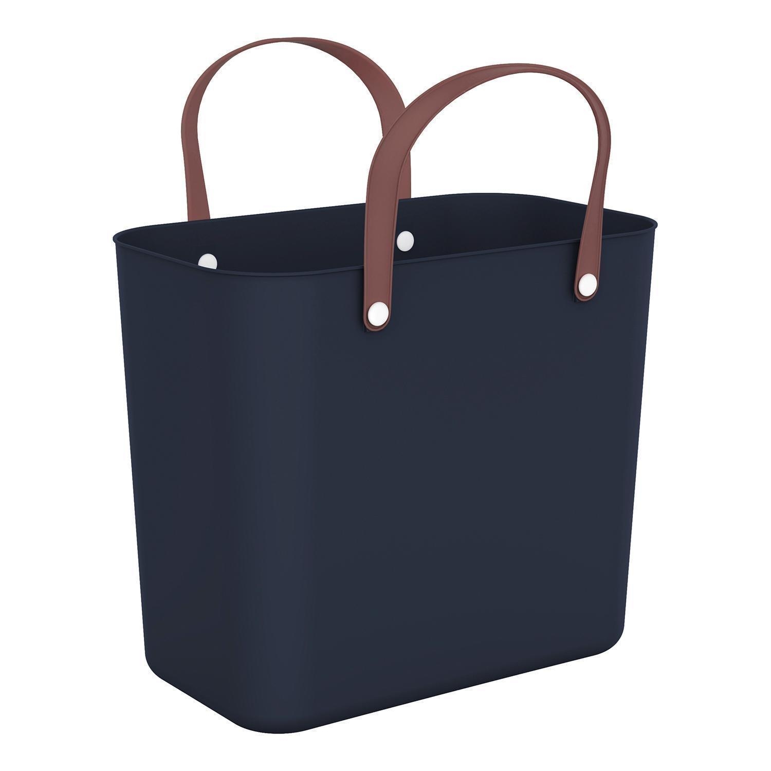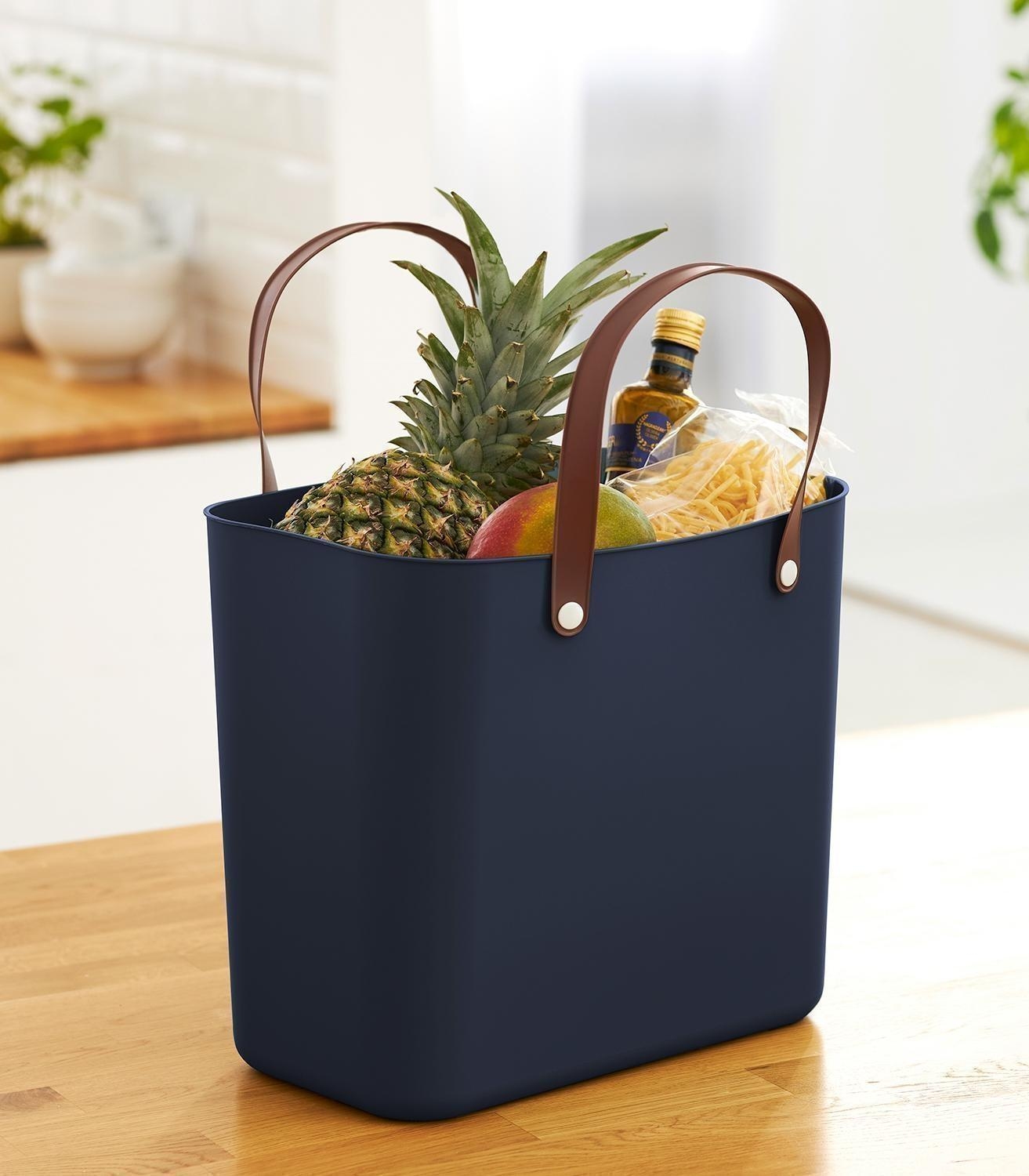 Die Einkaufstasche ALBULA der Marke Rotho ist aus recyceltem Kunststoff gefertigt und in der Farbe Dunkelblau ausgeführt. Sie verfügt über ergonomische Tragegriffe in Braun. Das Fassungsvermögen beträgt 25 Liter. Die Tasche ist bis zu einem Maximalgewicht von 40 kg belastbar. Ihre Abmessungen betragen 40 cm in der Breite, 34 cm in der Höhe und 23,5 cm in der Tiefe.
