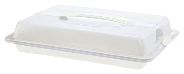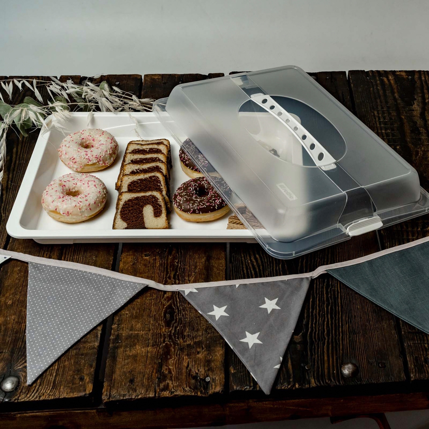 Der Party-Buttler bietet viel Platz für Kuchen oder Snacks. Der Deckel lässt sich mit 2 seitlichen Klappen sicher fixieren.