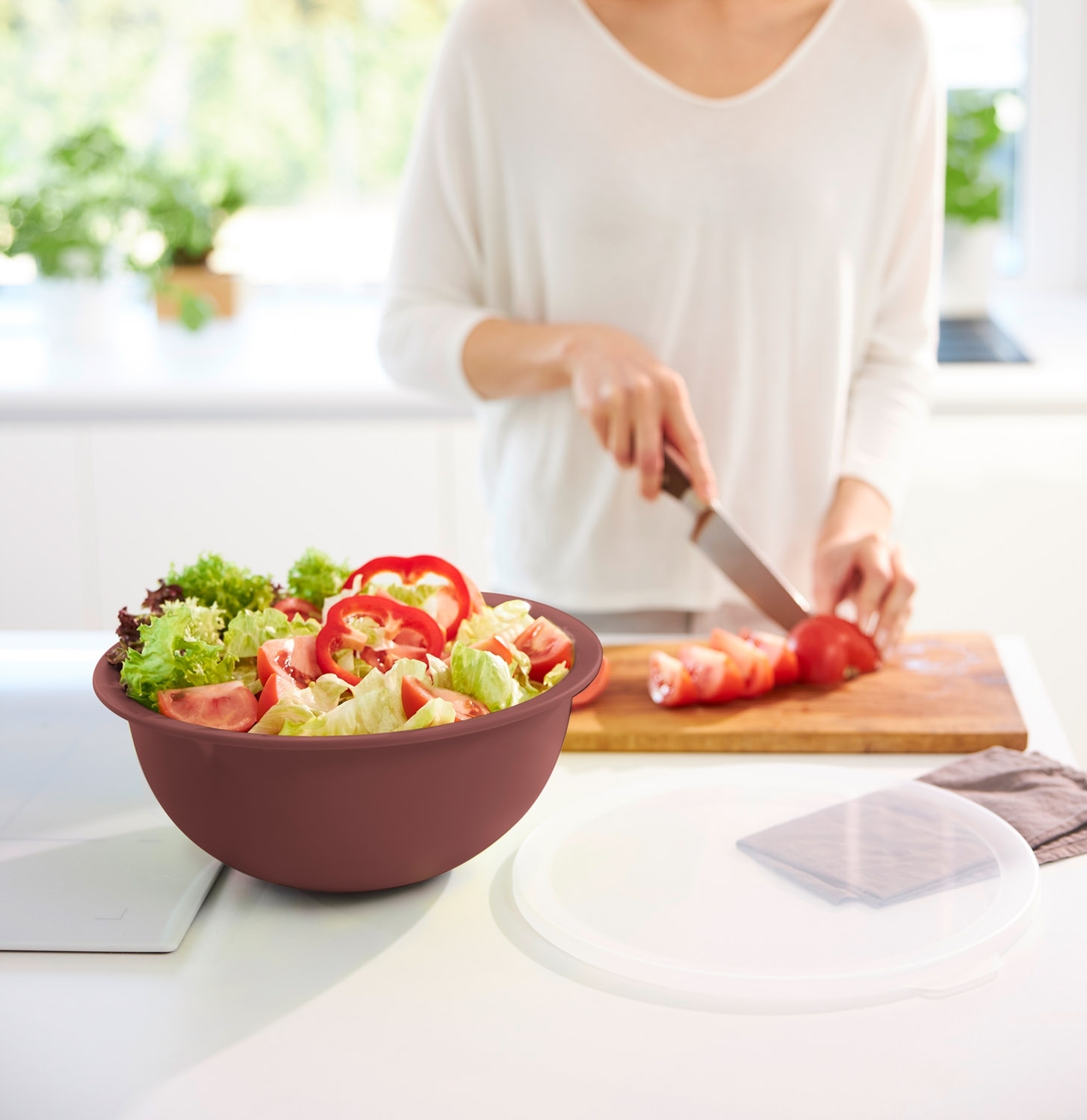 Die Schüssel CARUBA in Rot mit transparentem Deckel ist ein unverzichtbarer Alleskönner in jeder Küche. Mit einem großzügigen Fassungsvermögen von 8 Litern ist es ideal für die Zubereitung von frischen Salaten oder anderen Gerichten. Dank des dicht schließenden Deckels bleibt der Inhalt frisch und sicher verschlossen, was auch den Transport erleichtert. Hergestellt aus robustem, schadstofffreiem Kunststoff, ist es äußerst langlebig und kann problemlos in der Spülmaschine gereinigt werden. Mit einem Durchmesser von 36 cm und einer Höhe von 16 cm bietet es ausreichend Platz für verschiedene Küchenaktivitäten.