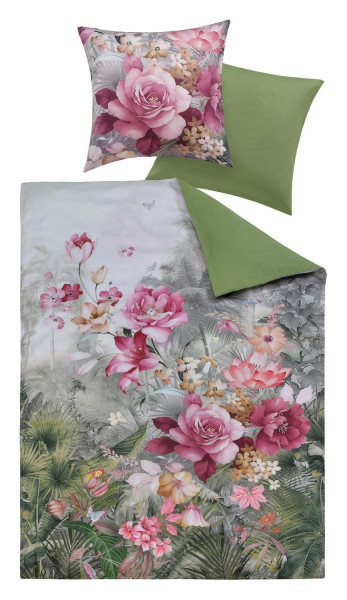 Diese Satin-Wende-Bettwäsche ROSALE überzeugt mit einer floralen Vorderseite in Pink, Grau und Grün sowie einer unifarbenen Rückseite in Grün. Sie hat eine Größe von 155 x 220 cm und besteht aus weicher Baumwolle. Ein praktischer Reißverschluss erleichtert das Beziehen. Die Bettwäsche ist bis 60 °C waschbar und trocknergeeignet – ideal für ein frisches und gemütliches Schlafzimmer.
