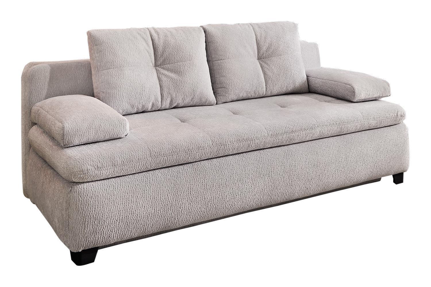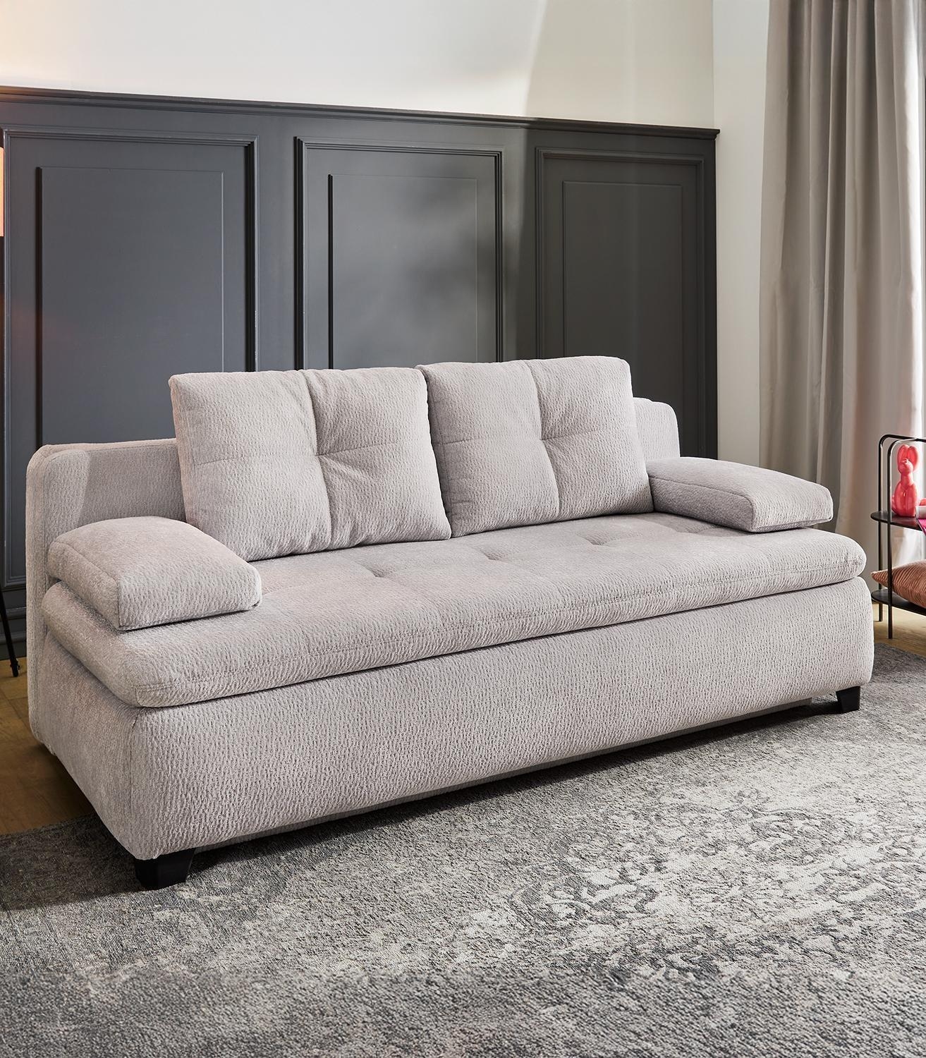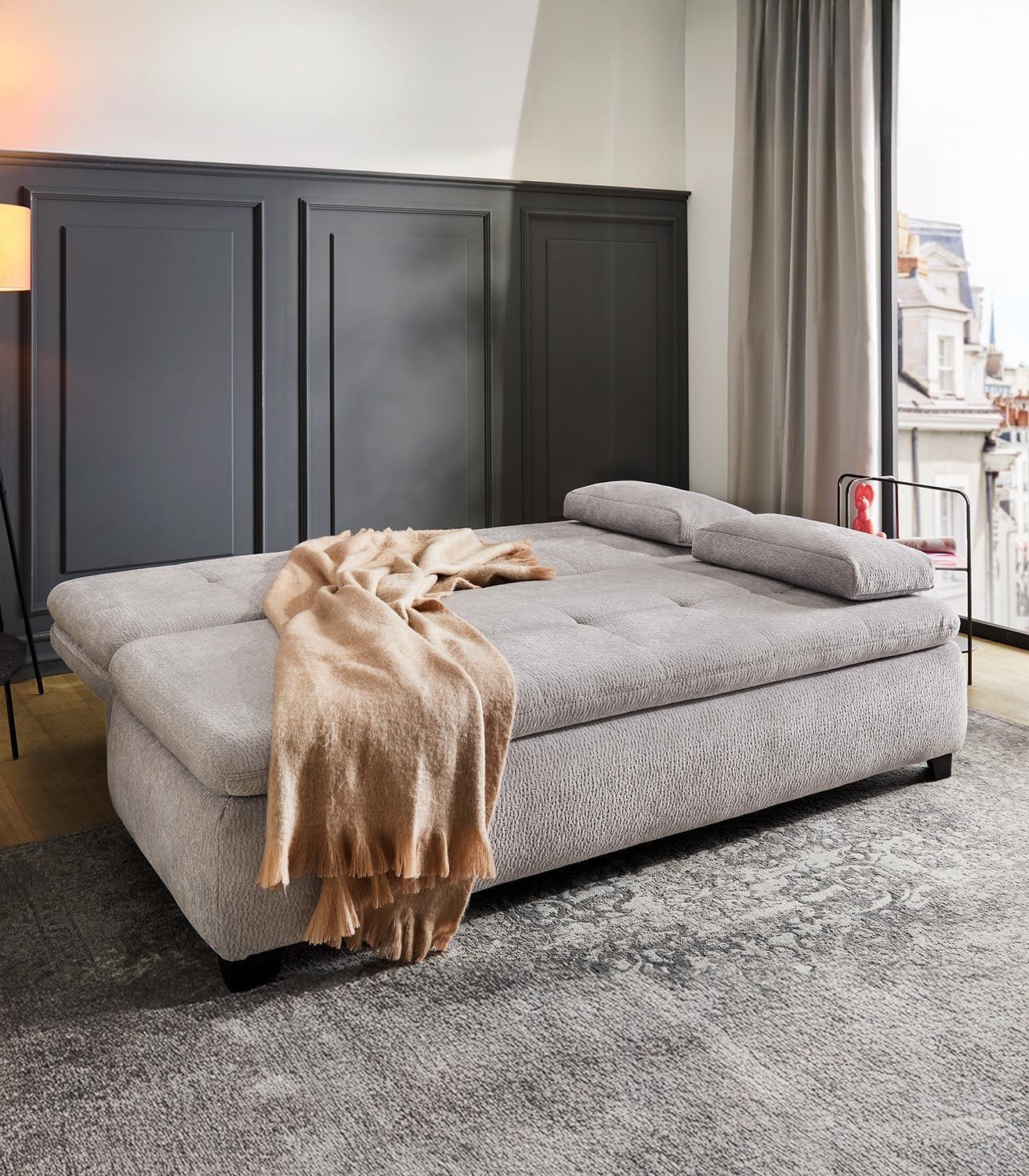 | Lieferumfang: | 1 Schlafsofa mit Bettkasten, Gästebettfunktion, 2 Armlehnkissen und 2 Rückenkissen |