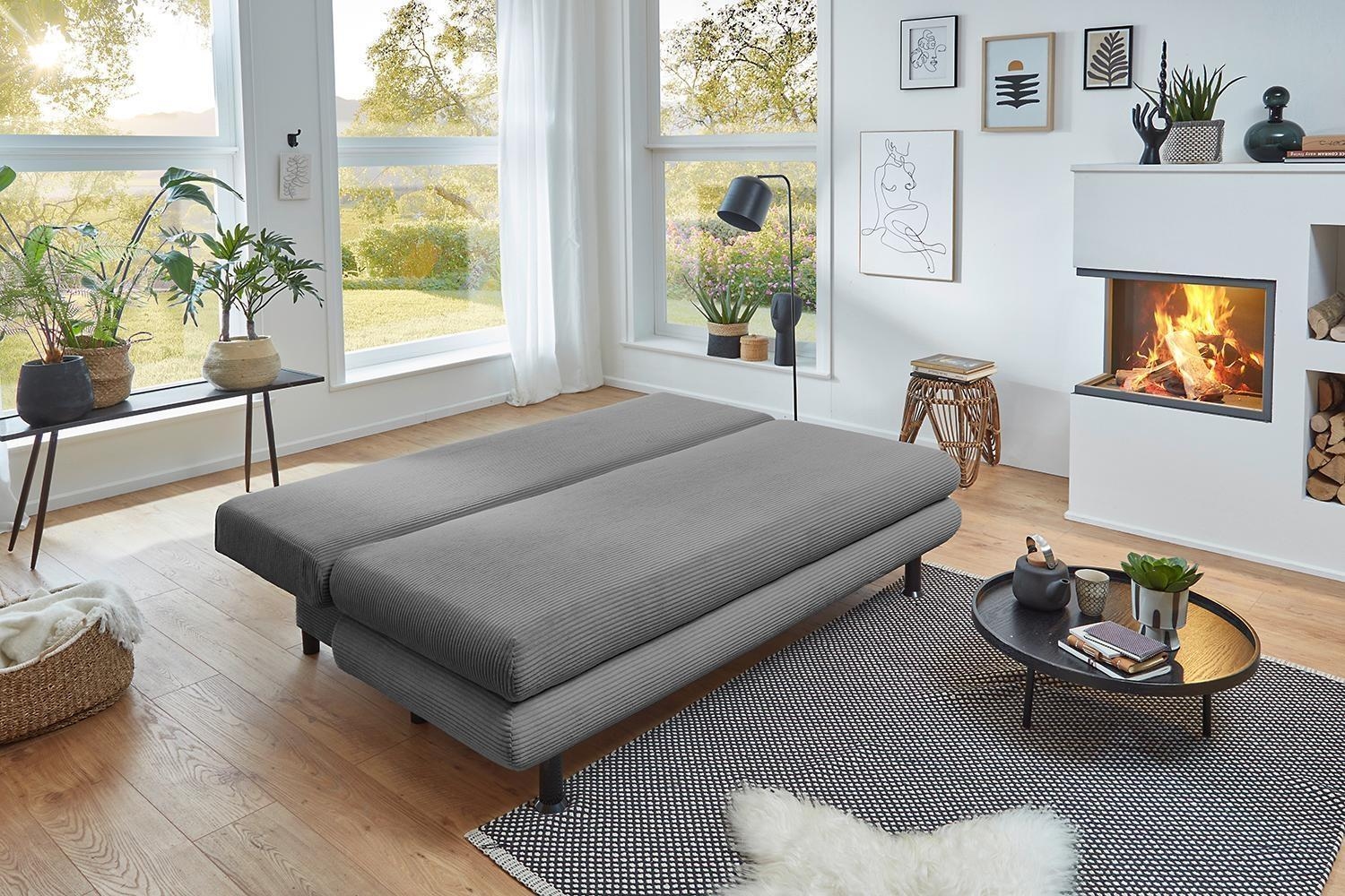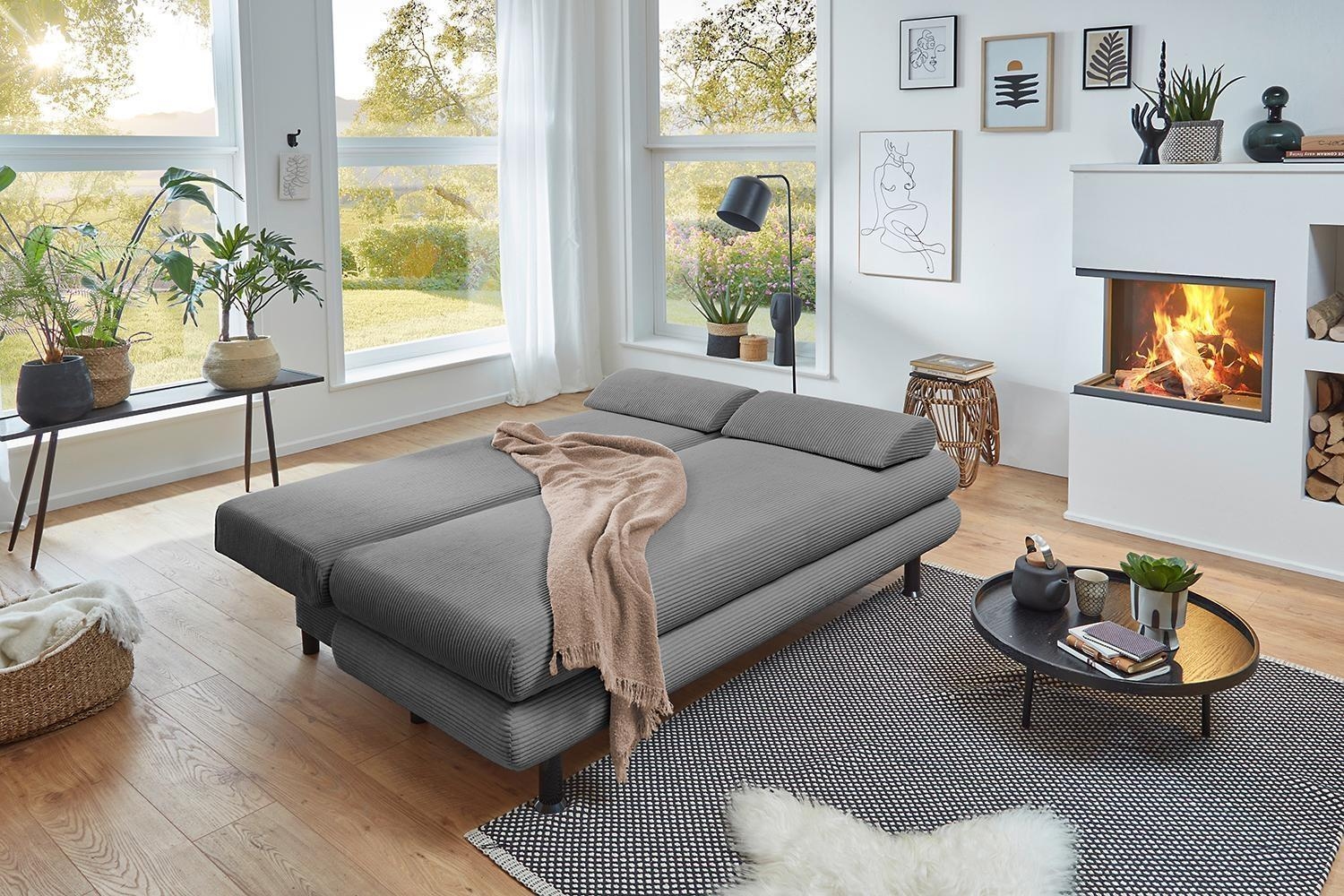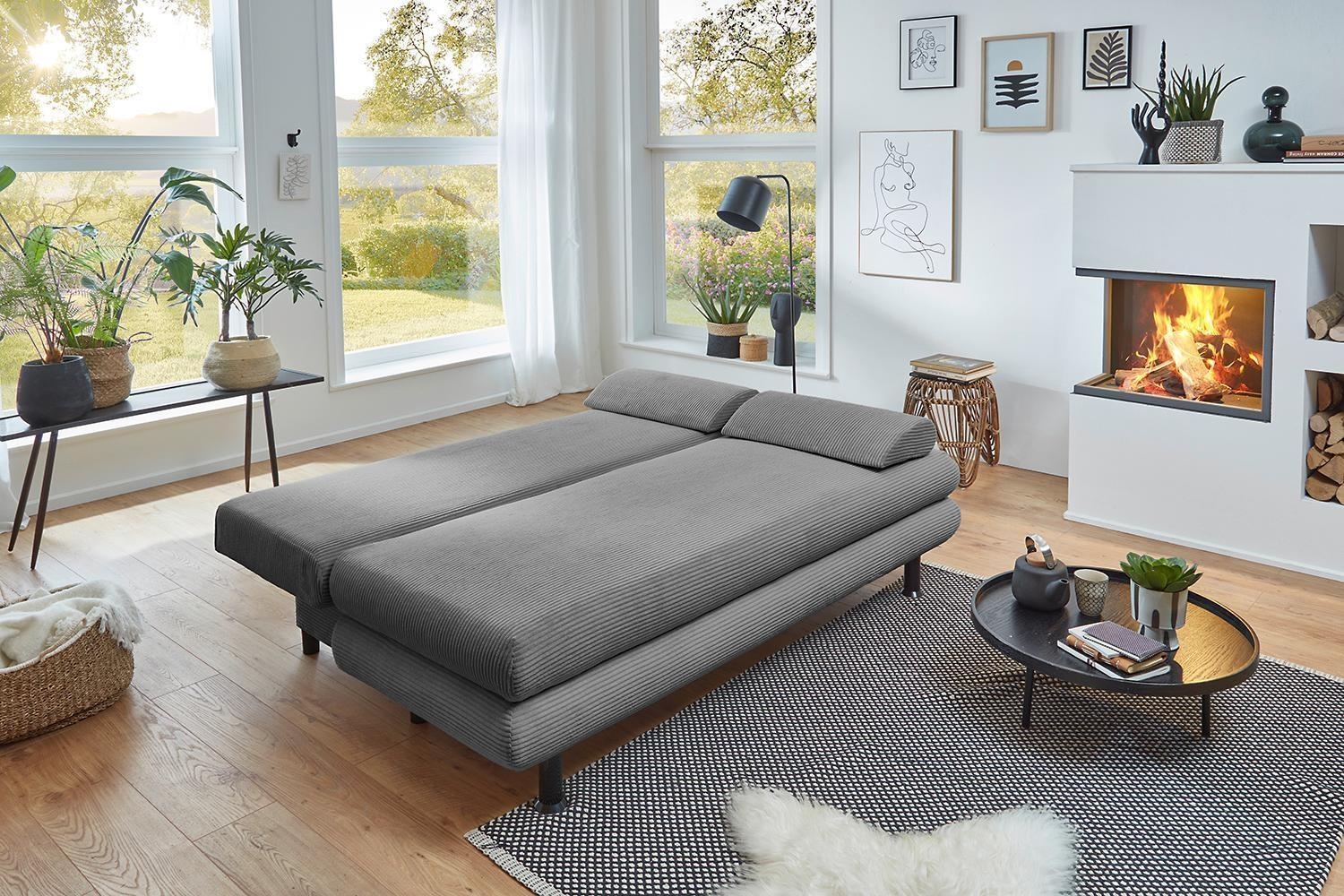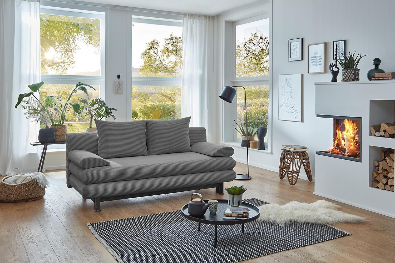 Das Schlafsofa BONETO ist mit einem Breitcordbezug in Grau versehen. Es verfügt über zwei Armlehnenkissen und zwei Rückenkissen. Die Bonellfederkernpolsterung im Sitz sorgt für Komfort. Das Sofa ist mit einer Gästebettfunktion ausgestattet und bietet zusätzlichen Stauraum durch einen integrierten Bettkasten. Die Breite beträgt 190 cm, die Höhe 93 cm und die Tiefe 92 cm. Die Liegefläche misst 140 x 188 cm.