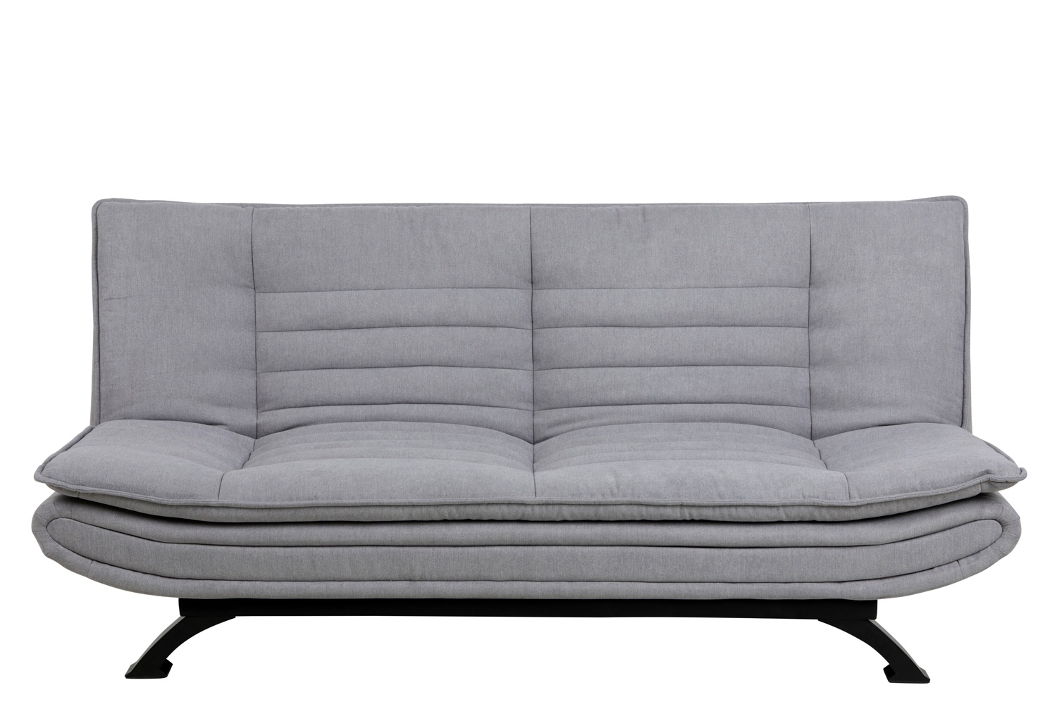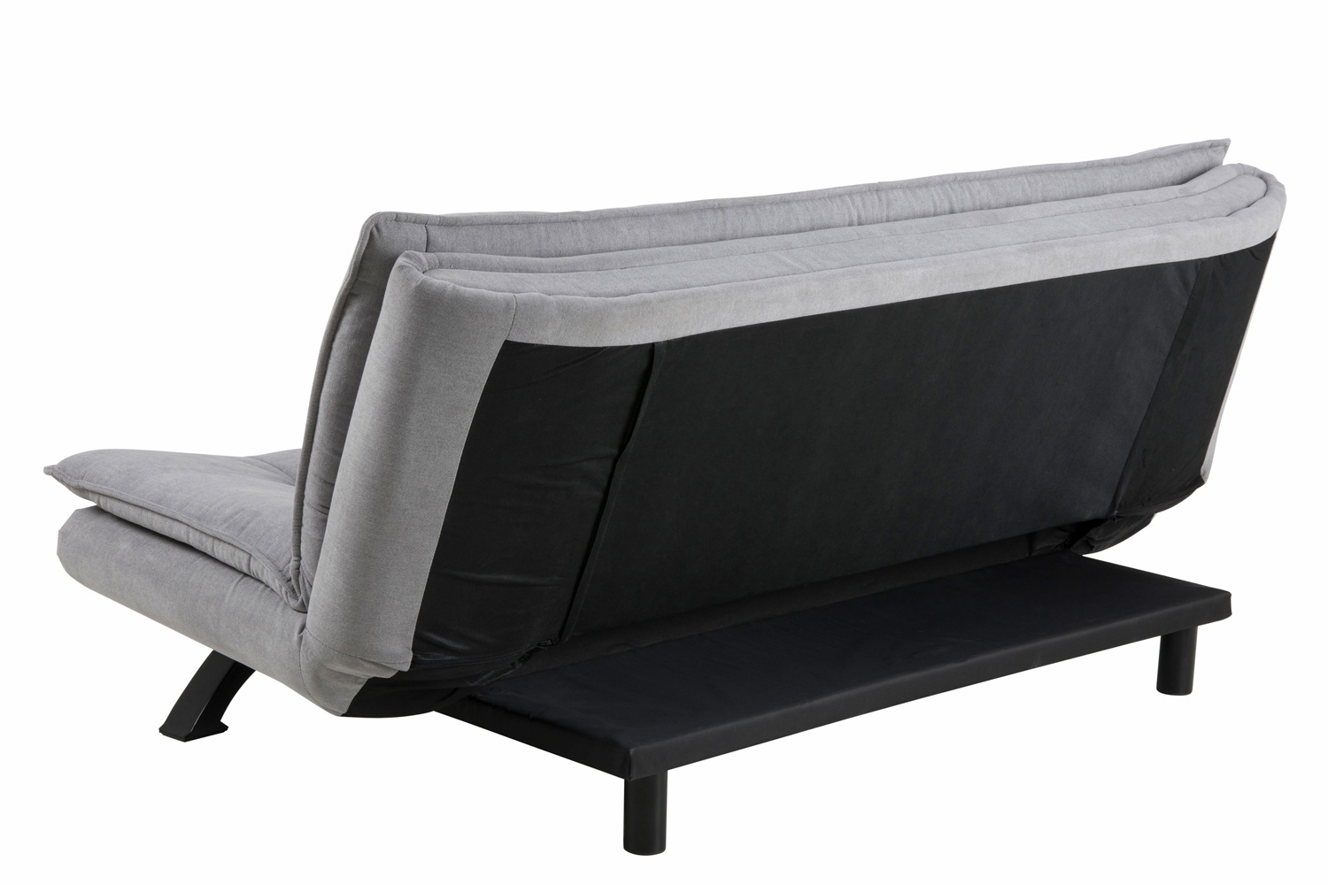 Das Schlafsofa mit Mikrofaserbezug in hellgrau verfügt über eine Polyurethanschaumpolsterung mit Wellenunterfederung in Sitz- und Rückenfläche. Das Gestell besteht aus pulverbeschichtetem Stahl in schwarz matt. Durch den Klappbeschlag kann die Rückenlehne umgeklappt werden und es entsteht eine Einzelliege für einen Übernachtungsgast. Der Topper kann nicht abgenommen werden.