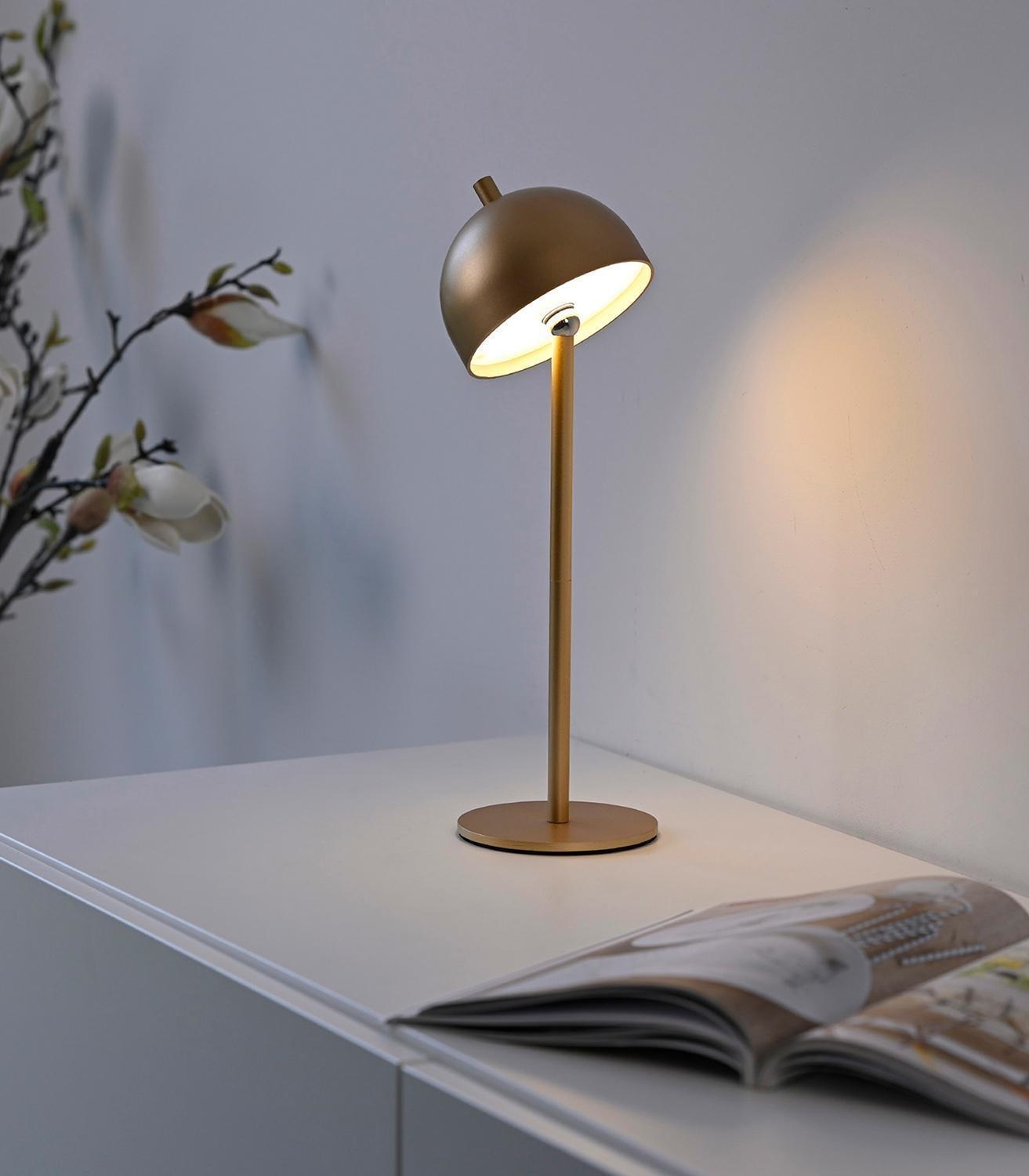 Die Akku LED-Tischlampe BELLIS der Marke Schöner Wohnen besteht aus Metall und ist in der Farbe Goldgelb ausgeführt. Sie verfügt über drei verschiedene Montagemöglichkeiten und kann unter anderem als Tischlampe, Flaschenlampe oder Aufliegelampe verwendet werden. Der schwenkbare Leuchtenkopf ermöglicht eine flexible Ausrichtung des Lichts. Die Lampe ist mit einem Touchsensor ausgestattet, über den sie dimmbar ist. Zusätzlich verfügt sie über eine Memoryfunktion, die die zuletzt eingestellte Helligkeit speichert.