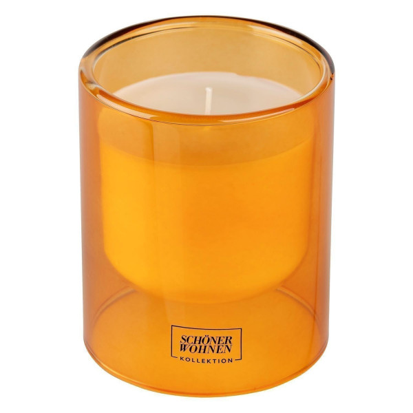 Die Duftkerze L von Schöner Wohnen verleiht jedem Raum eine angenehme Atmosphäre. Sie befindet sich in einem orangefarbenen, wiederverwendbaren Glas mit einem Durchmesser von 9 cm und einer Höhe von 11 cm. Das Glas ist mit 222 g weißem Kerzenwachs gefüllt und duftet nach leckerer Vanille. Mit einer Brenndauer von 45 bis 55 Stunden sorgt die Kerze für langanhaltenden Genuss. Perfekt für entspannte Abende oder als stilvolle Dekoration.