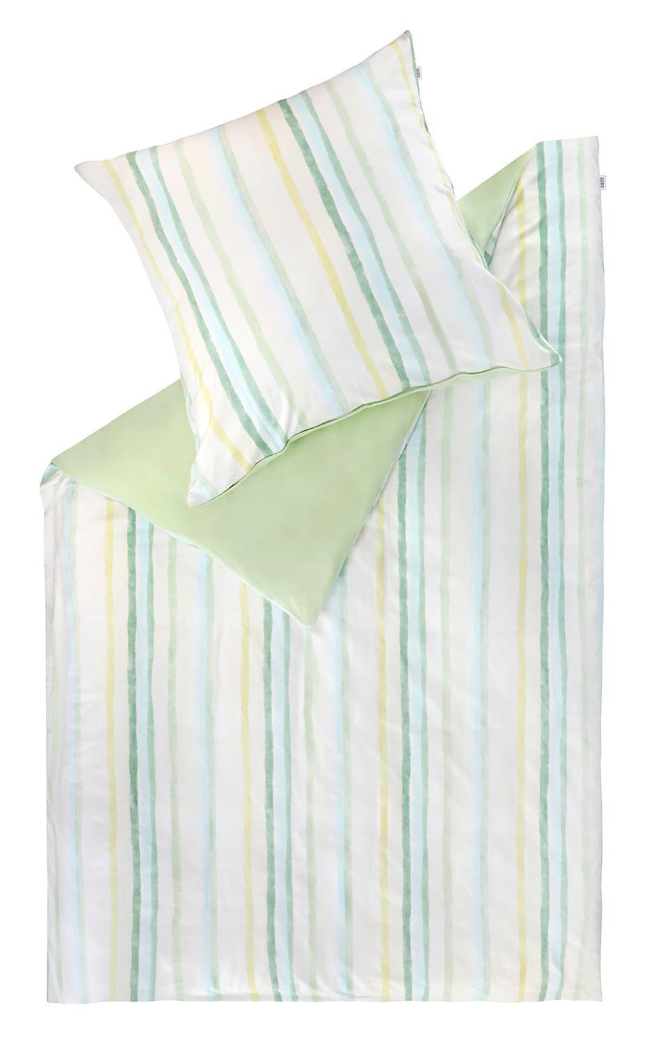 Die Flanell-Wendebettwäsche AQUASTRIPES der Marke Schöner Wohnen besteht aus Baumwolle in Pastellgrün und ist mit einem praktischen Reißverschluss ausgestattet. Die Vorderseite zeigt ein Streifenmuster, während die Rückseite einfarbig ohne Muster gehalten ist. Der Deckenbezug misst 135 x 200 cm, der Kissenbezug 80 x 80 cm. Die Bettwäsche ist waschbar bei 60 °C.