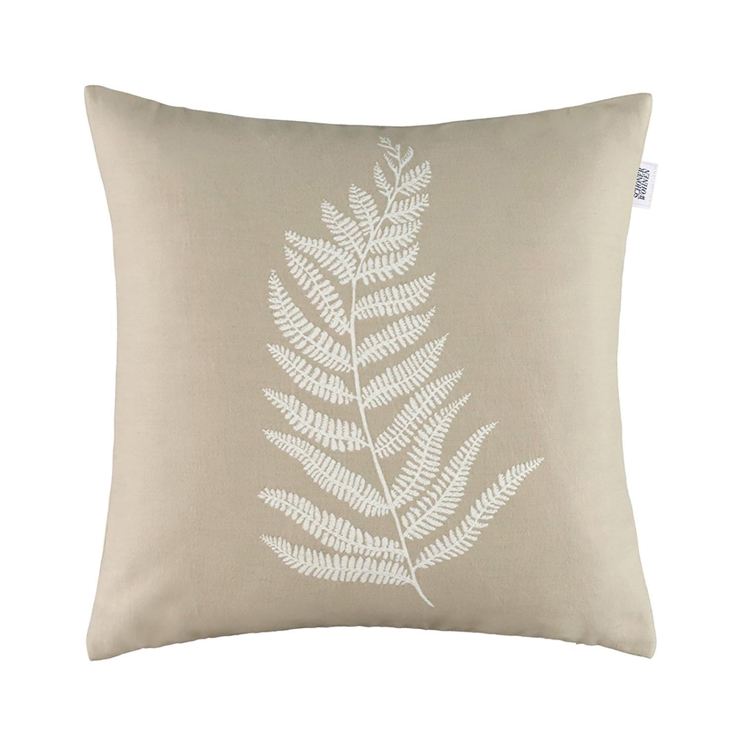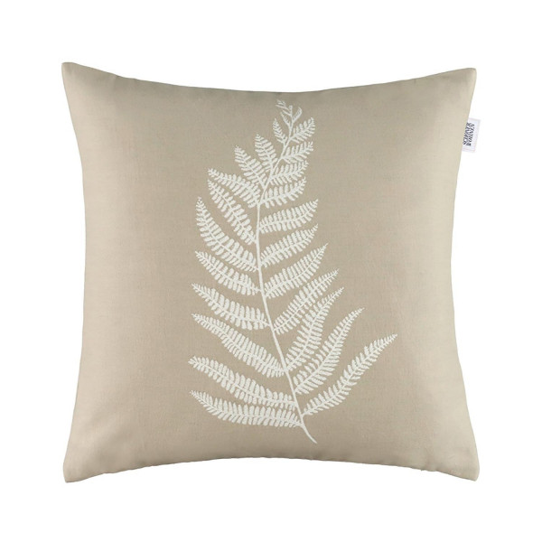 Die Kissenhülle VIVA der Marke Schöner Wohnen besteht aus einer Materialkombination aus Baumwolle und Polyester in Beige. Die Vorderseite ist mit einem Farnmotiv versehen, während die Rückseite einfarbig ohne Motiv gestaltet ist. Durch den Reißverschluss lässt sich die Hülle einfach ab- und aufziehen. Die Maße betragen 45 x 45 cm.