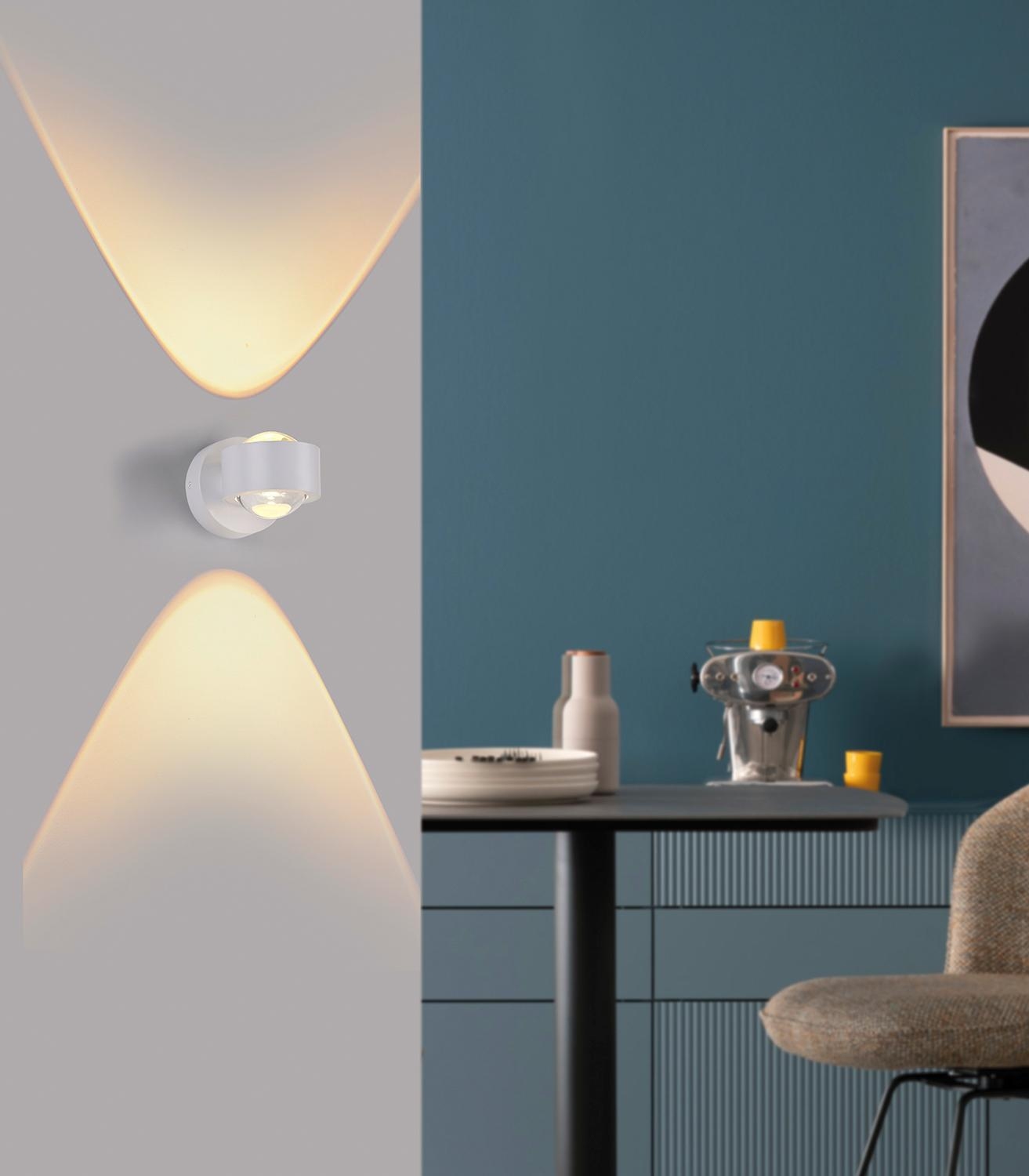 Die LED-Wandleuchte CHIA der Marke Schöner Wohnen besteht aus weiß lackiertem Stahl und ist mit einer Up-Down-Beleuchtung ausgestattet. Sie hat eine Breite von 9 cm, eine Höhe von 9 cm und eine Tiefe von 12,4 cm. Die Leuchte verfügt über zwei fest verbaute LED-Leuchtmittel mit einer Gesamtleistung von 4 Watt. Die Farbtemperatur beträgt 3000 Kelvin, was einem warmweißen Licht entspricht. Der Lichtstrom liegt bei 440 Lumen. Ein Austausch der Leuchtmittel ist nicht möglich, da diese fest integriert sind. Die Leuchte wird inklusive Leuchtmitteln geliefert.