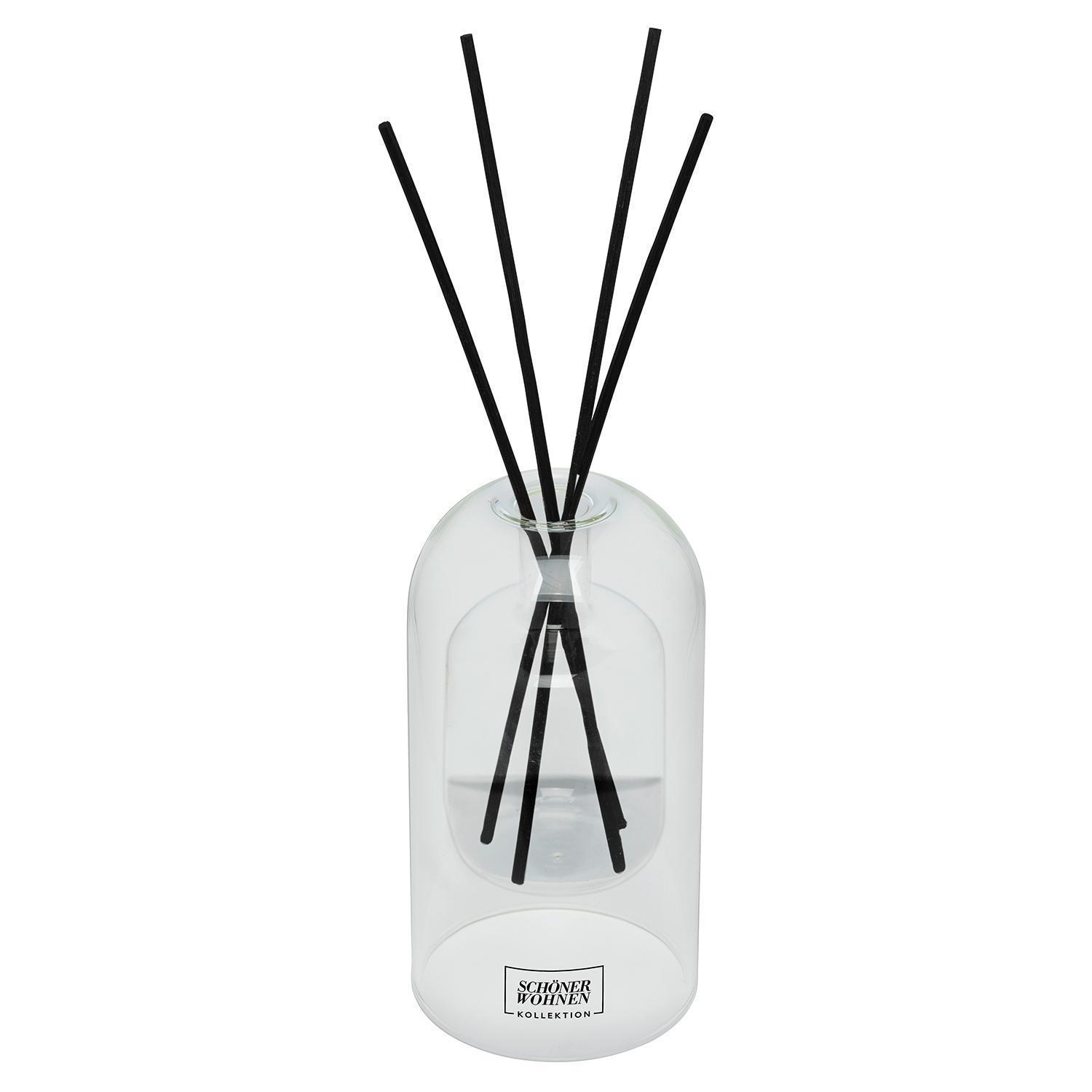 Der stilvolle Design-Glasdiffuser SCHÖNER WOHNEN sorgt für ein angenehmes Dufterlebnis. Das doppelwandige Glas hat einen Durchmesser von 7,5 cm und eine Höhe von 14 cm. Sechs schwarze Stäbchen mit 23 cm Länge verteilen den erfrischenden Duft von Zitronengras und Salbei. Die 130 ml Duftflüssigkeit reicht für ca. 10 Wochen. Ein beiliegender Trichter erleichtert das Einfüllen bzw. das Nachfüllen. Die Intensität kann durch die Anzahl der Stäbchen reguliert werden. Weniger Stäbchen verlängern die Haltbarkeit. Refill und Duftkerzen in S, M und L sind separat erhältlich.
