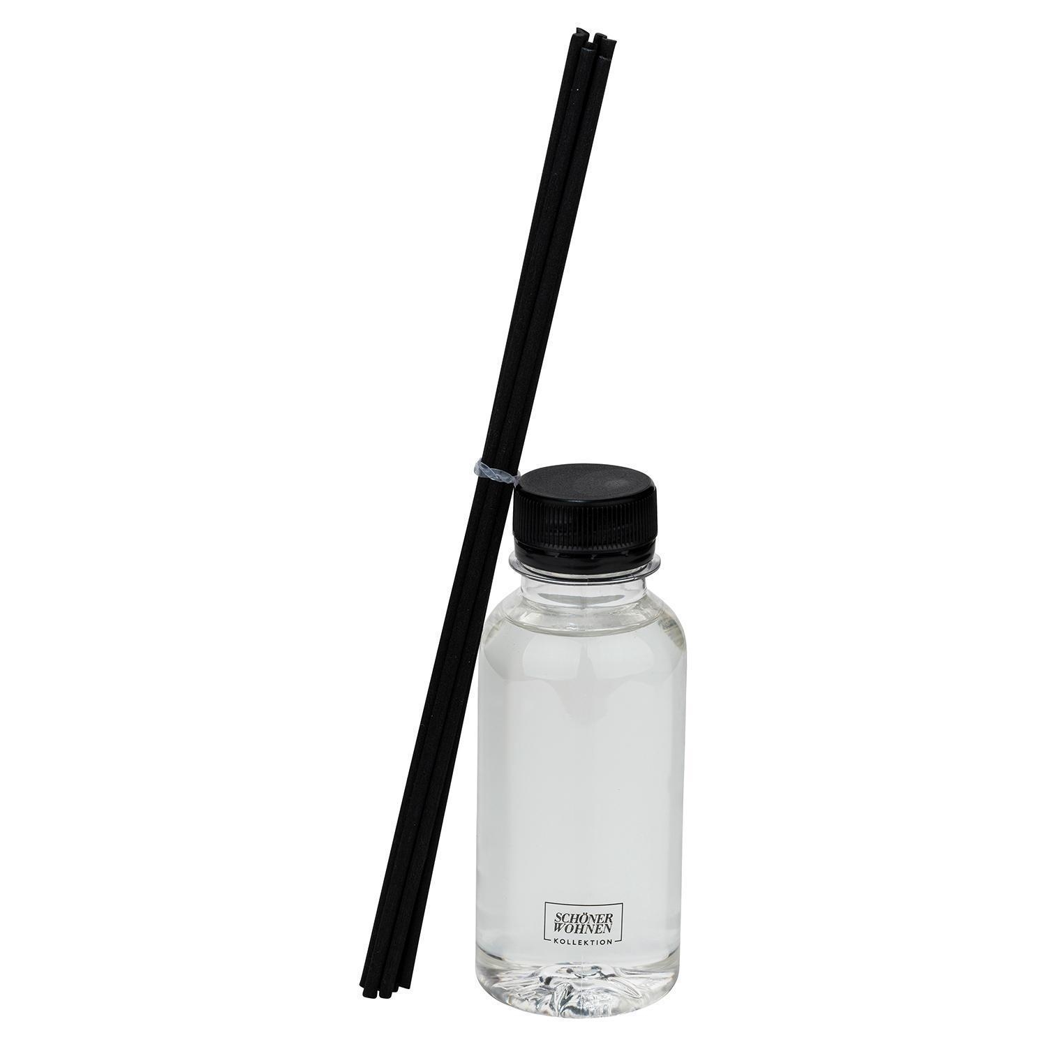 Der stilvolle Design-Glasdiffuser SCHÖNER WOHNEN sorgt für ein angenehmes Dufterlebnis. Das doppelwandige Glas hat einen Durchmesser von 7,5 cm und eine Höhe von 14 cm. Sechs schwarze Stäbchen mit 23 cm Länge verteilen den erfrischenden Duft von Basilikum und Mandarine. Die 130 ml Duftflüssigkeit reicht für ca. 10 Wochen. Ein beiliegender Trichter erleichtert das Einfüllen bzw. das Nachfüllen. Die Intensität kann durch die Anzahl der Stäbchen reguliert werden. Weniger Stäbchen verlängern die Haltbarkeit. Refill und Duftkerzen in S, M und L sind separat erhältlich.