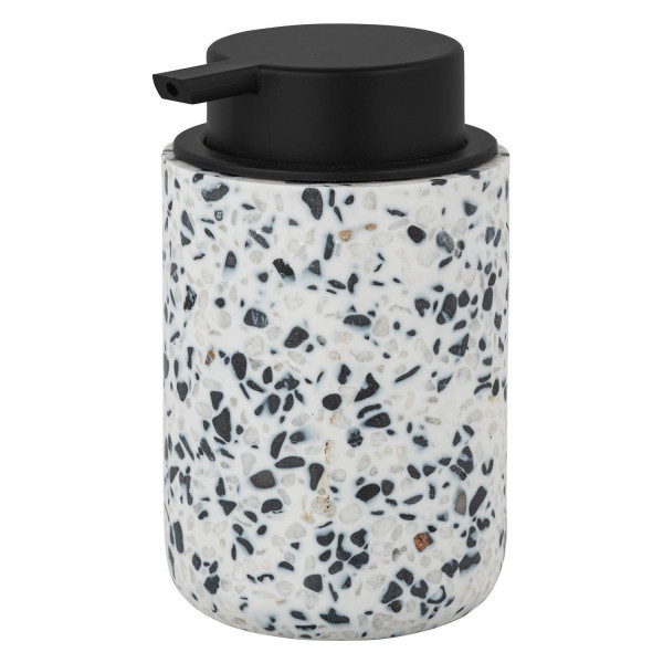 Der Seifenspender TOSI der Marke Schöner Wohnen besteht aus Polyresin in der Farbe Weiß und verfügt über ein Terrazzomuster. Er hat eine Füllmenge von 300 ml. Der Pumpspender ist aus Kunststoff in Schwarz gefertigt. Der Boden ist mit Anti-Rutsch-Noppen ausgestattet. Die Maße des Seifenspenders betragen 10 cm in der Breite, 13 cm in der Höhe und 8 cm in der Tiefe.