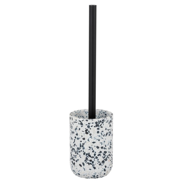 Die WC-Garnitur TOSI der Marke Schöner Wohnen besteht aus Polyresin in den Farben Schwarz und Weiß. Die Bürstenhalterung ist mit einem Terrazzomuster versehen. Der Bürstenkopf besteht aus Kunststoff, während der Bürstenstiel aus Edelstahl gefertigt ist. Die Garnitur hat einen Durchmesser von 9,5 cm und eine Höhe von 36,5 cm.