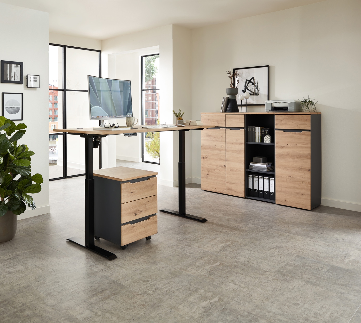 Mithilfe eines Elektromotors und eines Handschalters lässt sich die Tischhöhe geräuscharm zwischen H 72 und H 120 cm einstellen. Zudem verfügt der Schreibtisch über eine digitale Höhenanzeige.
