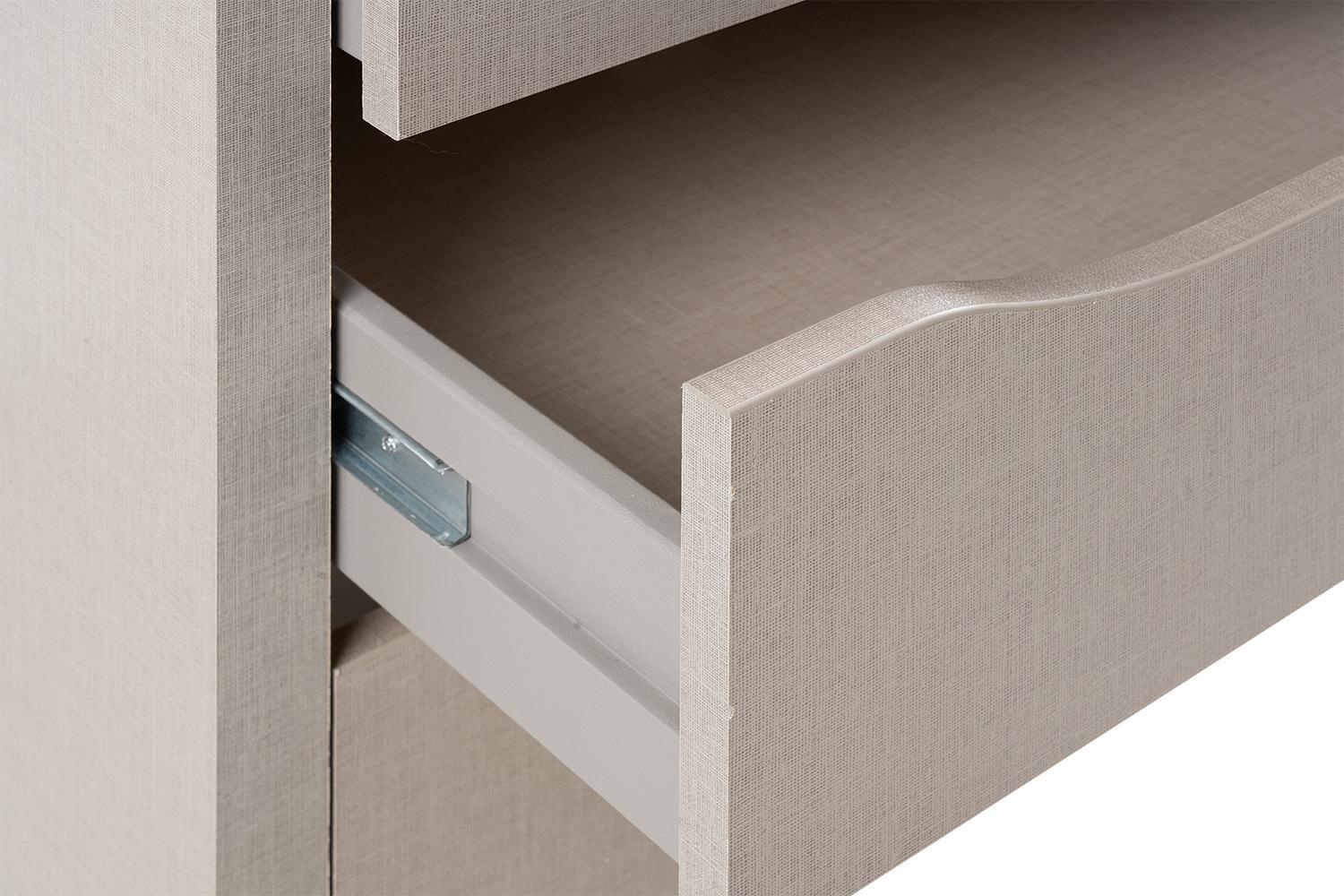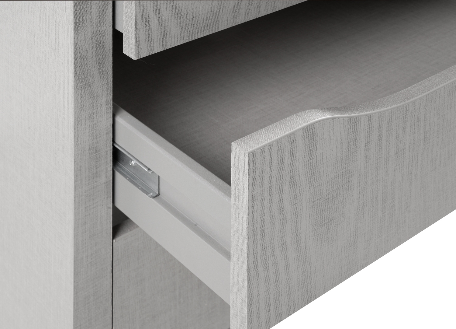 Die Oberfläche ist mit Texline Dekor in der Farbe grau überzogen. Dieses Material verleiht eine textilähnliche Optik und auch die Struktur erinnert an Stoff.