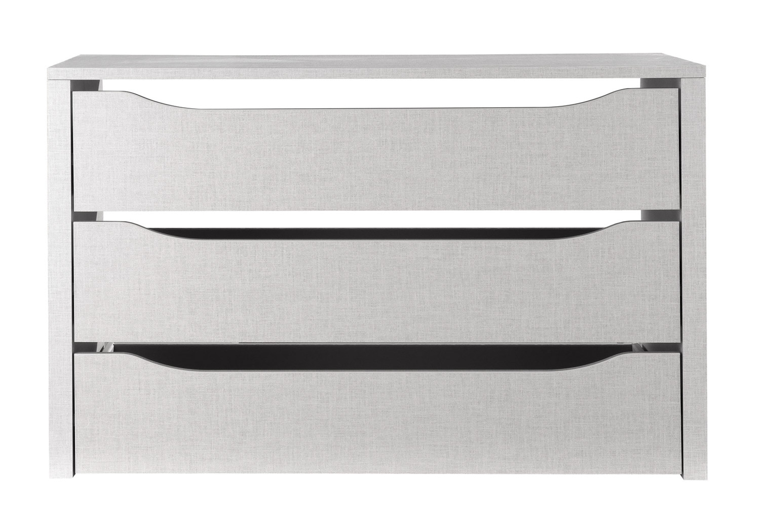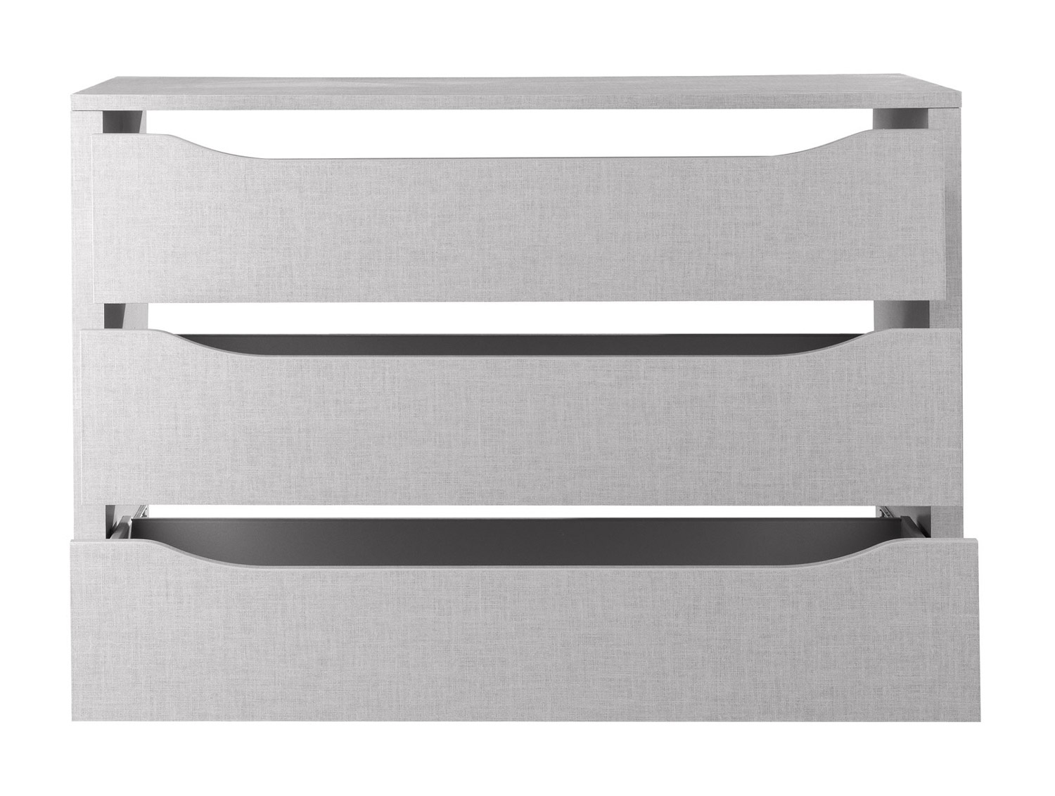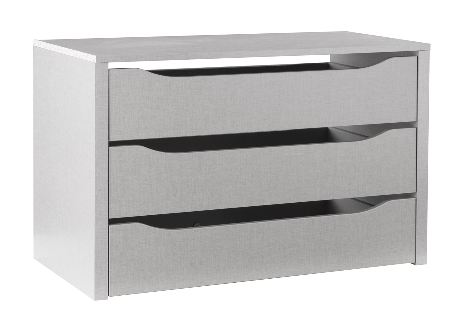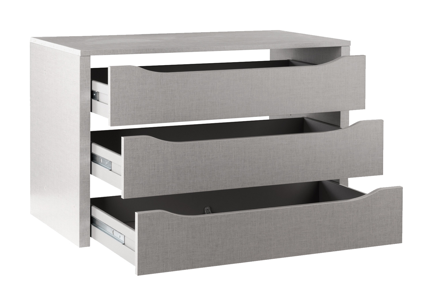 Der Schubkasteneinsatz ZOE benötigt in einigen Kleiderschränken eine Befestingung an den Seiten- und Rückwänden des Schrankes, das ist abhängig vom jeweiligen Kleiderschrank. Der Schubkasteneinsatz ist mit einer textilähnlichen Optik in einem Texline Dekor in der Farbe grau gehalten und bietet mit einer Breite von 88 cm, einer Höhe von 57 cm und einer Tiefe von 45 cm ausreichend Platz für die Aufbewahrung verschiedener Gegenstände. Hergestellt aus Holzwerkstoff (Spanplatte), fügt sich der Einsatz stilvoll in jeden Kleiderschrank ein. Er kommt mit drei Schubladen, die zusätzlichen Stauraum bieten. Der Lieferzustand ist platzsparend flach verpackt, und das Produkt wird in Deutschland hergestellt.