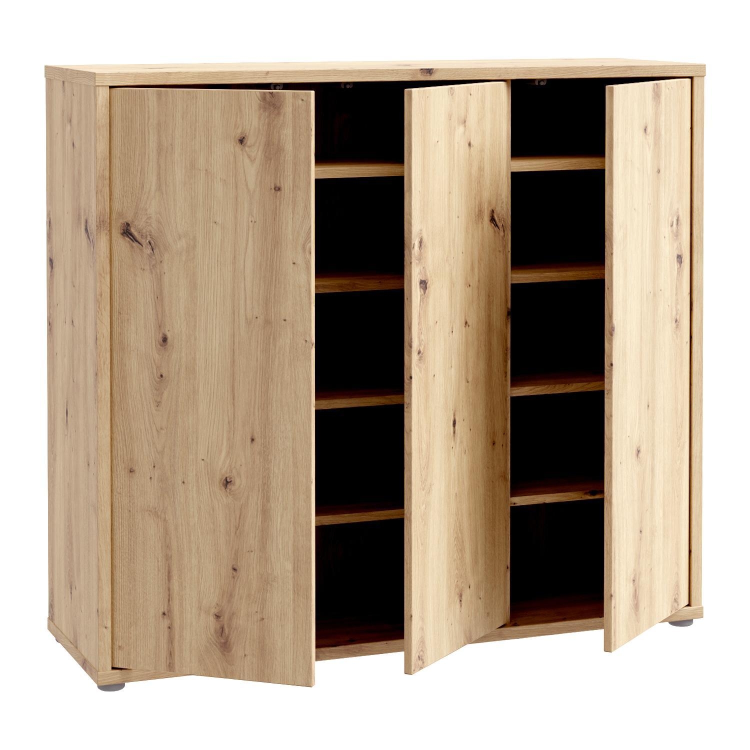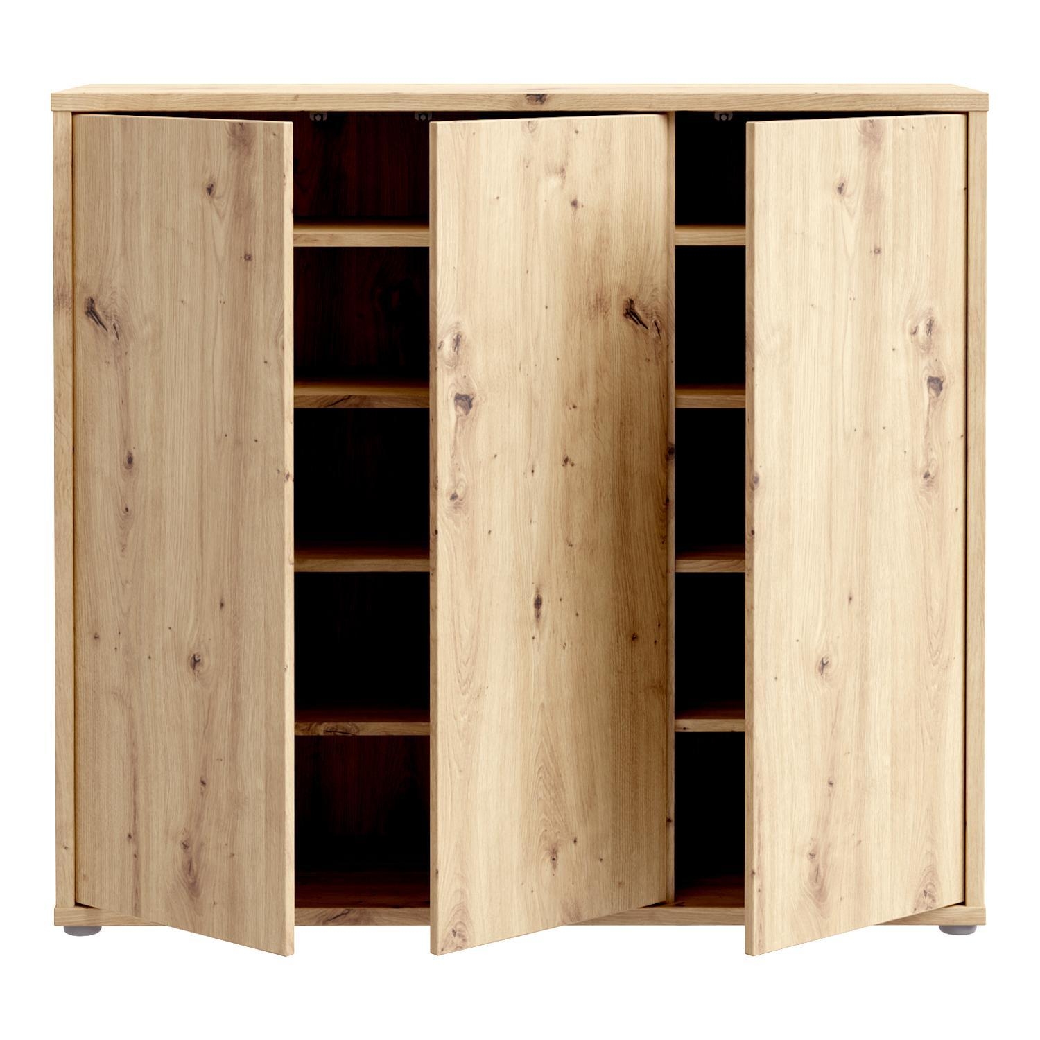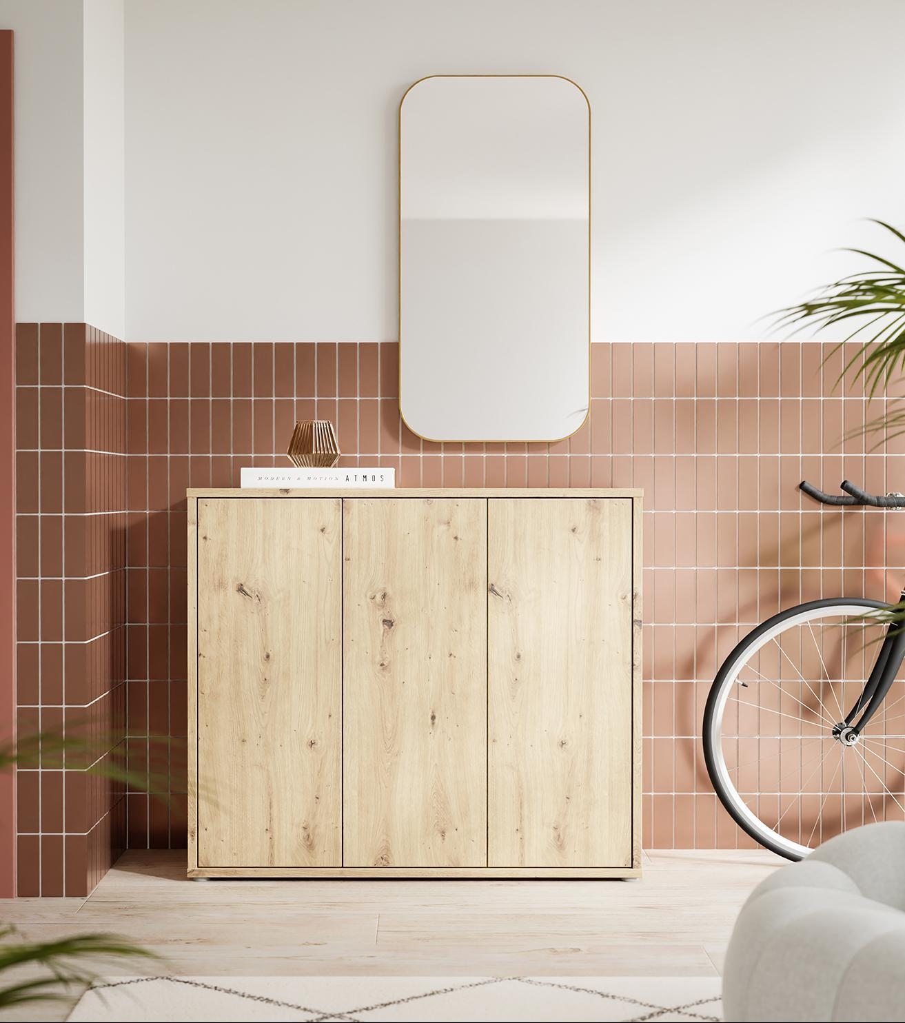 Der Schuhschrank AIDEN ist in einem ansprechenden Artisan Eiche Dekor gefertigt. Er verfügt über drei Türen, die sich dank der integrierten Push-to-Open-Funktion grifflos öffnen lassen. Im Inneren befinden sich avht Einlegeböden, die eine strukturierte und platzsparende Aufbewahrung von Schuhen ermöglichen. Der Schrank hat eine Breite von 109 cm, eine Höhe von 99 cm und eine Tiefe von 35 cm.