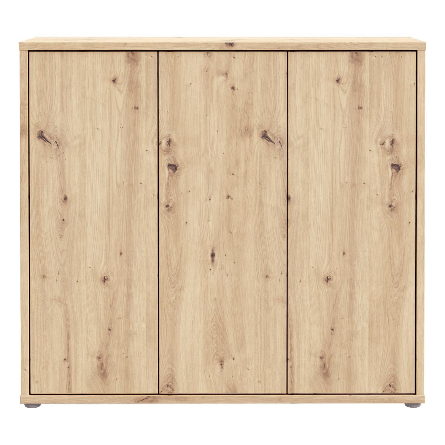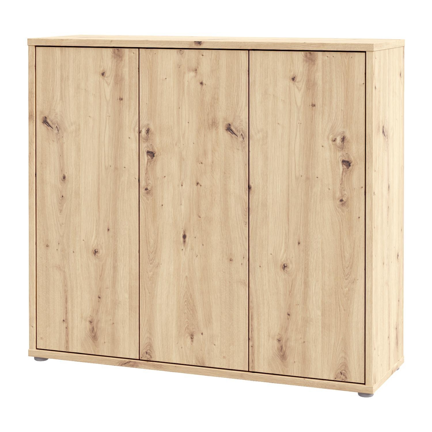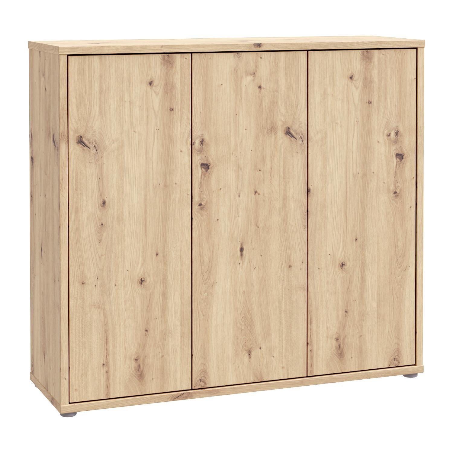 Der Schuhschrank AIDEN ist in einem ansprechenden Artisan Eiche Dekor gefertigt. Er verfügt über drei Türen, die sich dank der integrierten Push-to-Open-Funktion grifflos öffnen lassen. Im Inneren befinden sich avht Einlegeböden, die eine strukturierte und platzsparende Aufbewahrung von Schuhen ermöglichen. Der Schrank hat eine Breite von 109 cm, eine Höhe von 99 cm und eine Tiefe von 35 cm.