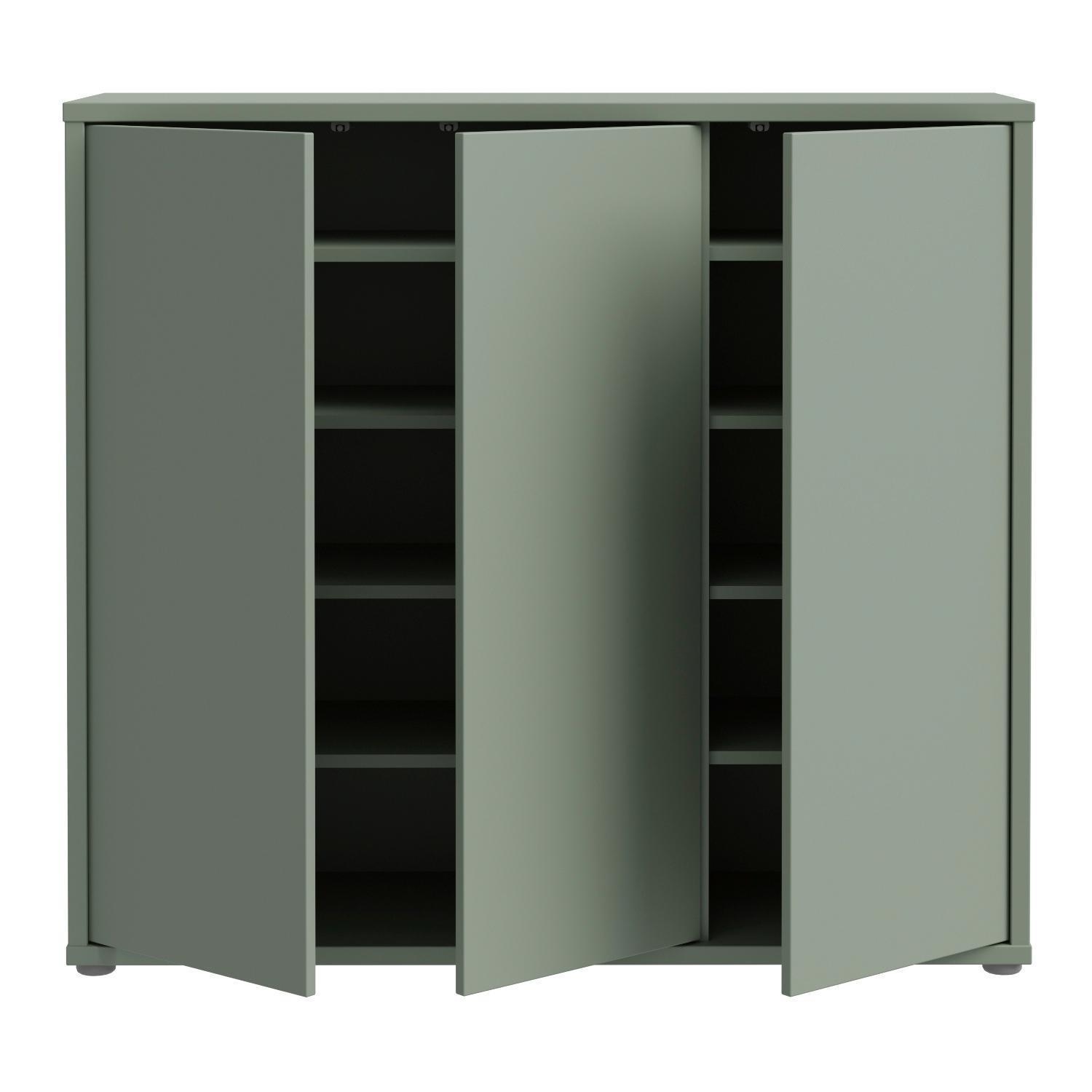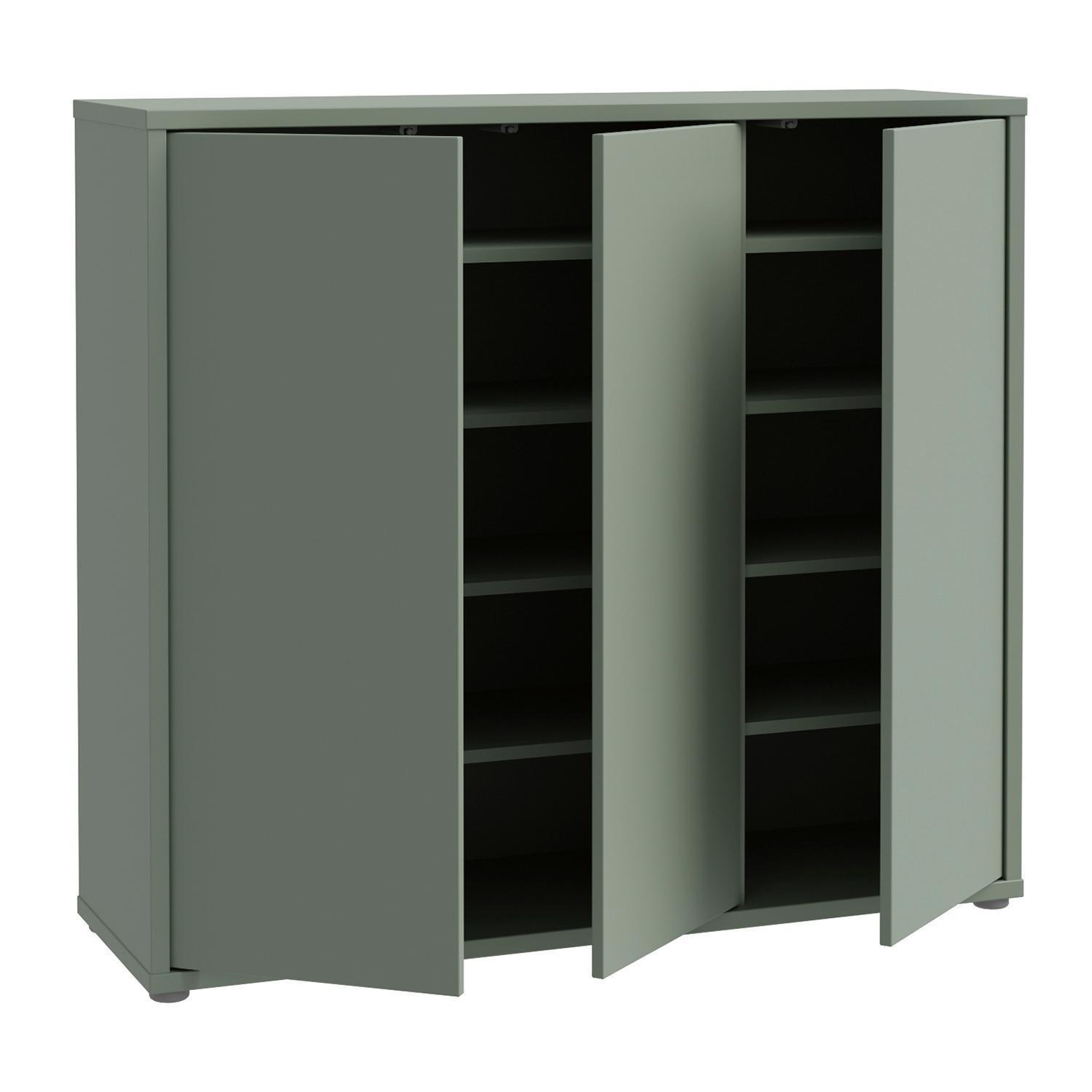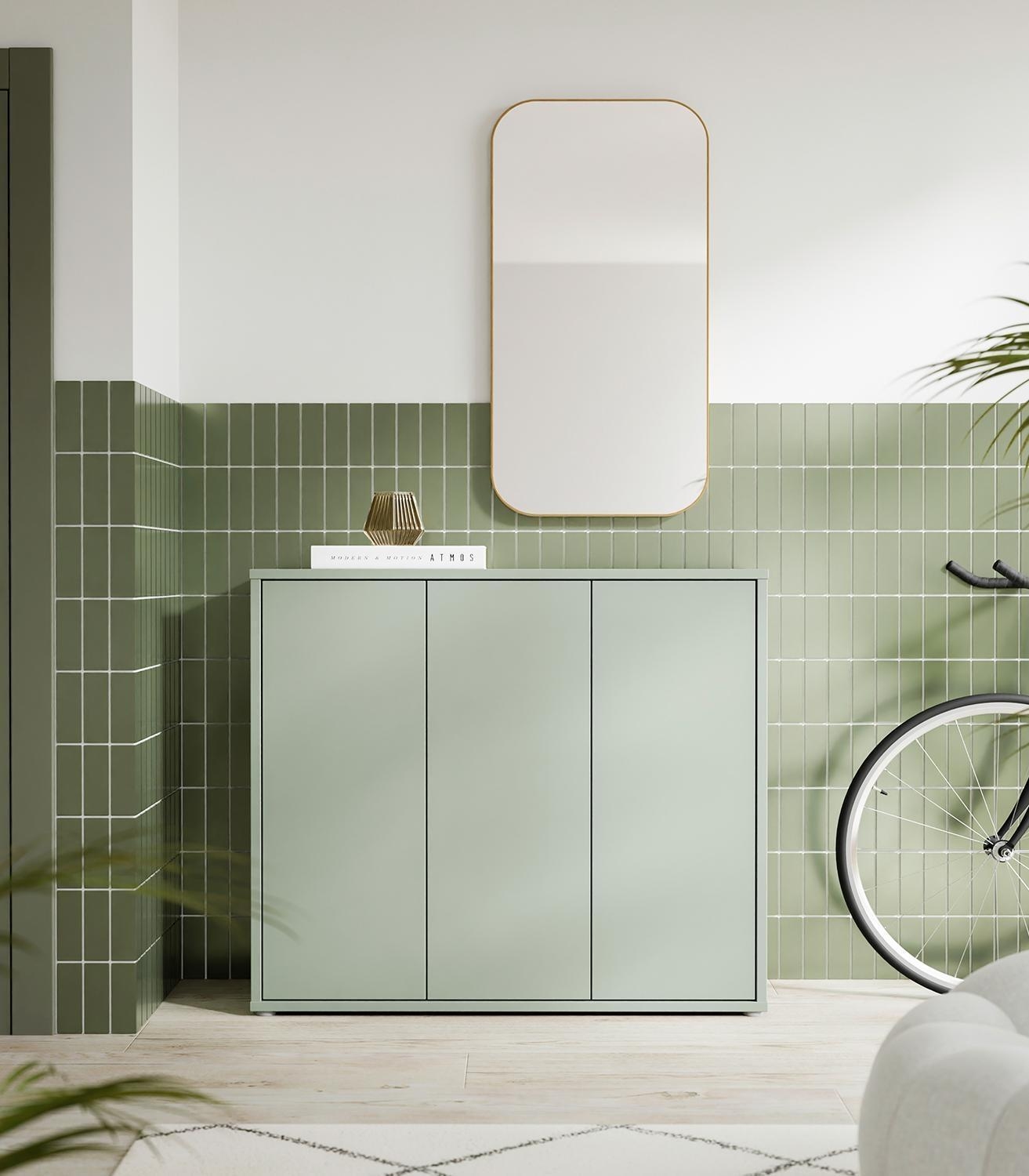 Der Schuhschrank AIDEN ist in einem ansprechenden Salbeigrün gefertigt. Er verfügt über drei Türen, die sich dank der integrierten Push-to-Open-Funktion grifflos öffnen lassen. Im Inneren befinden sich acht Einlegeböden, die eine strukturierte und platzsparende Aufbewahrung von Schuhen ermöglichen. Der Schrank hat eine Breite von 109 cm, eine Höhe von 99 cm und eine Tiefe von 35 cm.