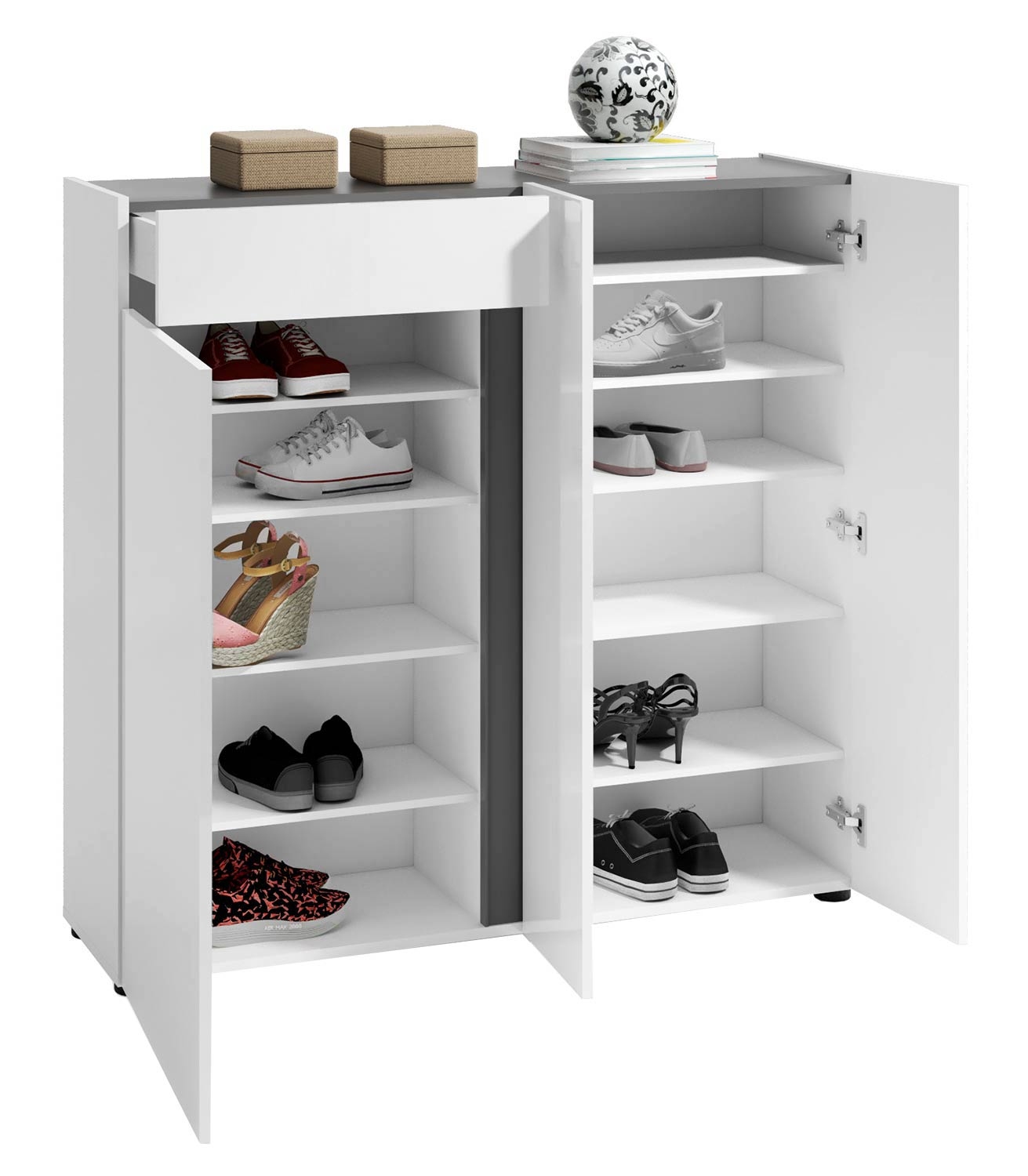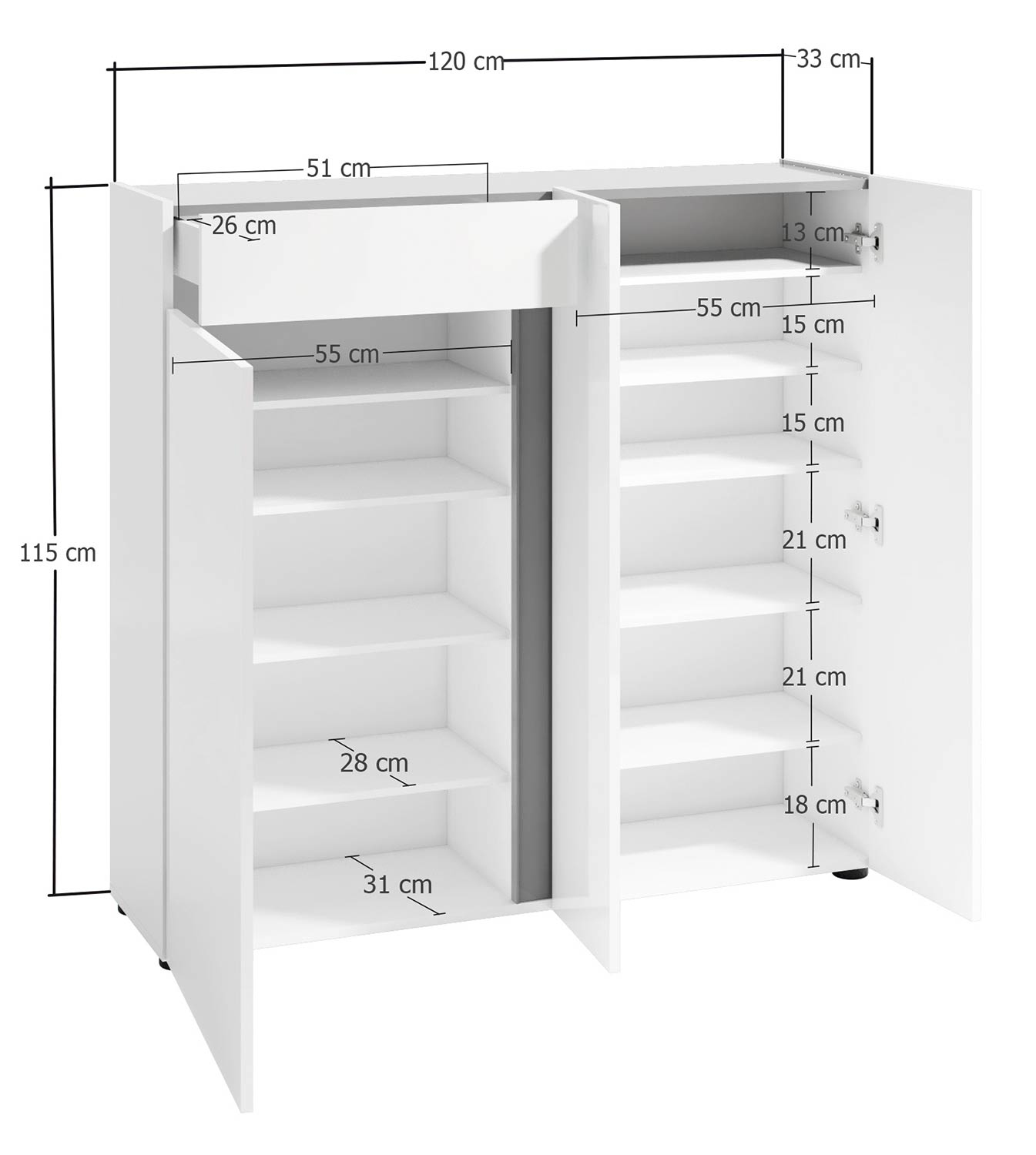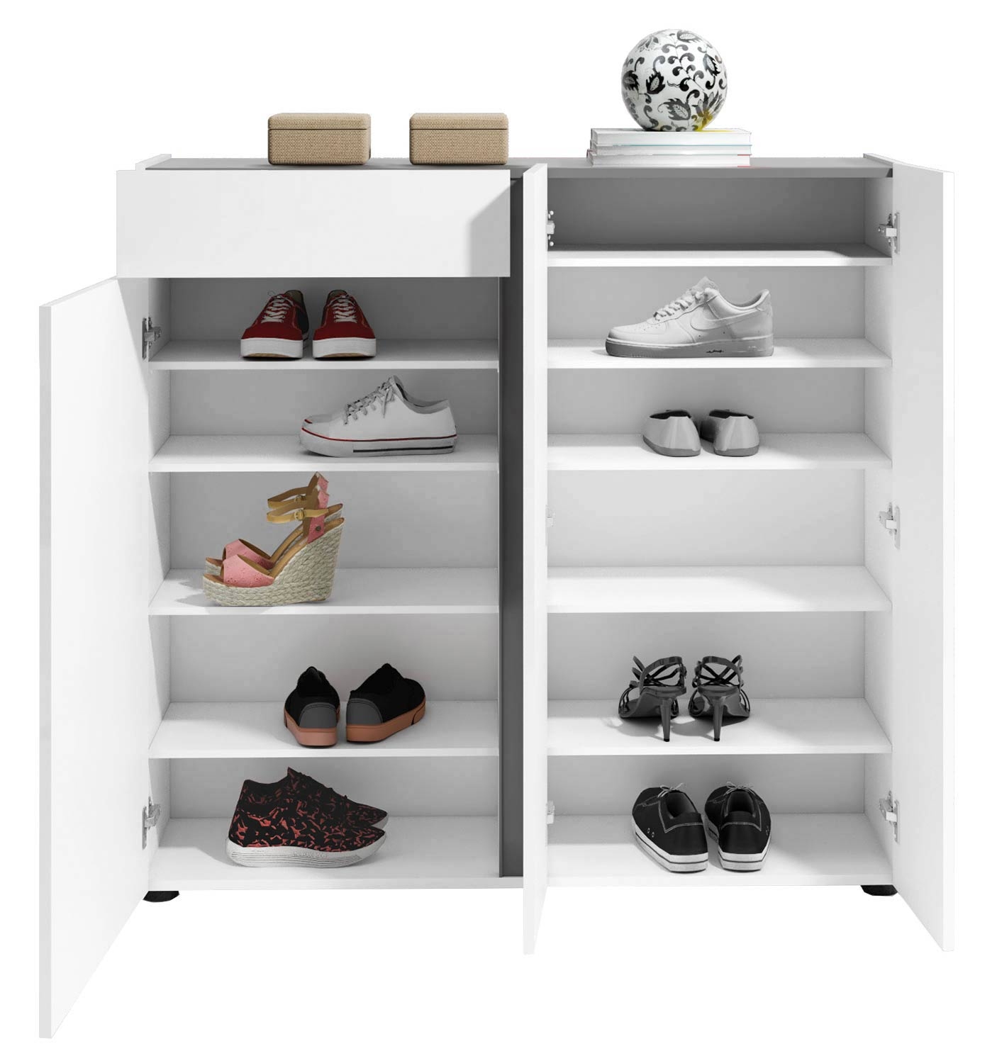 | Lieferumfang: | 1 Schuhschrank mit 3 Türen, 1 Schublade und 9 breiten Einlegeböden |