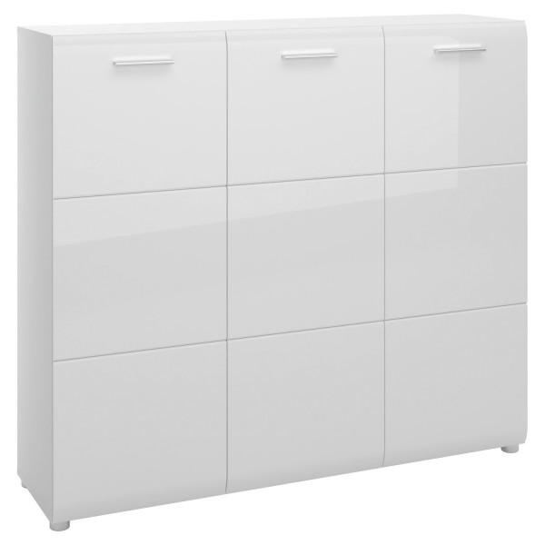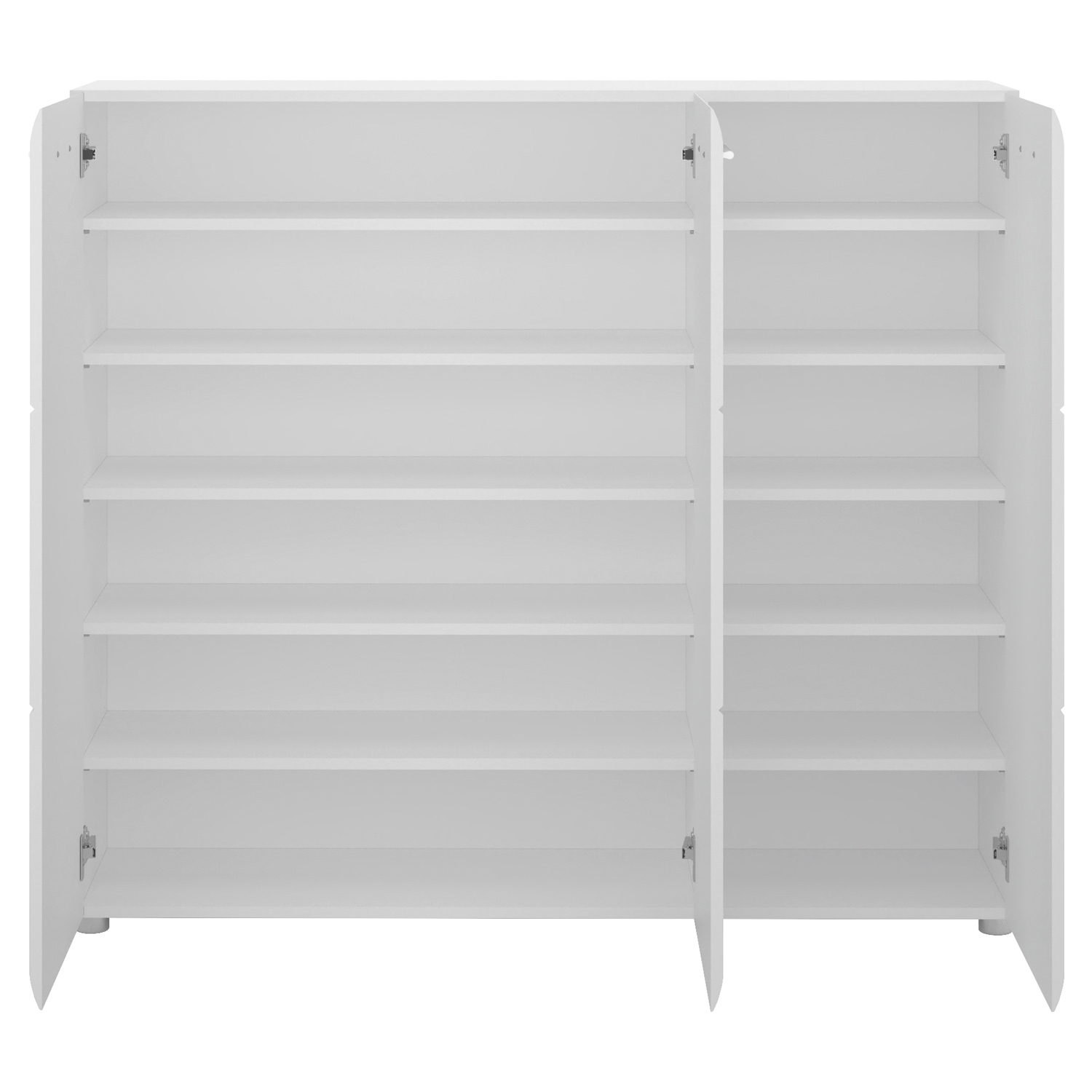 Der Schuhschrank MARLIES präsentiert sich in strahlendem Weiß Hochglanz und bietet mit seinen 3 Türen und 10 dreifach höhenverstellbaren Einlegeböden eine großzügige Aufbewahrungslösung. Er fasst bis zu 36 Paar Schuhe und bringt Ordnung in Ihren Eingangsbereich oder Flur. Mit einer Breite von 135 cm, einer Höhe von 120 cm und einer Tiefe von 36 cm passt er auch in schmalere Räume. Hergestellt aus strapazierfähigem Holzwerkstoff, verspricht er Stabilität und Langlebigkeit.