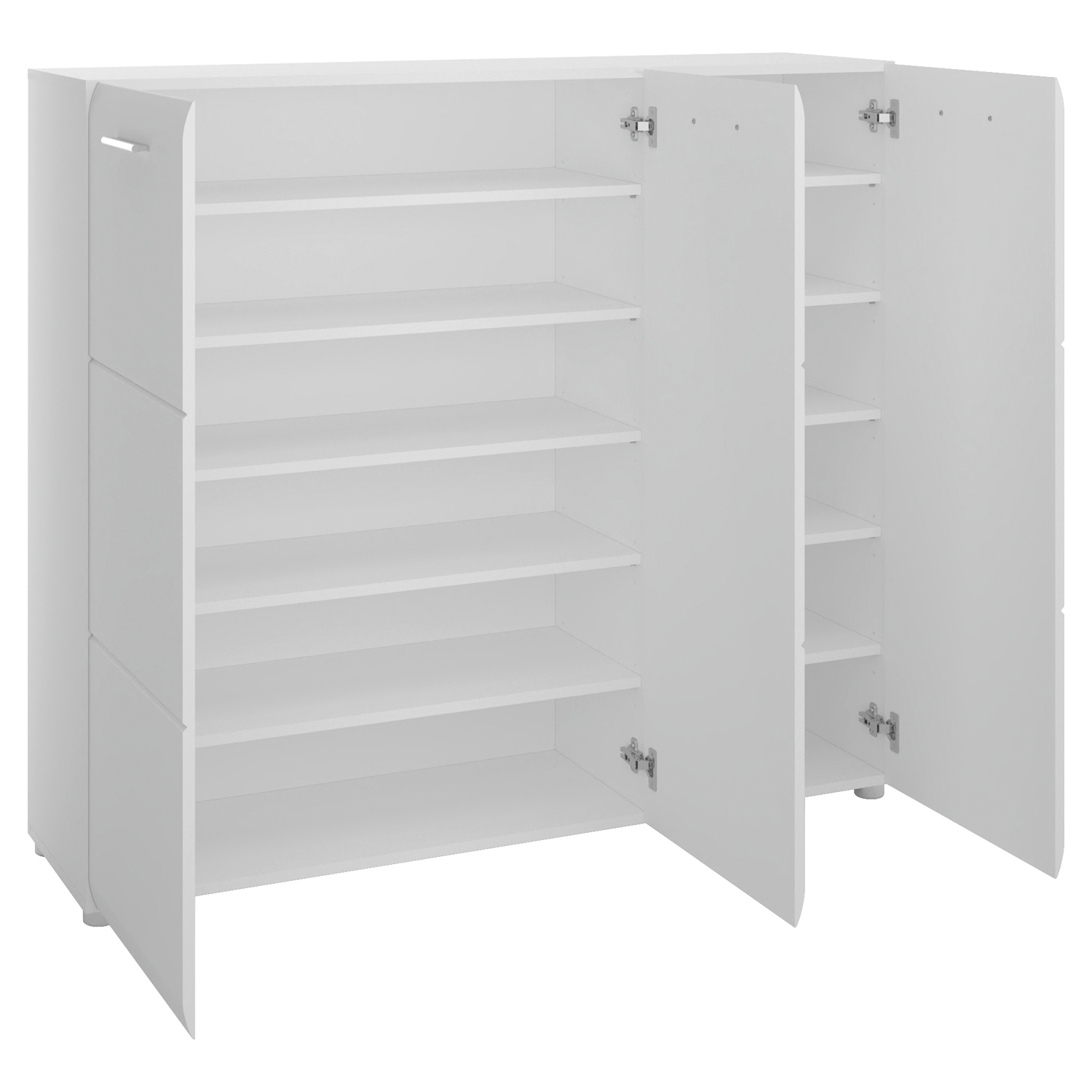 | Lieferumfang: | 1 Schuhschrank mit 3 Türen und 10 dreifach höhenverstellbaren Einlegeböden |
