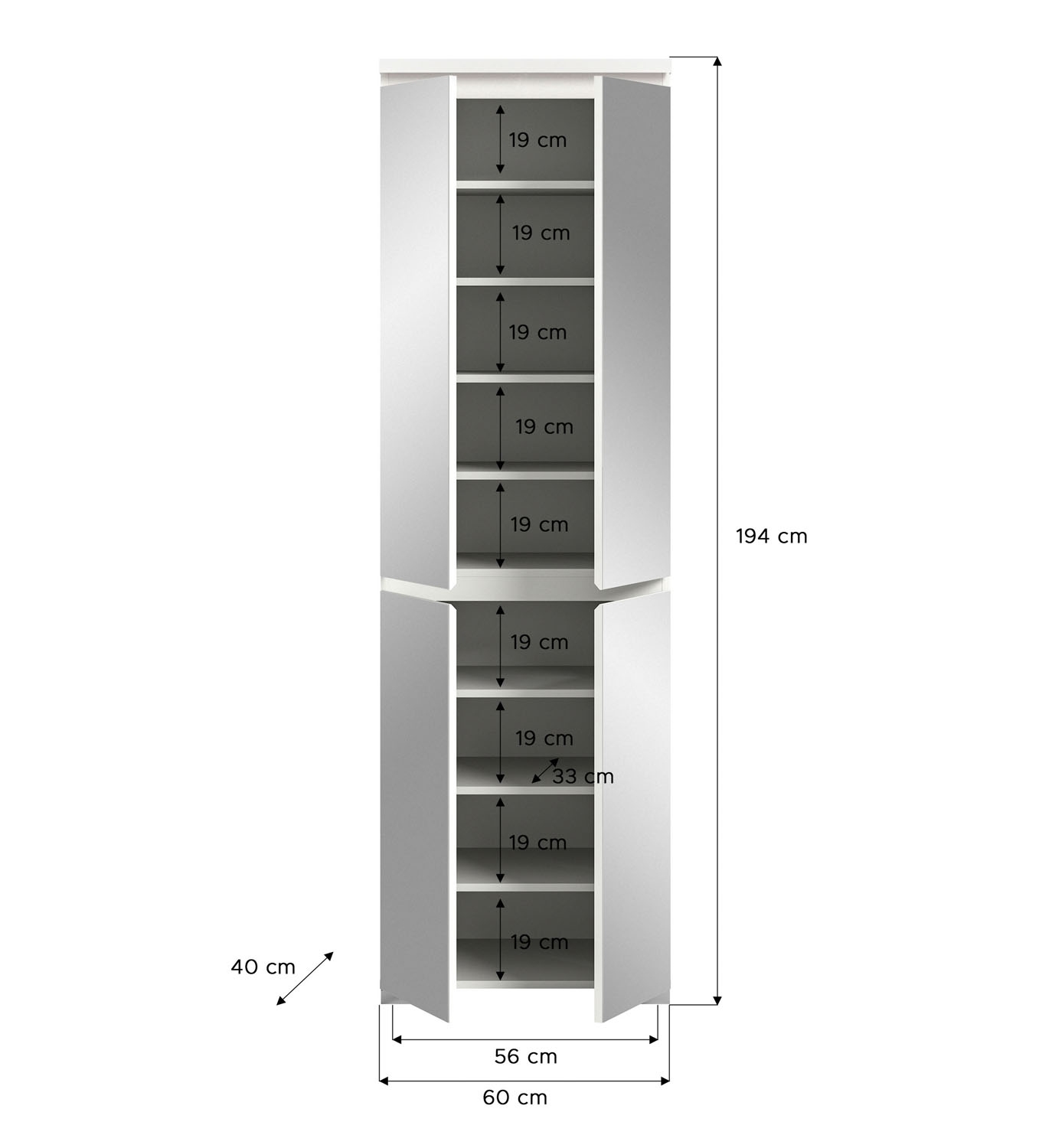 | Lieferumfang: | 1 Schuhschrank mit Spiegeltüren und 7 höhenverstellbaren Einlegeböden |