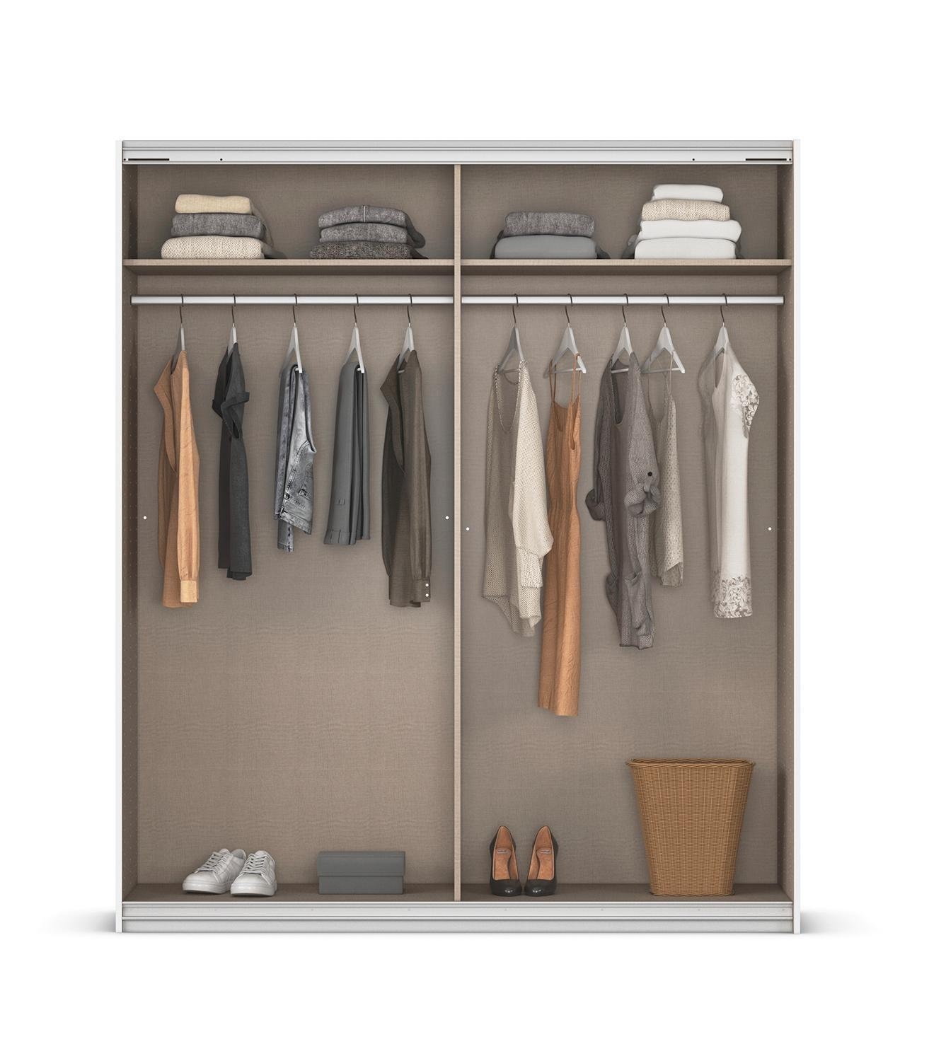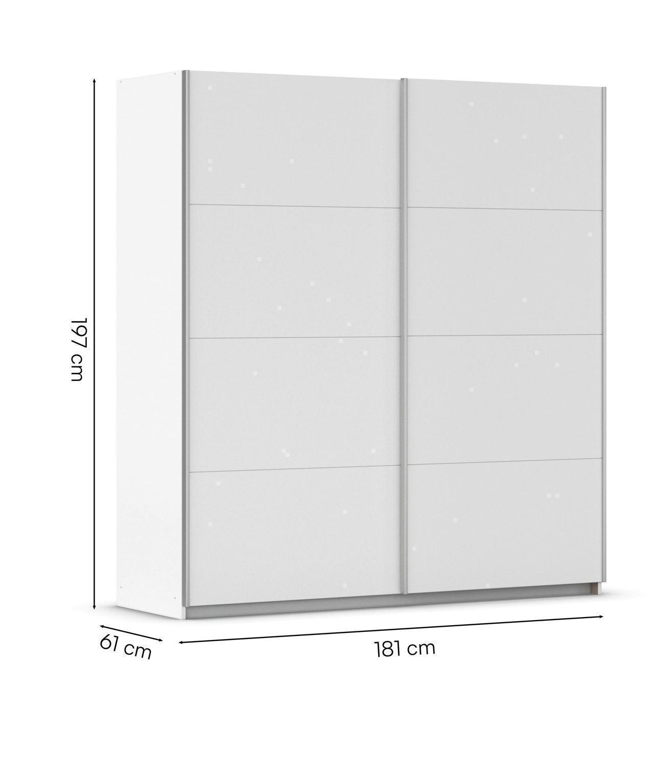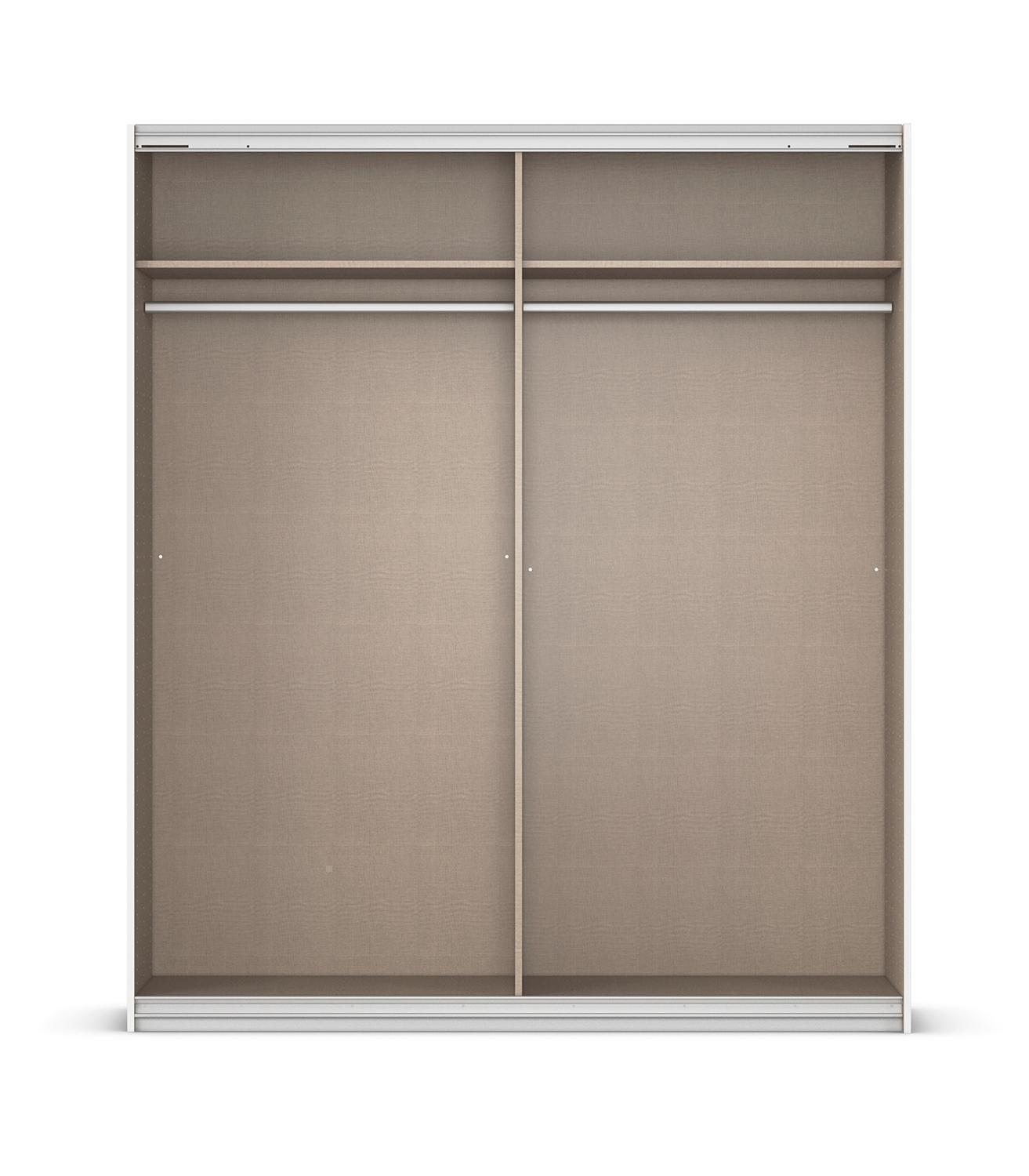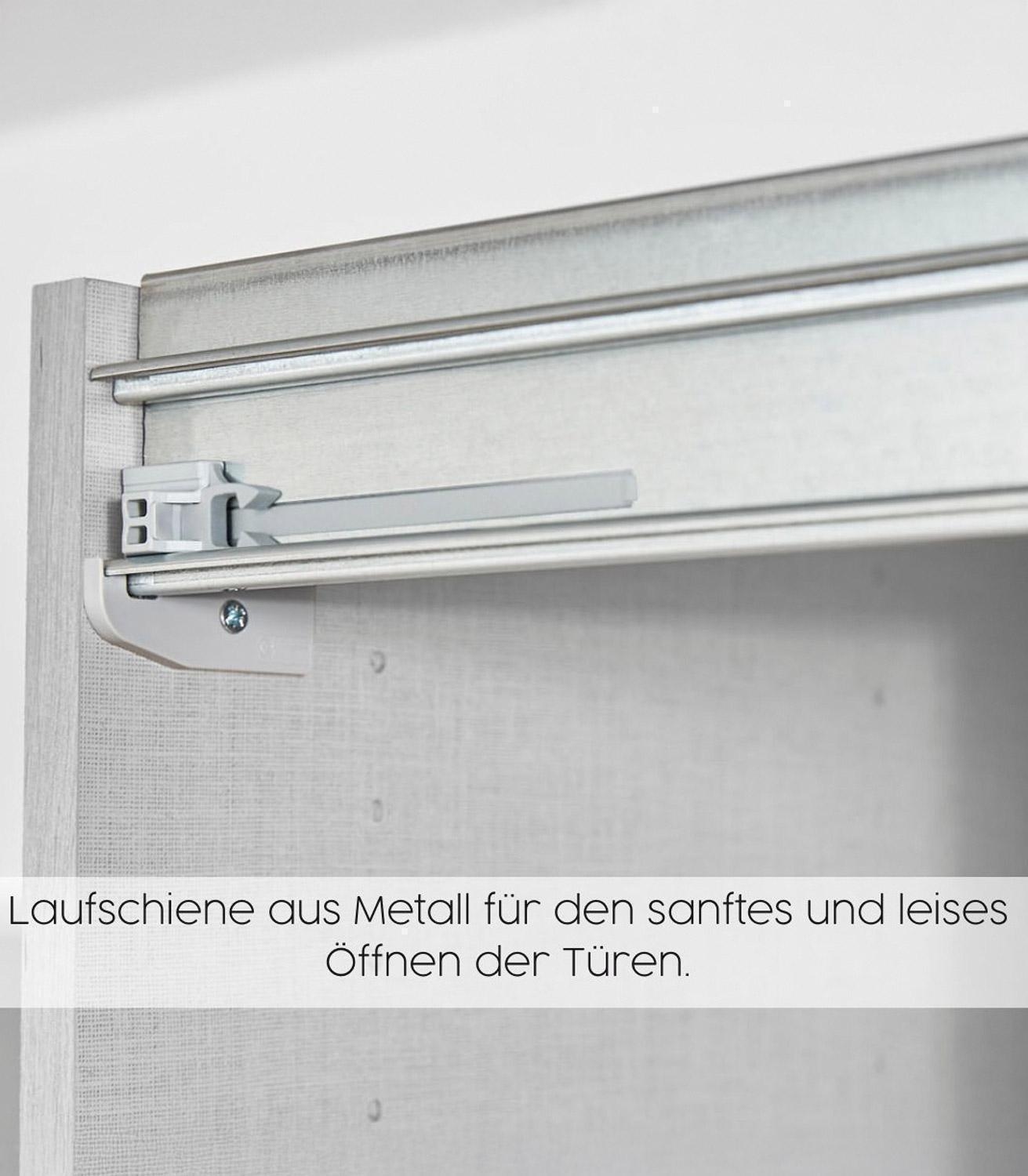 | Lieferumfang: | 1 Schwebetürenschrank mit 2 Türen, 2 Einlegeböden und 2 Kleiderstangen |