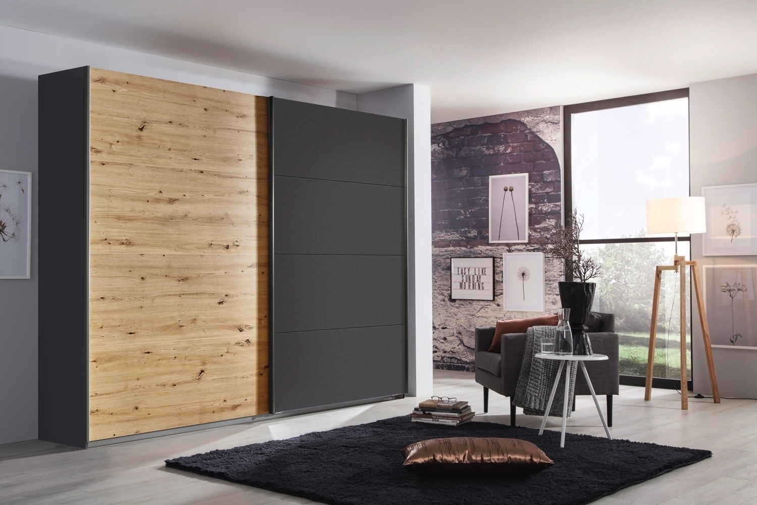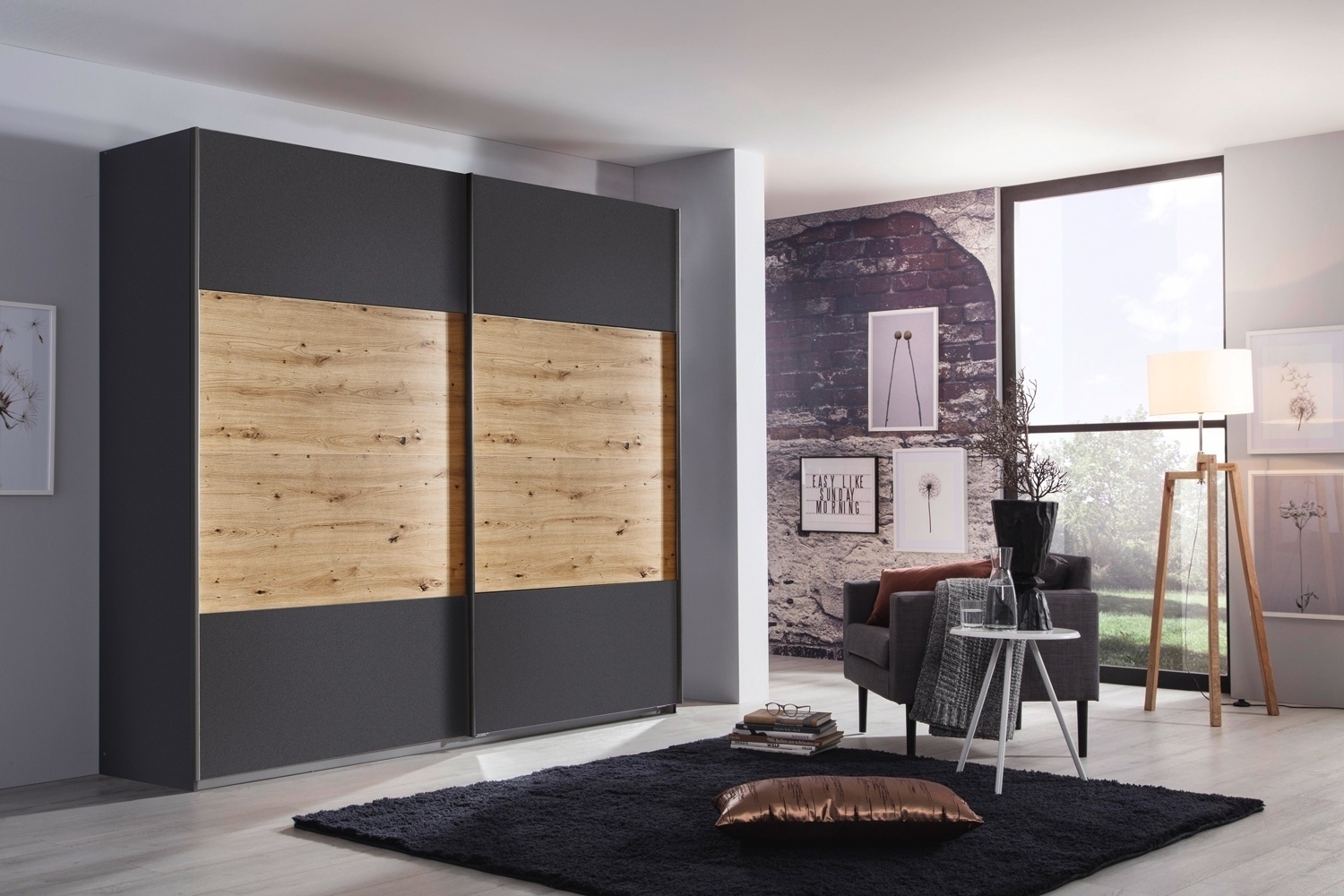 Dieser Kleiderschrank hat im Inneren die Farbe grau. Zu einigen Kleiderschränken bieten wir Zubehör wie Schubkästeneinsätze, Wäscheeinteilungen, zusätzliche Fachböden und Türdämpfer an.