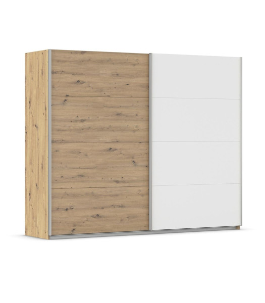 Der Schwebetürenschrank JAMIE ist in Artisan Eiche Dekor ausgeführt und verfügt über Teilfronten in Alpinweiß sowie Artisan Eiche Dekor. Er ist mit zwei Schwebetüren ausgestattet. Die Innenausstattung umfasst drei Kleiderstangen und drei Einlegeböden. Der Schrank wird in Deutschland gefertigt. Die Abmessungen betragen 226 cm in der Breite, 210 cm in der Höhe und 62 cm in der Tiefe.