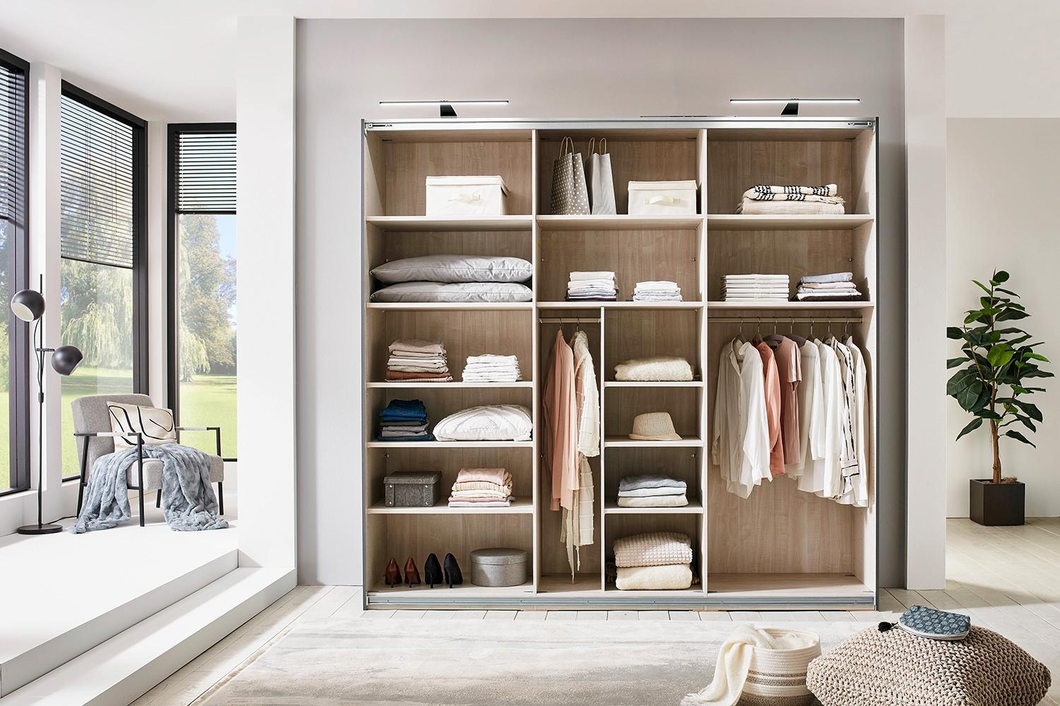 | Lieferumfang: | 1 Schwebetürenschrank mit 3 Türen, 3 Kleiderstangen und 12 Einlegeböden. Die LED-Beleuchtungen sind nicht enthalten |